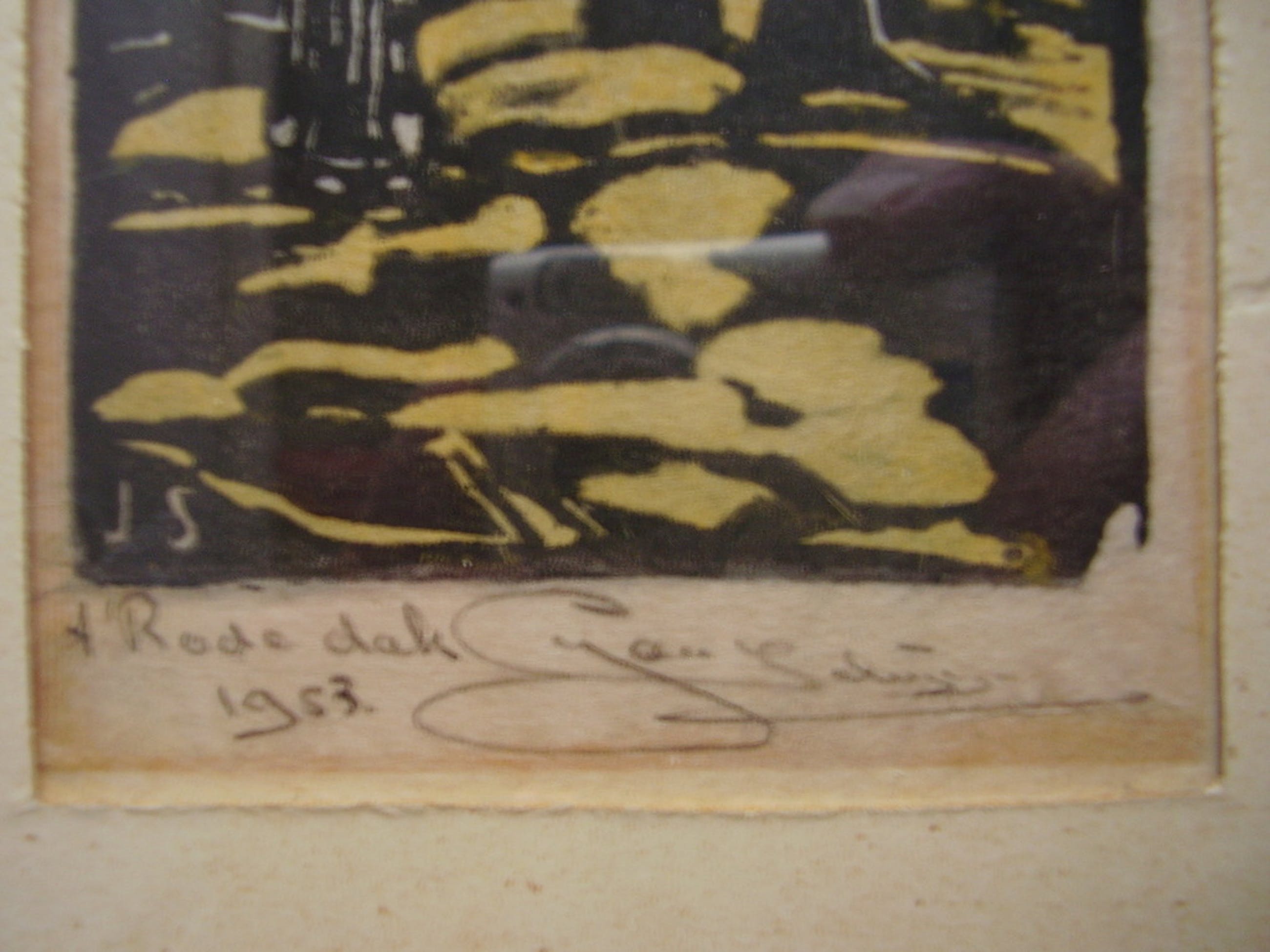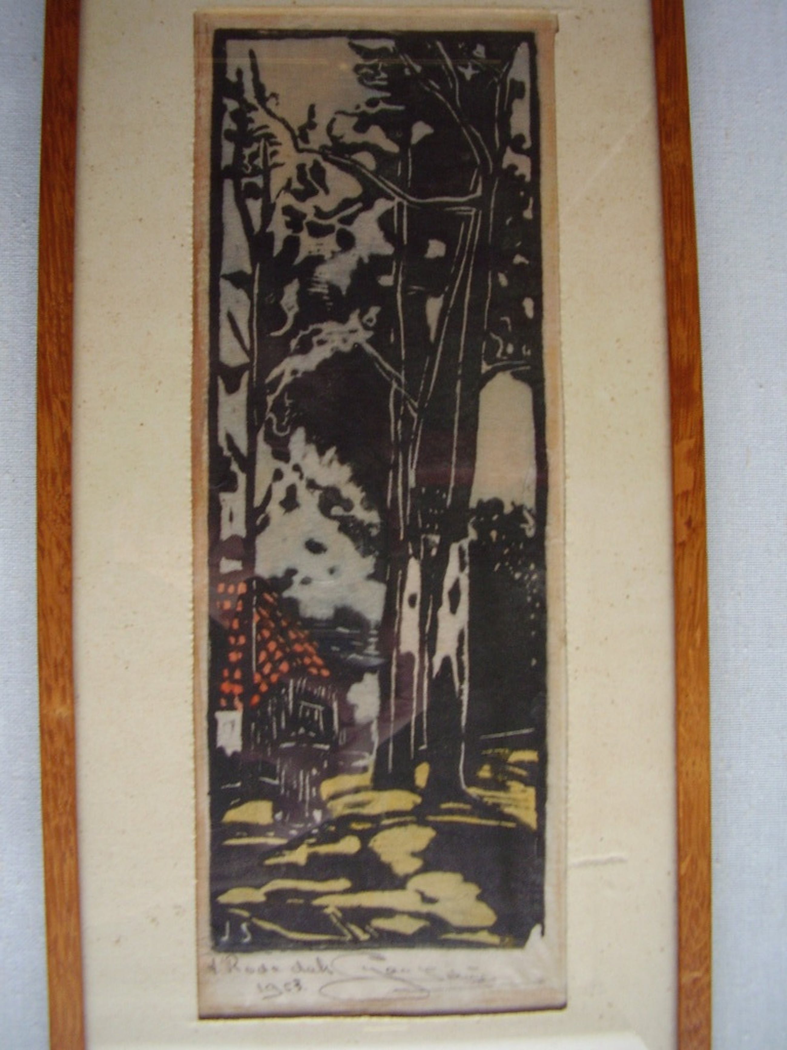Houtsnede is in goede staat, papier enigszins bobbelig, niet beoordeeld buiten de lijst.