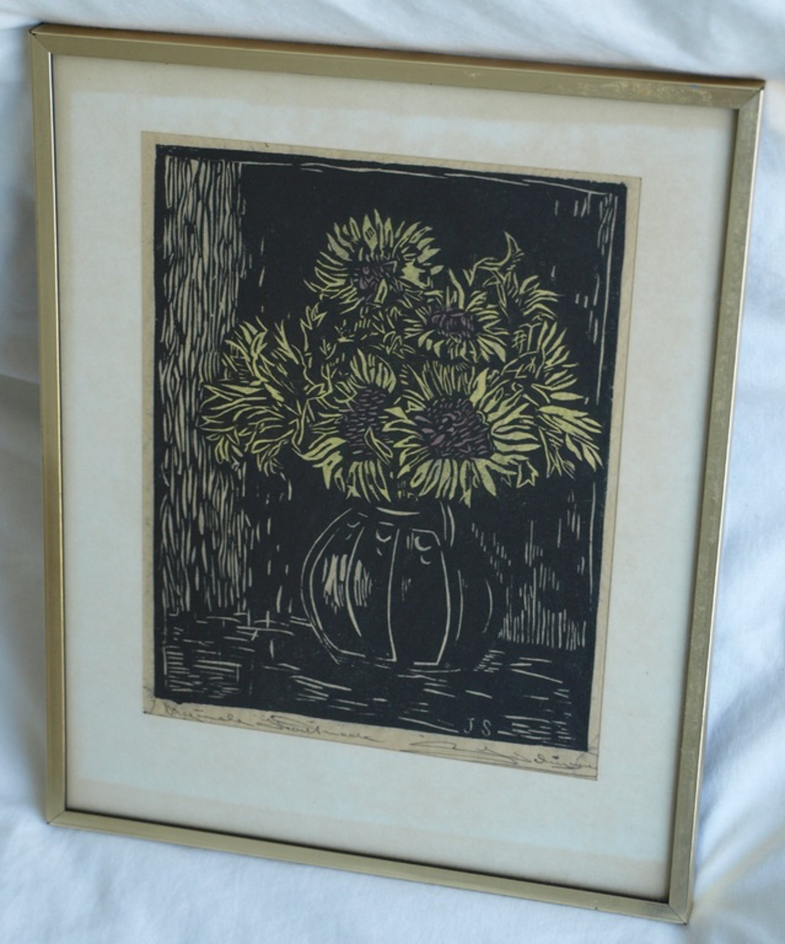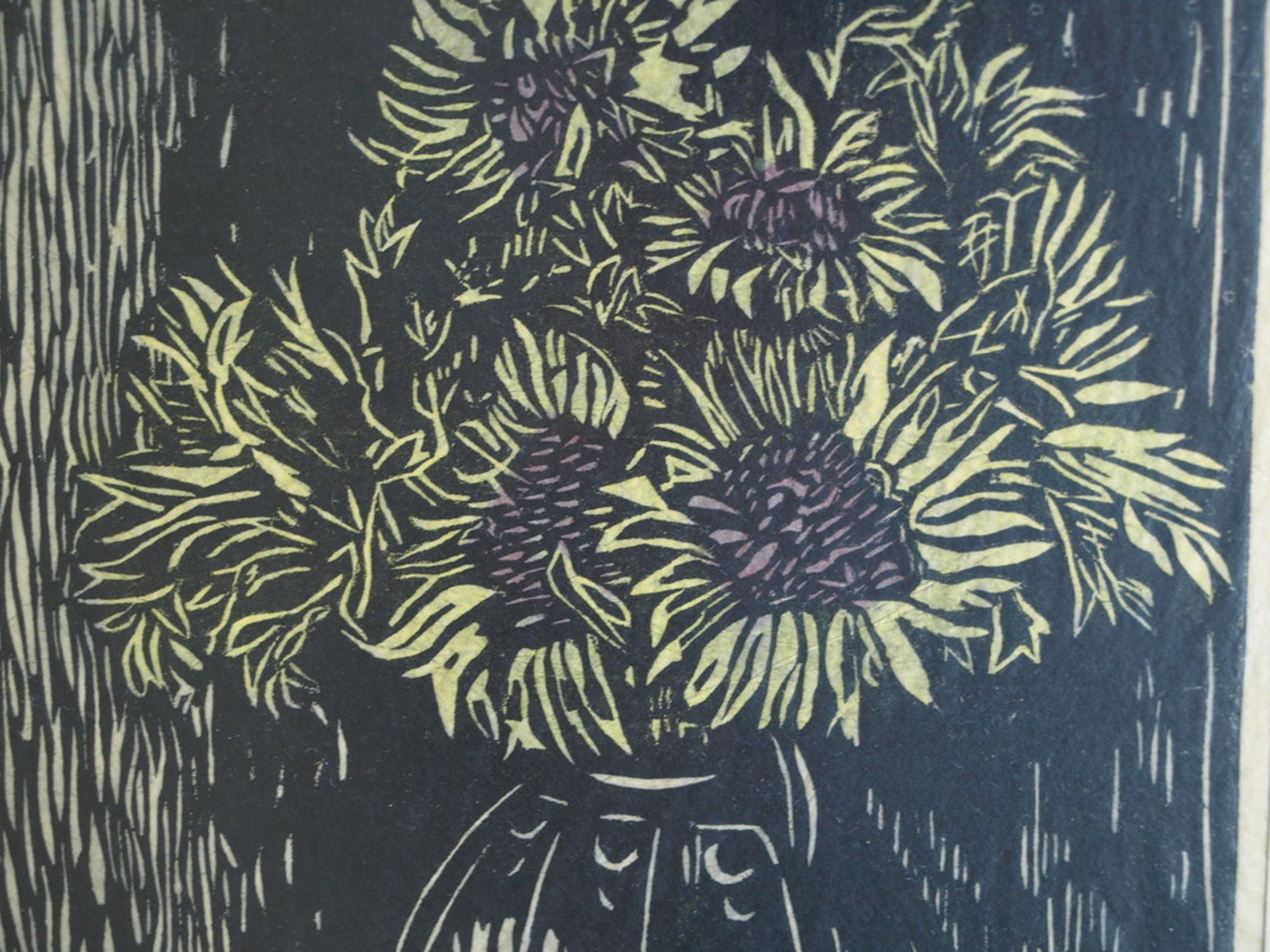 Een ingekleurde houtsnede van de Limburgse kunstenaar Jan Schrijvers (1946) met een voorstelling van een bloemstilleven.