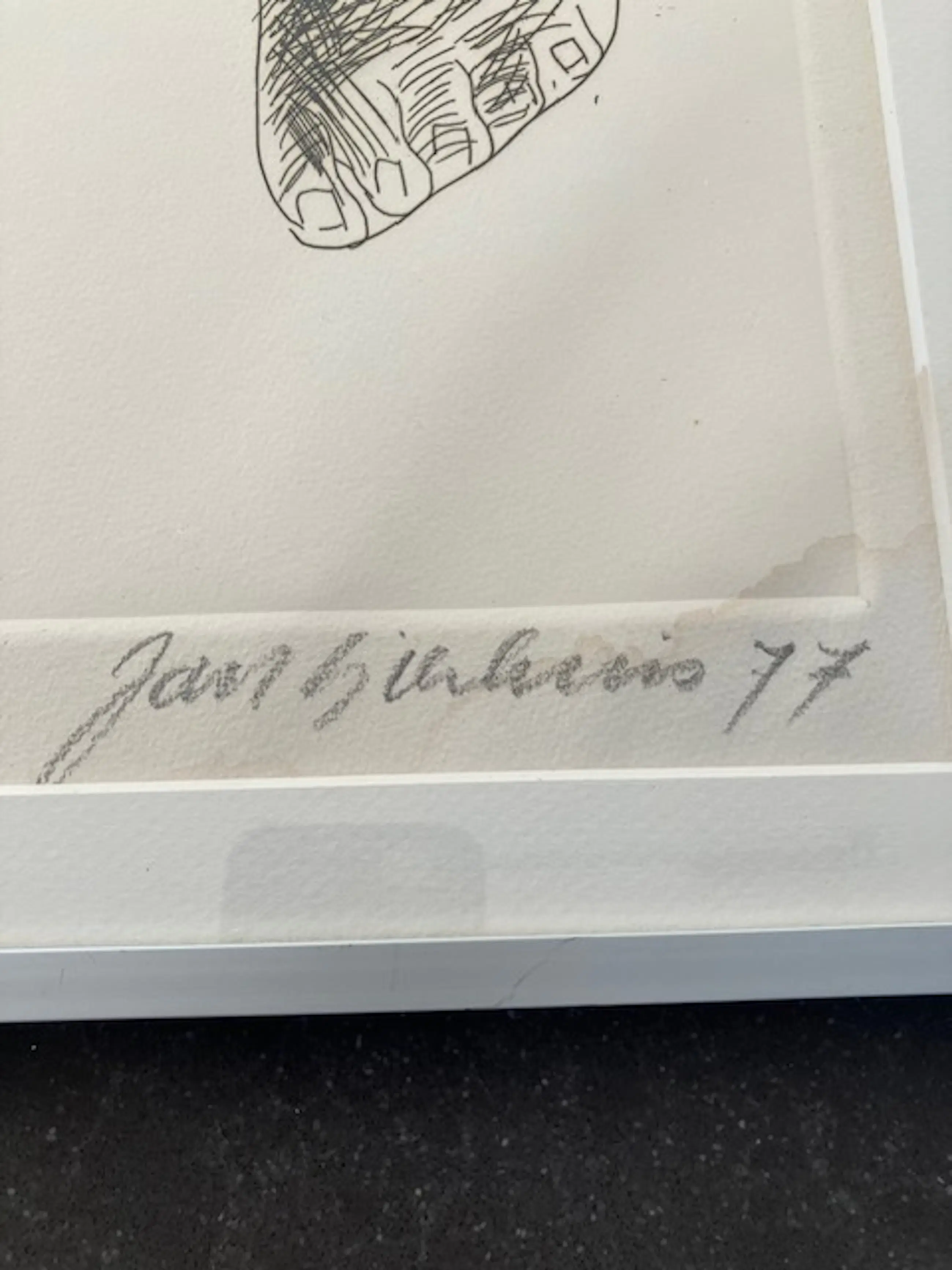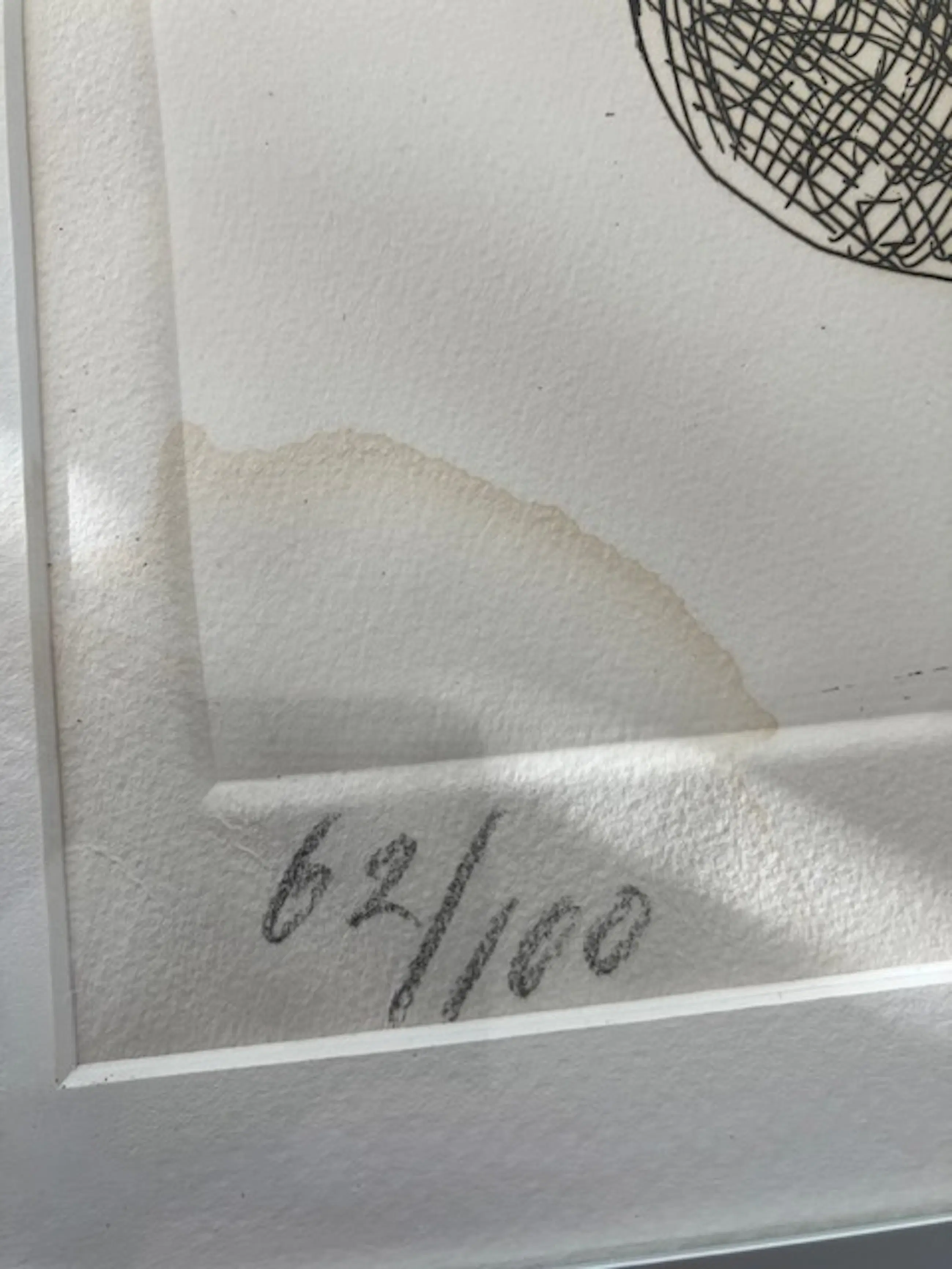 Dit item Deze ets is in een klein oplage (100) verschenen. Aangeboden item is no. 62. Er is waterschade (zie foto's). Aan de voorzijde is dit nauwelijks zichtbaar. Het exemplaar is fraai ingelijst.