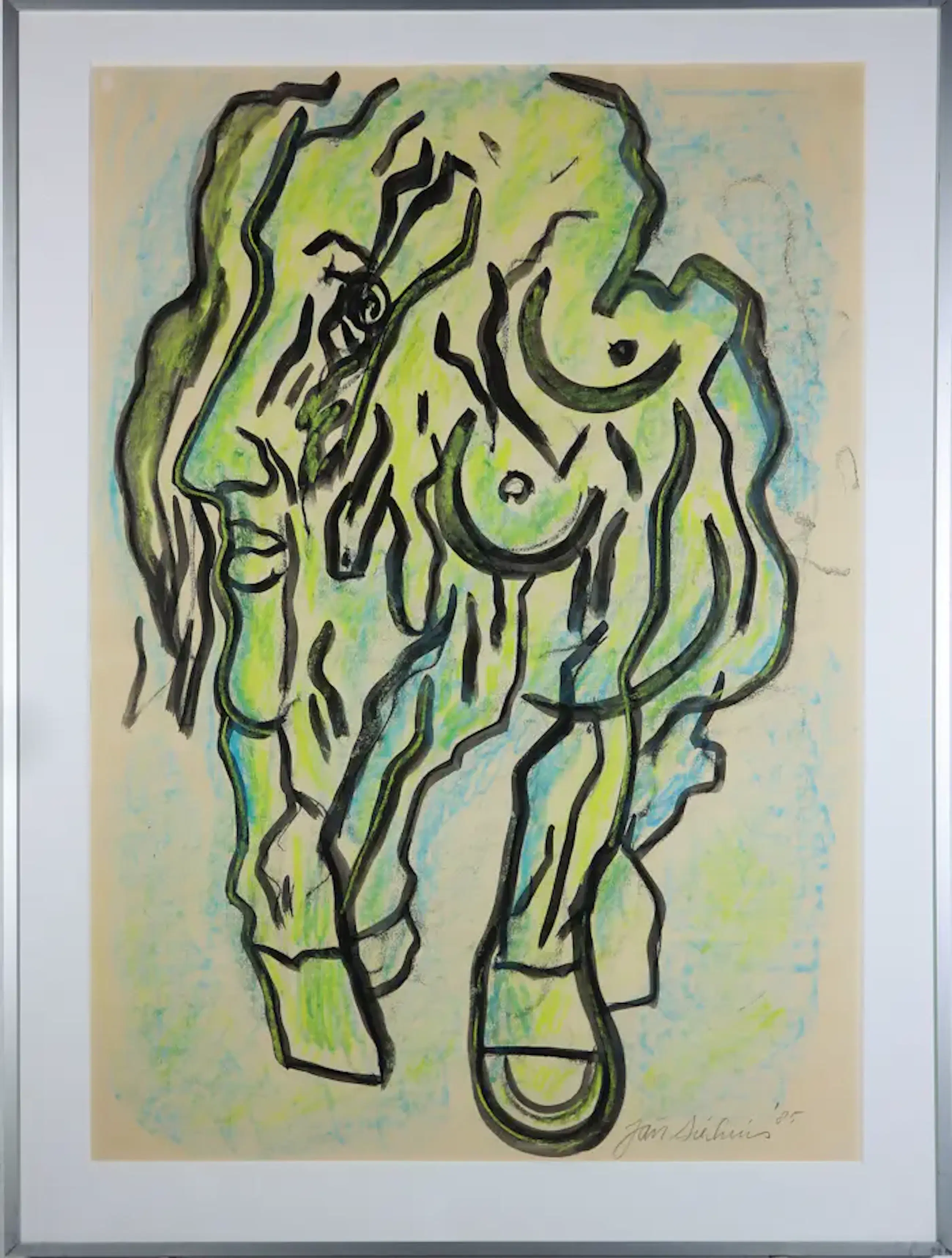 Jan Sierhuis - Aquarel en krijt - Vliegend hoofd - Ingelijst
