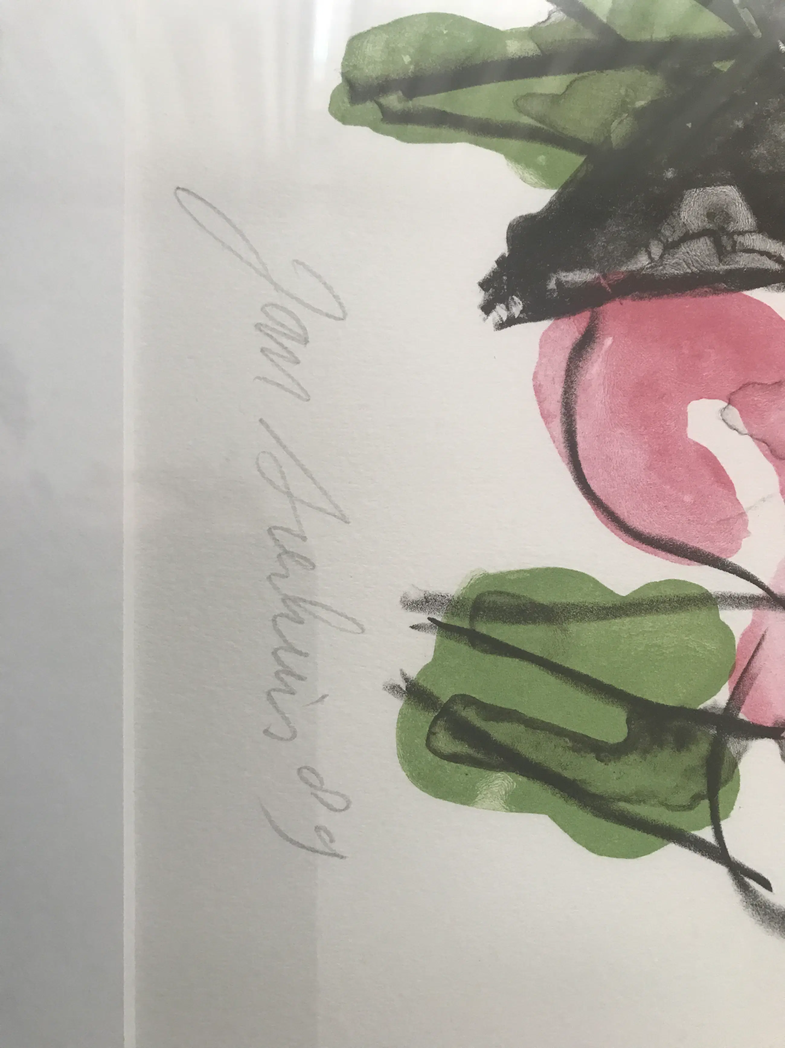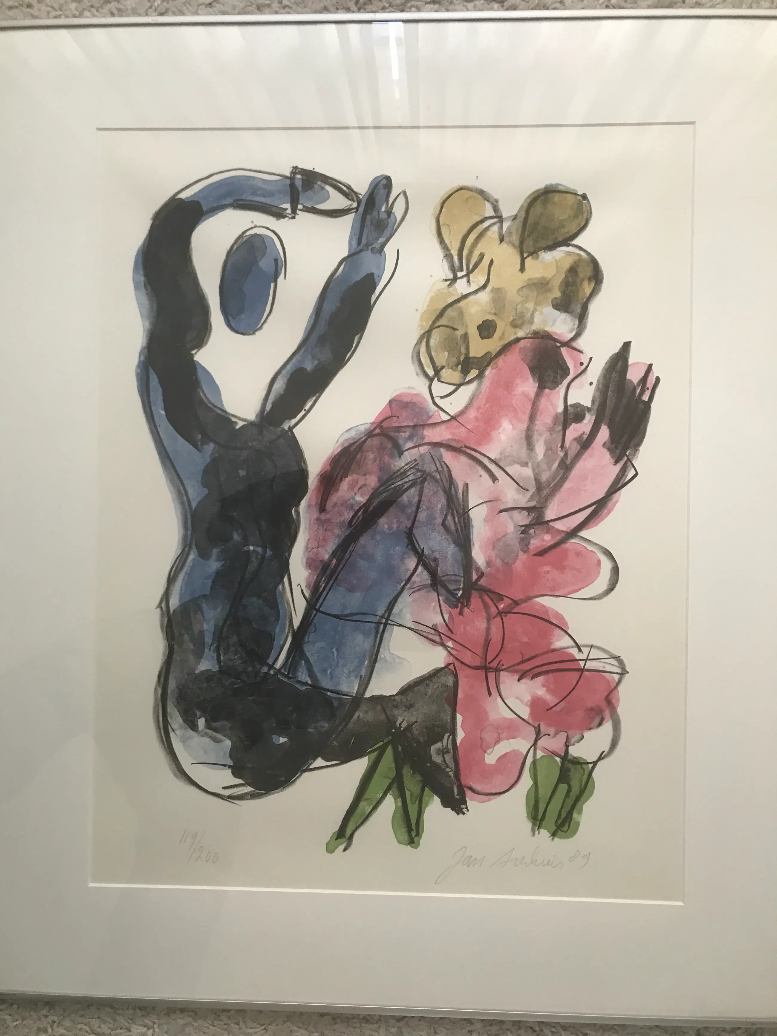 Fantastische grafiek van Jan Sierhuis Dansende mensen in zijn eigen herkenbare stijl Mooie kleuren Niet verkleurd Met passe-partout Hand gesigneerd met potlood 1989 Nummer 119 /200