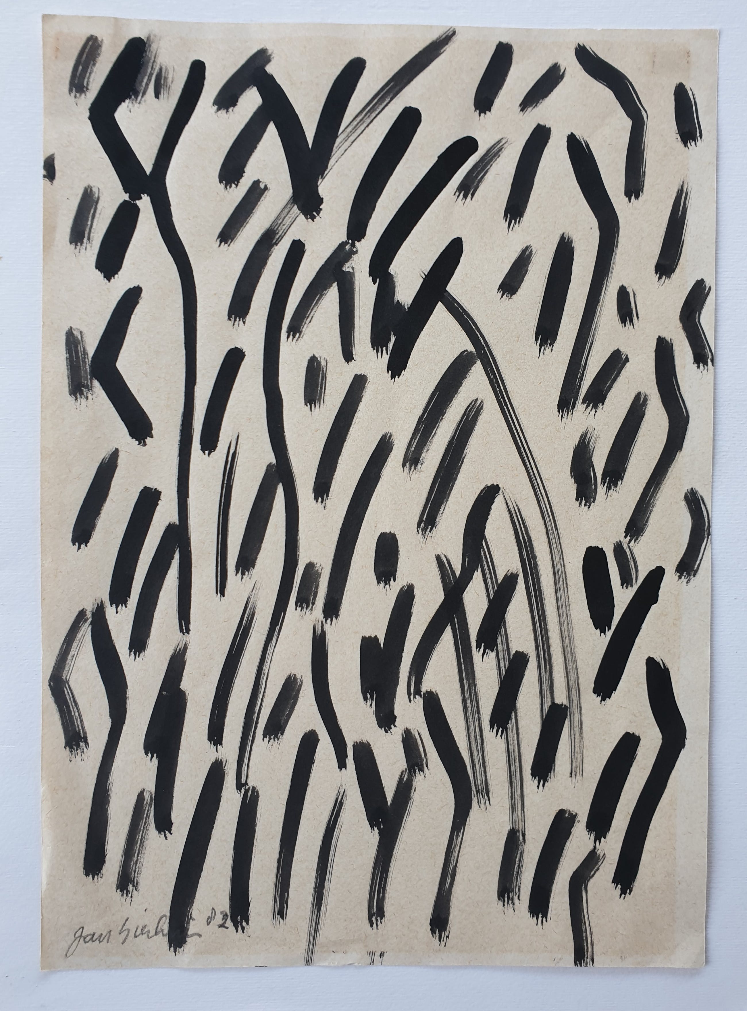 Aquarel (of inkt of gouache?) op papier van Jan Sierhuis uit 1982. De op de achterkant vermelde titel is "Dieren in het woud". Het papier is wat vergeeld en op de achterzijde zijn wat sporen van tape achtergebleven. Formaat 30 x 21 cm.