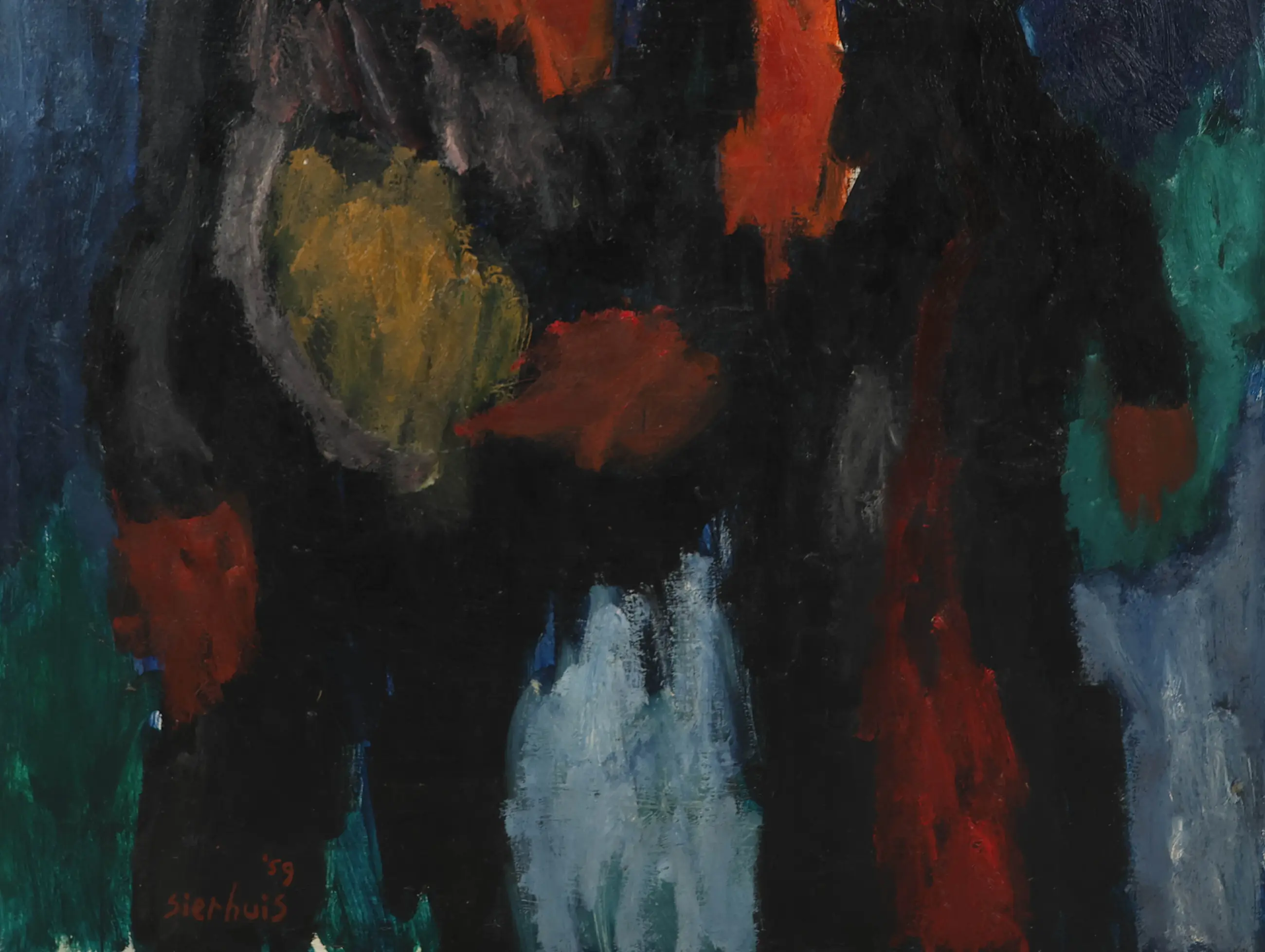 In Een droom roept Jan Sierhuis een sfeer op die mysterieus en emotioneel aanvoelt. De voorstelling is niet helder of realistisch, maar lijkt zwevend en open voor interpretatie alsof je naar een herinnering of fantasie kijkt. Met zijn losse penseelstreken en krachtige kleuren brengt Sierhuis beweging en gevoel in het werk. Vormen lopen in elkaar over en lijken soms half herkenbaar, wat het dromerige karakter versterkt.