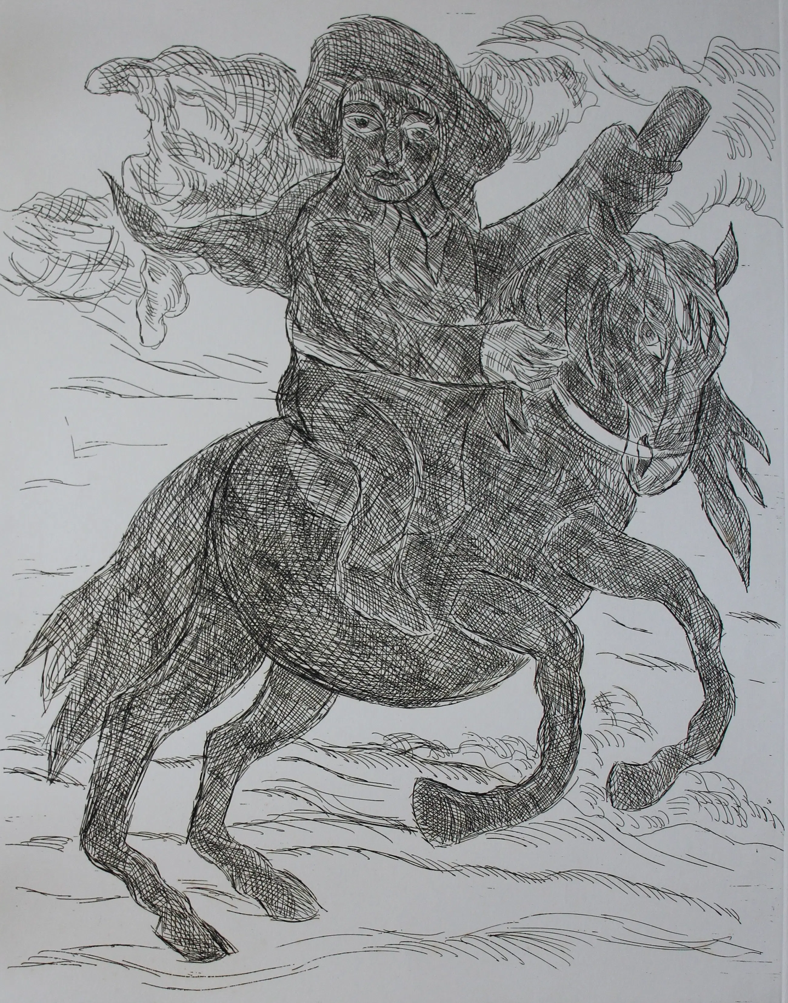 Ets van Jan Sierhuis. Titel: Ruiter te paard. Jaar: 1977. Oplage: 21/100. Afmetingen blad: H77.5 x b56cm. Afmetingen voorstelling: