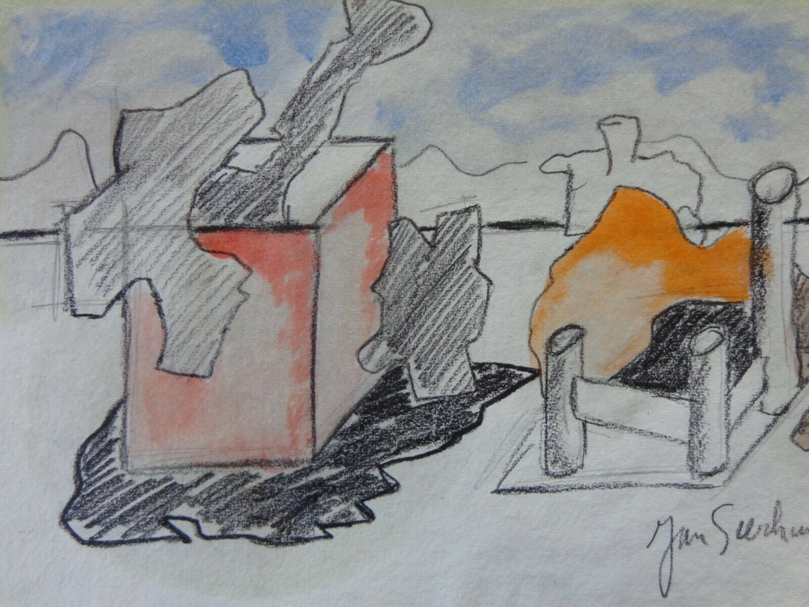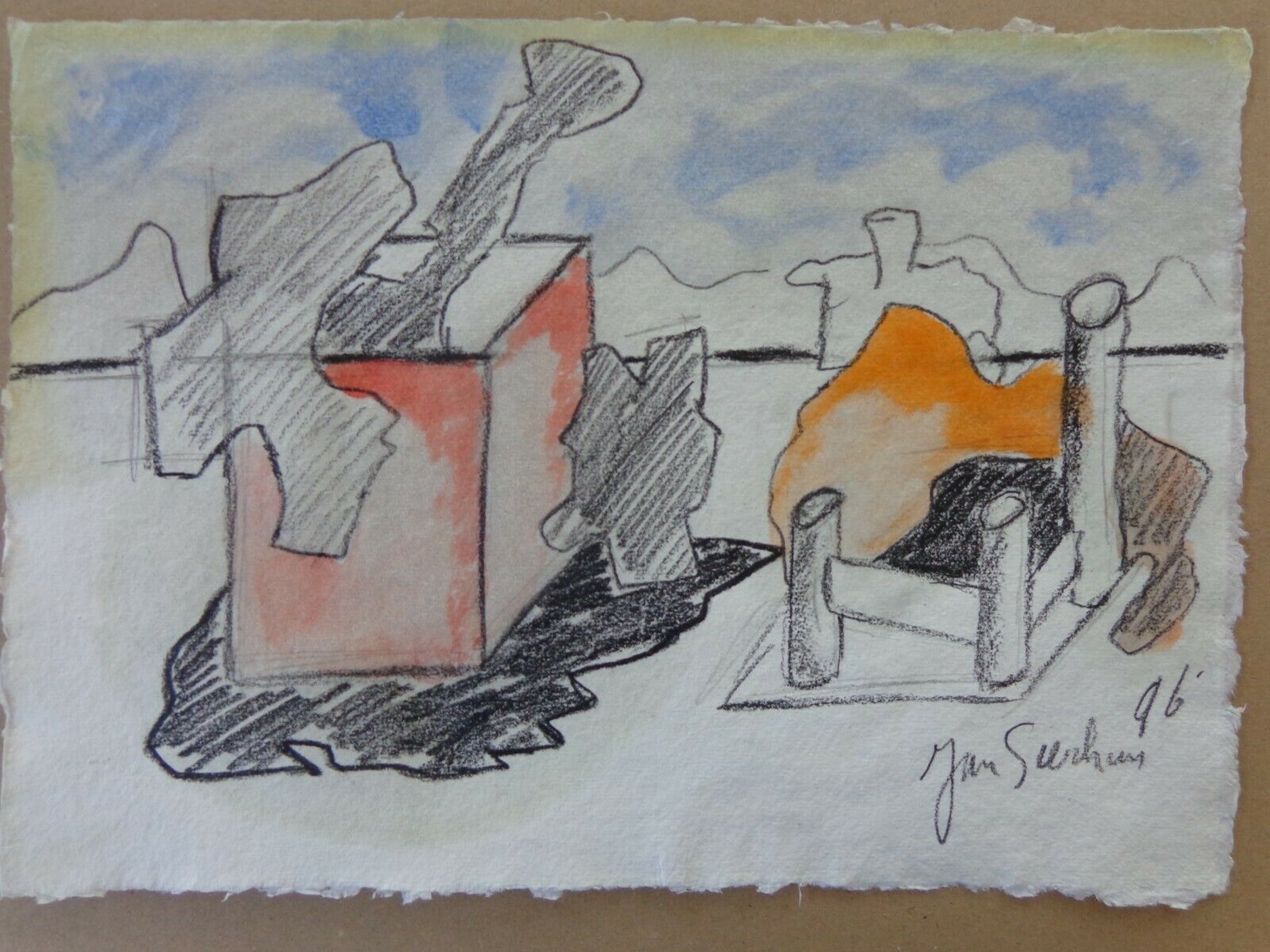 Origineel werk van aquarel + houtskool + was (?) op handgeschept papier.