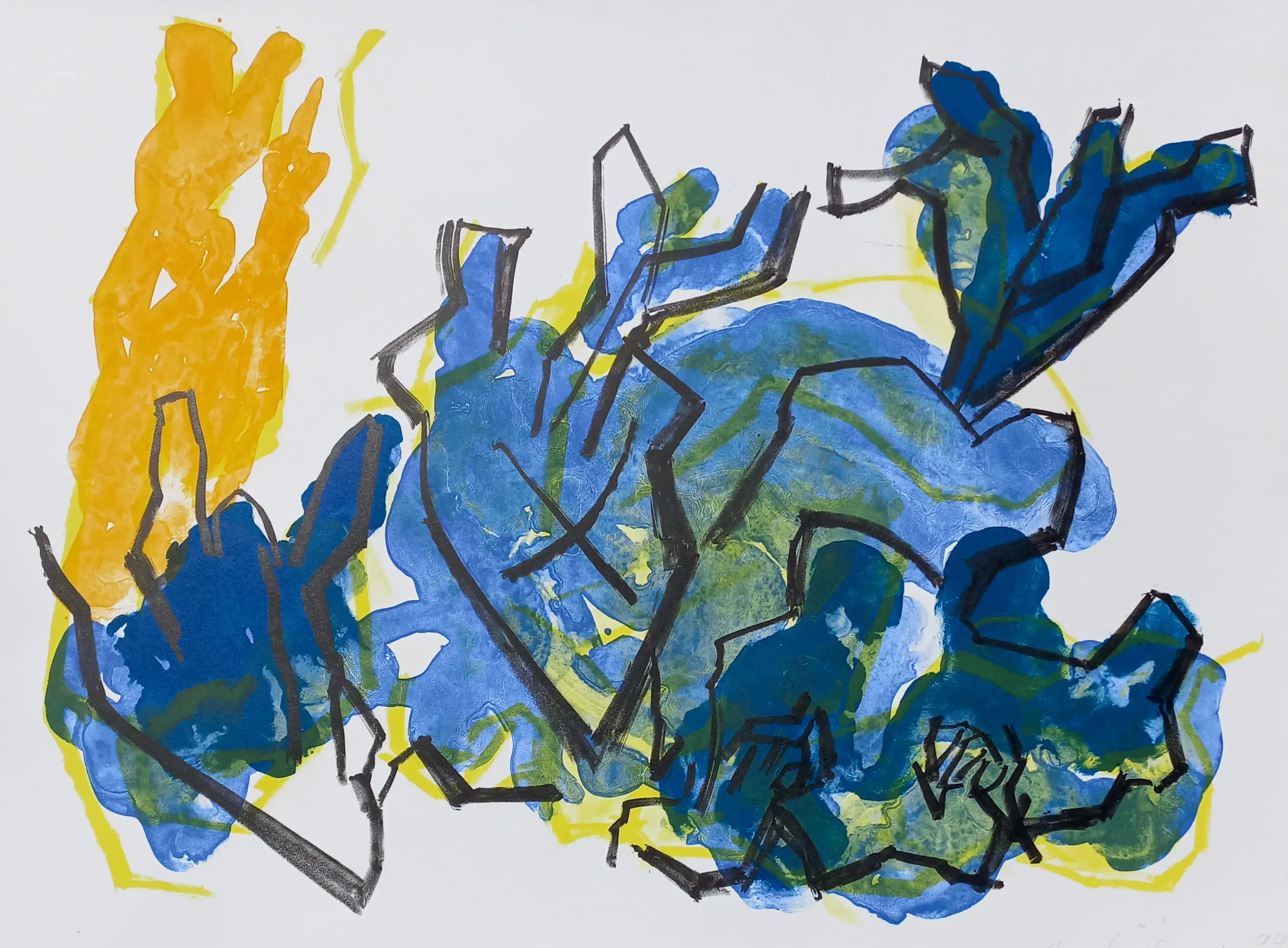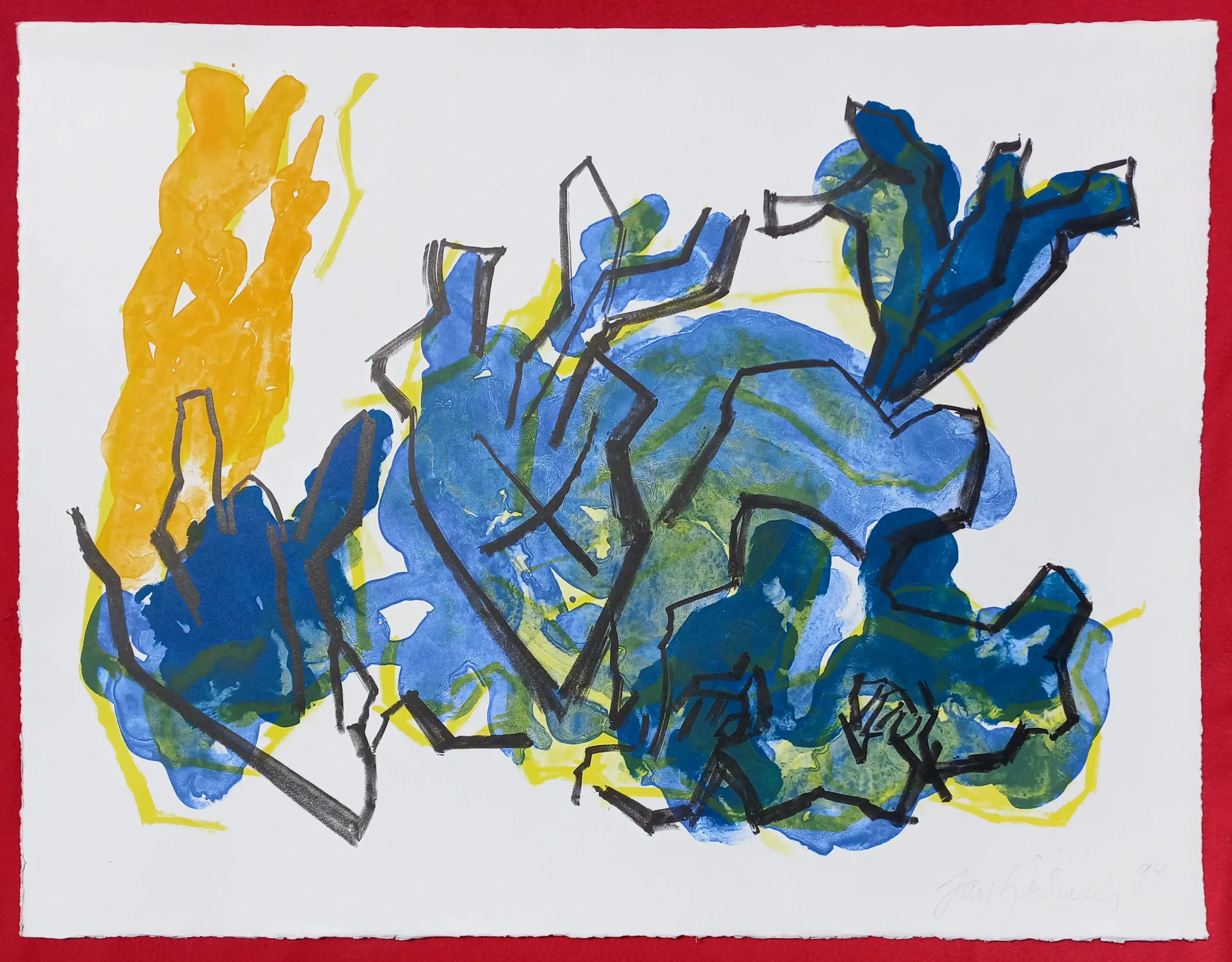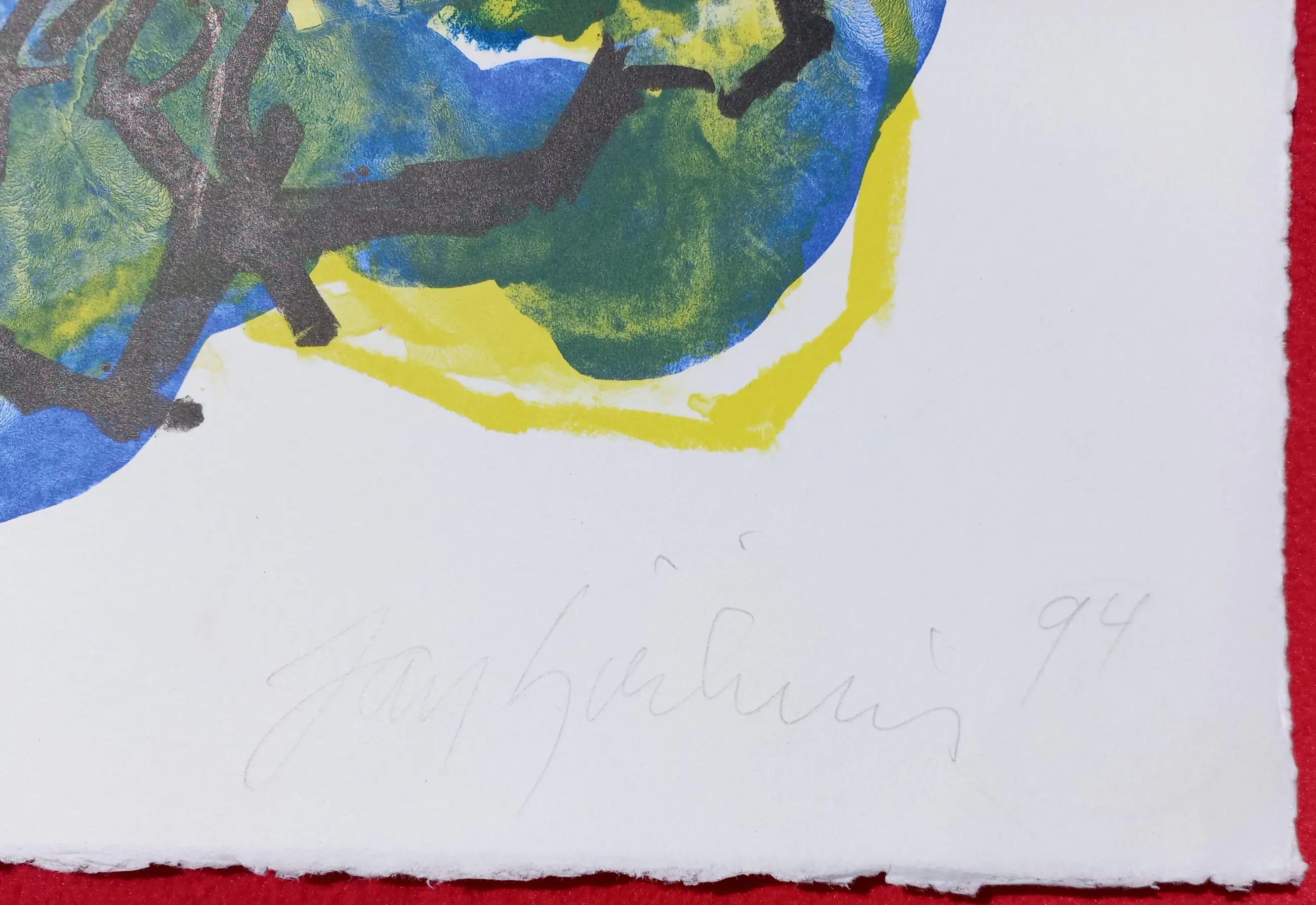 Mooi, karakteristiek werk van de deze week, op 94-jarige leeftijd, overleden Jan Sierhuis. Litho op Hahnemühle papier, met potlood gesigneerd en gedateerd (‘94). In zeer goede conditie.