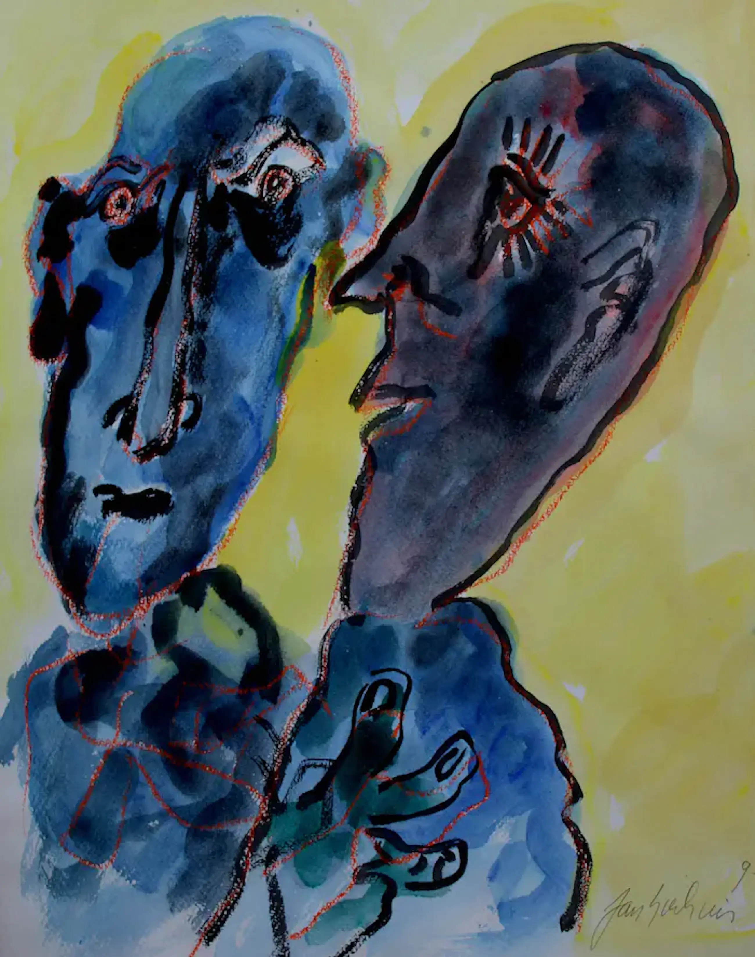 Aquarel met krijt van Jan Sierhuis. Voorstelling van een echtpaar. Jaar: 1995. Afmetingen blad: H75,5 x b56.5cm. Het werk is, rechts onderaan, gesigneerd en betiteld achterop, door de kunstenaar. De authenticiteit van dit werk wordt volledig gegarandeerd. Een certificaat van echtheid kan, op aanvraag, worden gemaild.