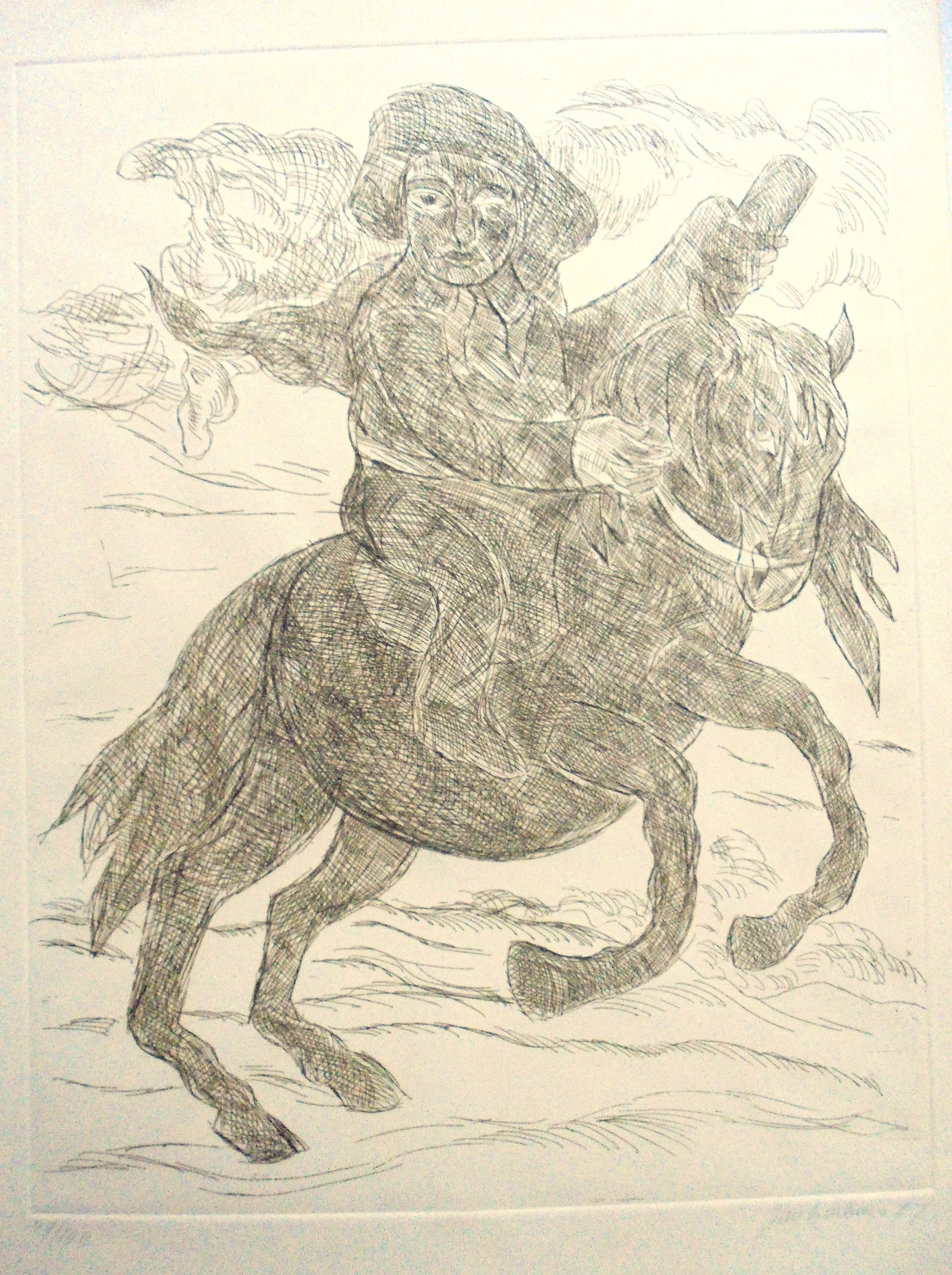 Jan Sierhuis - Grote, gedetailleerde ets, ruiter te paard.