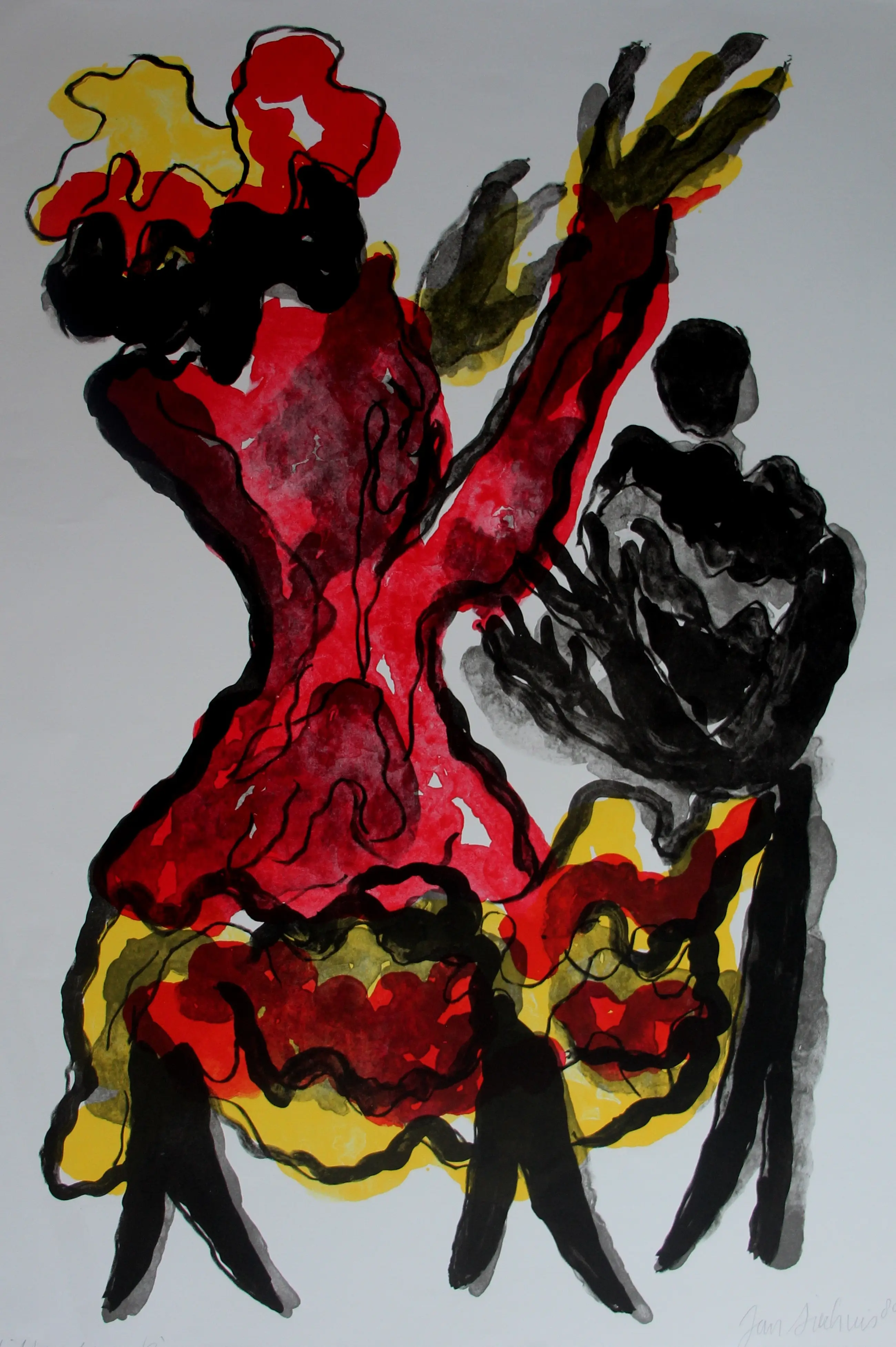 Litho van Jan Sierhuis. Voorstelling van een flamenco danser. Jaar: 1988. Oplage: E.A, artist proof voor Rina. Afmetingen blad: H100 x b70cm. Afmetingen voorstelling: H92 x b62cm. Het werk is, rechts onderaan, gesigneerd door de kunstenaar. De authenticiteit van het aangeboden werk wordt volledig gegarandeerd. Een certificaat van echtheid kan, op aanvraag, worden gemaild.
