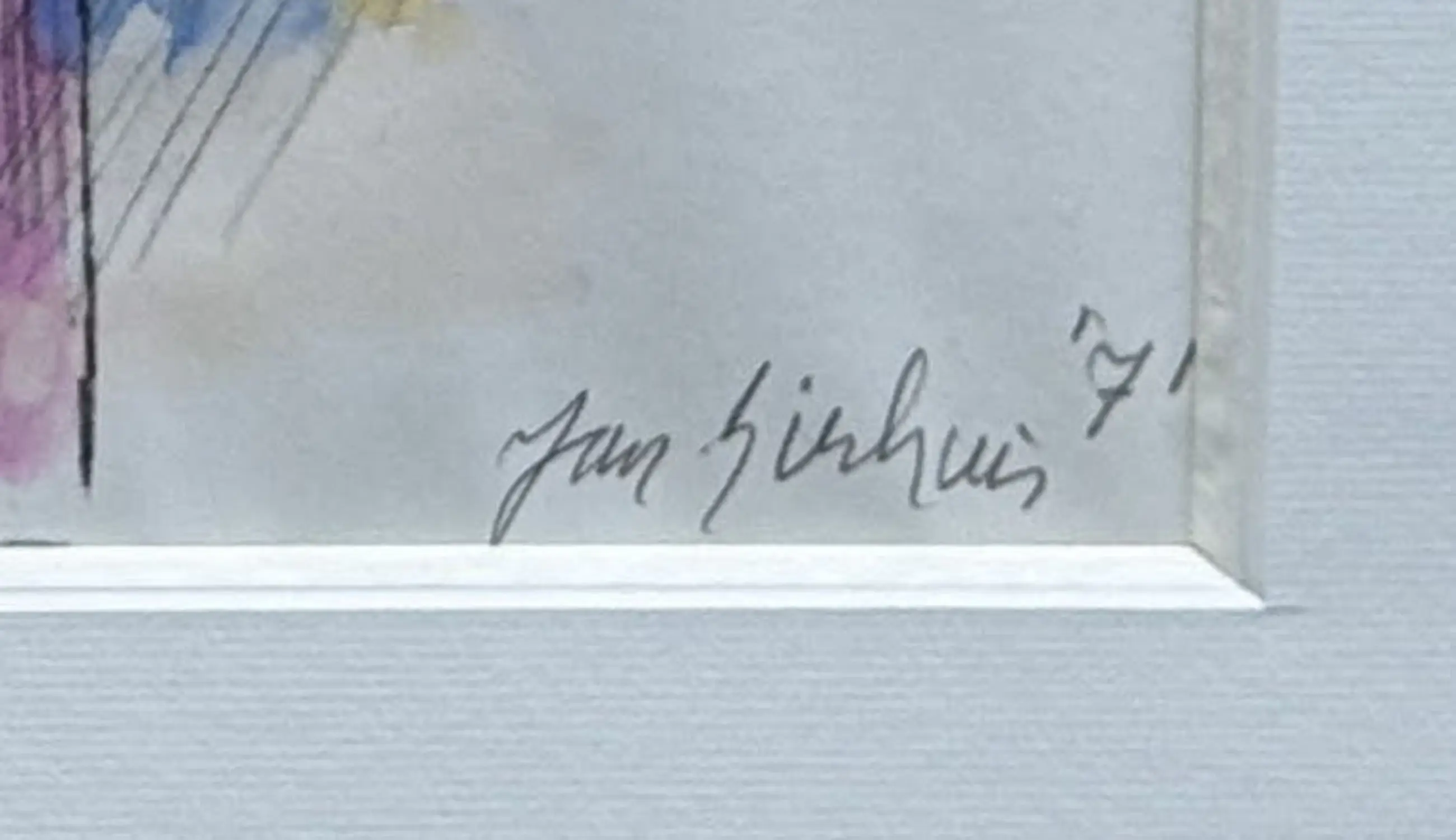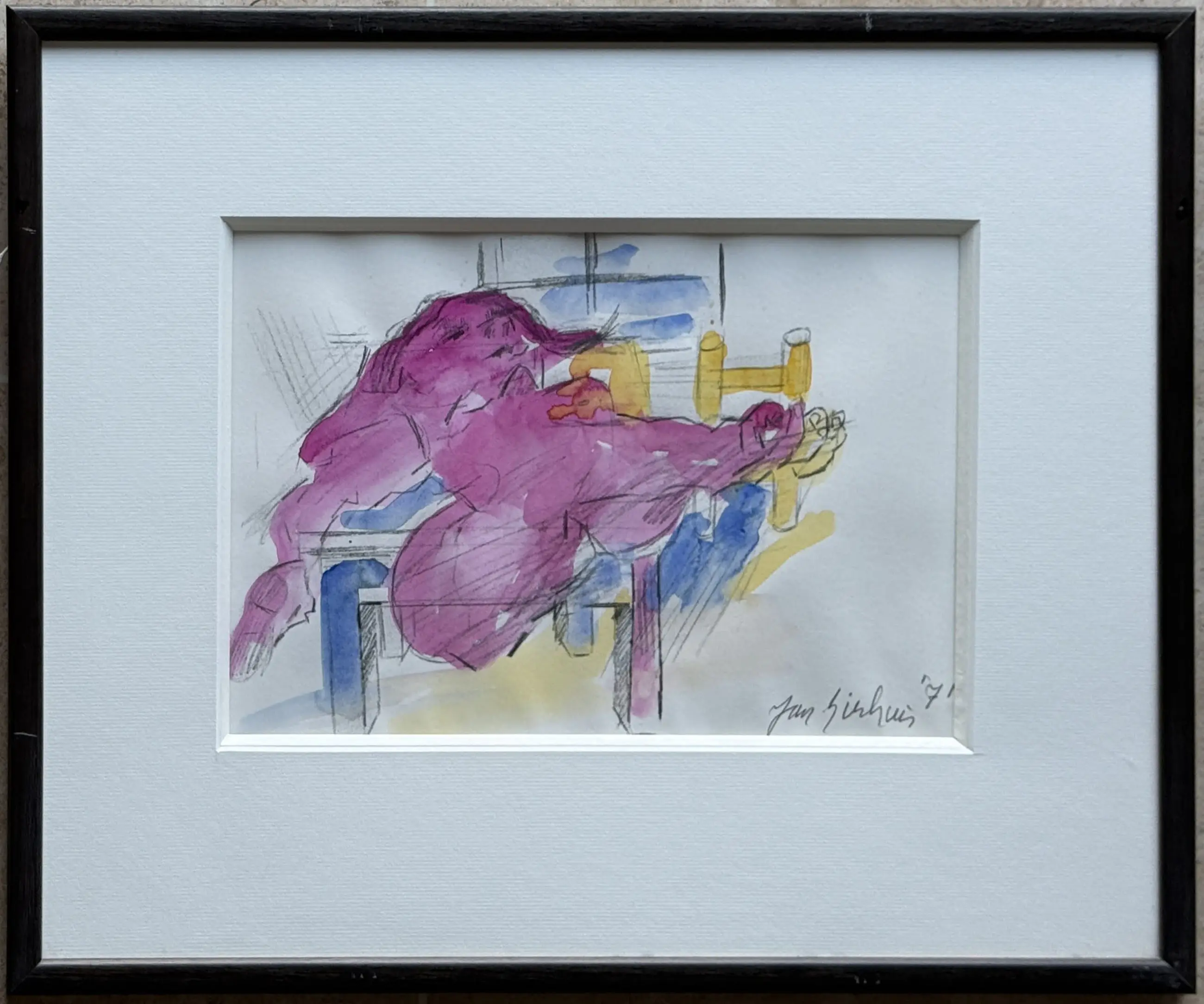 Houtskool en aquarel op papier van Jan Sierhuis met de titel: 'Liggend naakt' uit 1971. Het werk is rechtsonder met de hand gesigneerd door de kunstenaar.