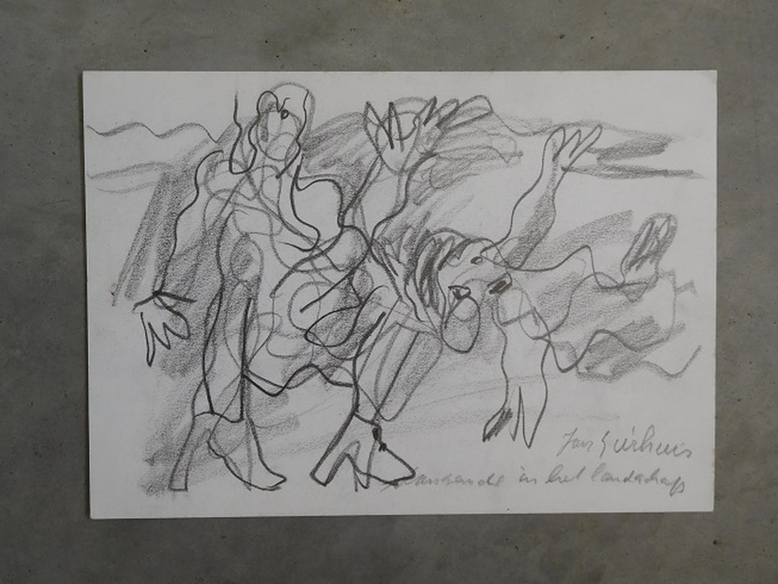 Originele Potlooddtekening van Jan Sierhuis met als titel: "Dansende in het Landschap". Formaat inclusief professioneel houten zilveren lijstje 44 x 36 cm. Wordt aangetekend verstuurd.