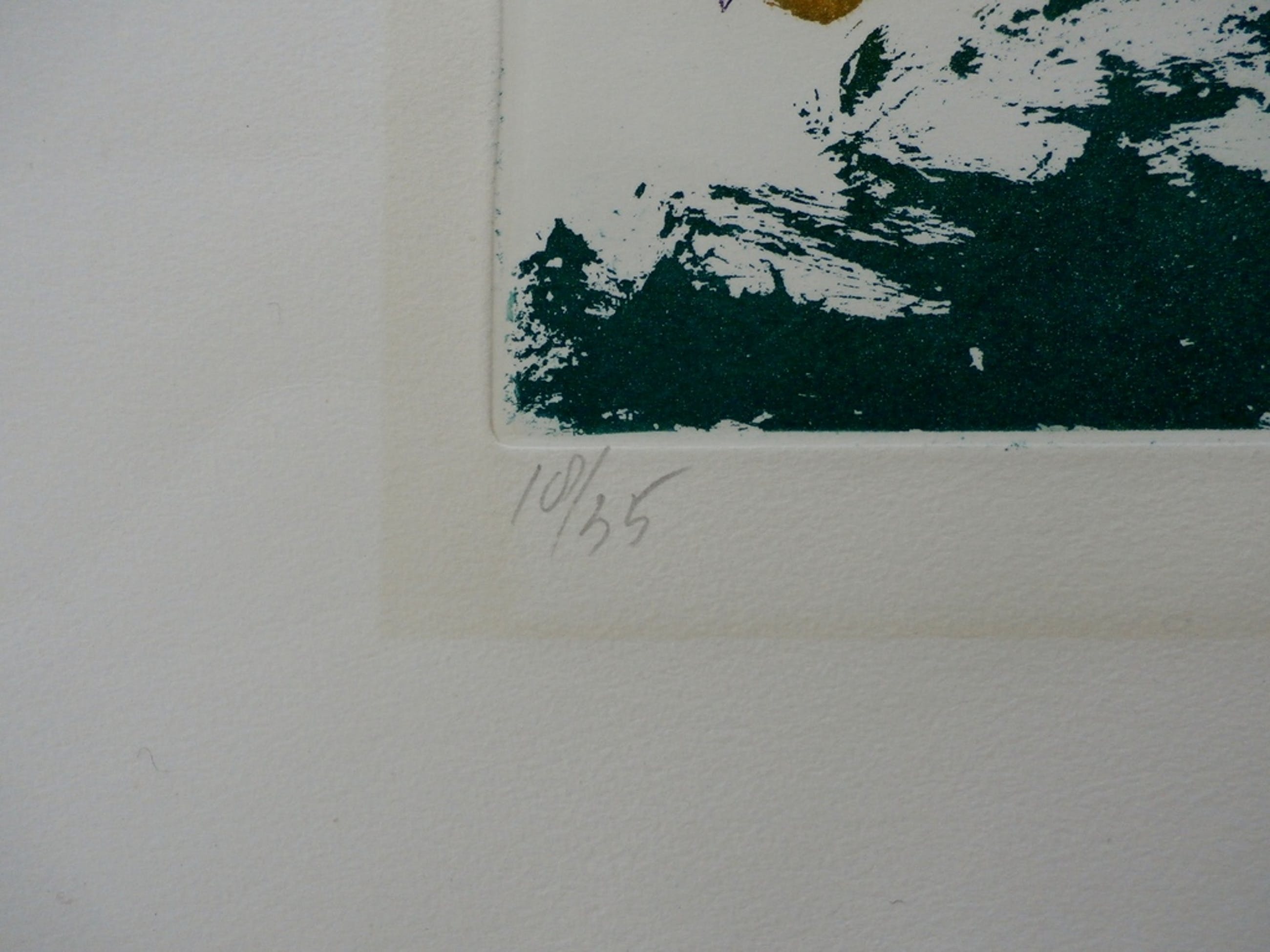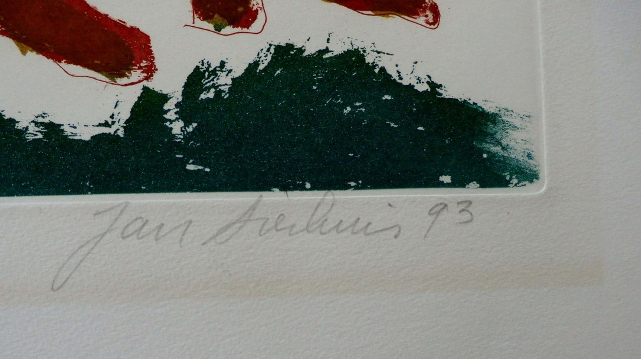 Kleurrijke ets van Jan Sierhuis uit 1993. Nummer: 18/35. Afmetingen blad: H51 x b61 cm. Afmetingen ets: H39 x b44 cm. Herkomst: collectie ABN AMRO. De authenciteit van het, aangeboden, werk wordt voor 100% gegarandeerd. Een certificaat van echtheid kan, op aanvraag, worden meegestuurd.