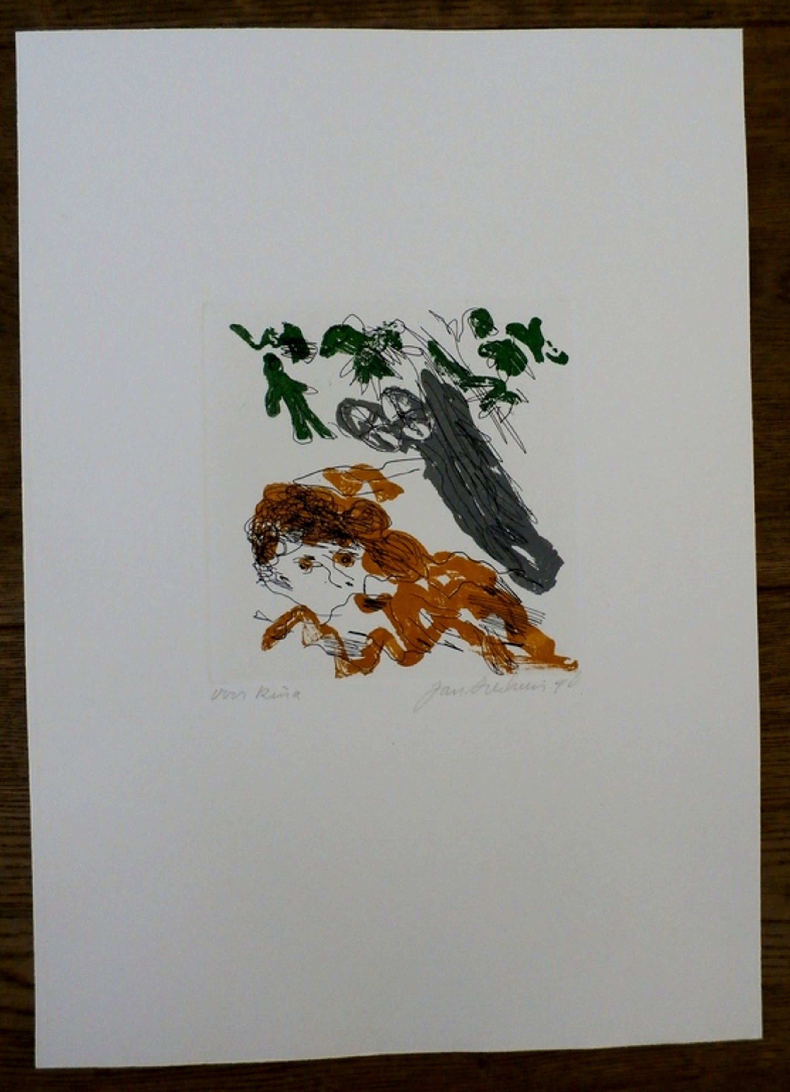 Leuke kleurrijke ets van Jan Sierhuis uit 1996. Opdracht: voor Rina. Afmetingen blad: H39 x b28 cm. Afmetingen ets: H15 x b14 cm. De authenciteit van het, aangeboden, werk wordt voor 100% gegarandeerd. Een certificaat van echtheid kan, op aanvraag, worden meegestuurd.