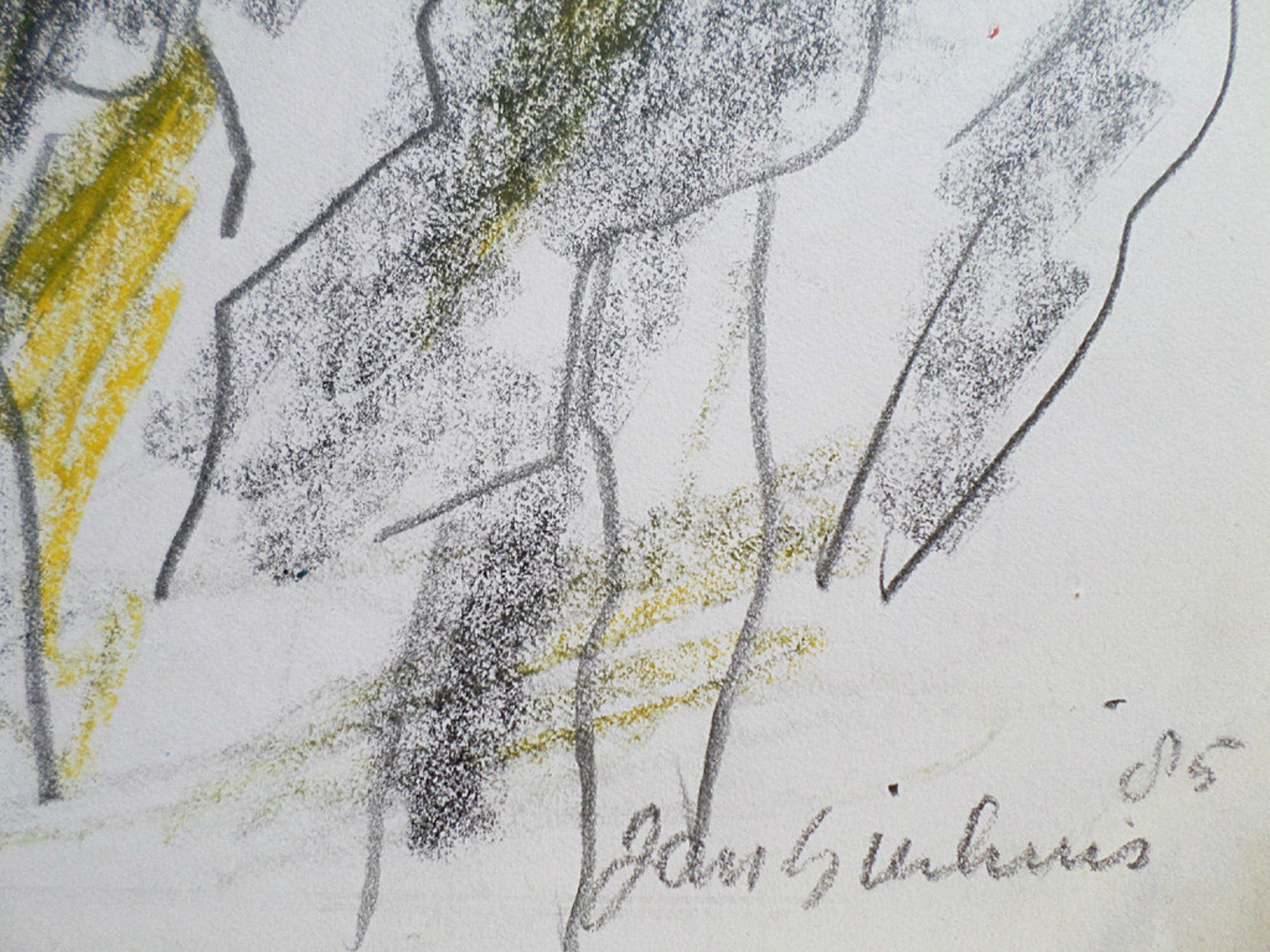 Karakteristieke tekening met potlood en krijt op papier, gemonteerd op dubbel wit papier. Met potlood gesigneerd en gedateerd (‘85). In zeer goede conditie.