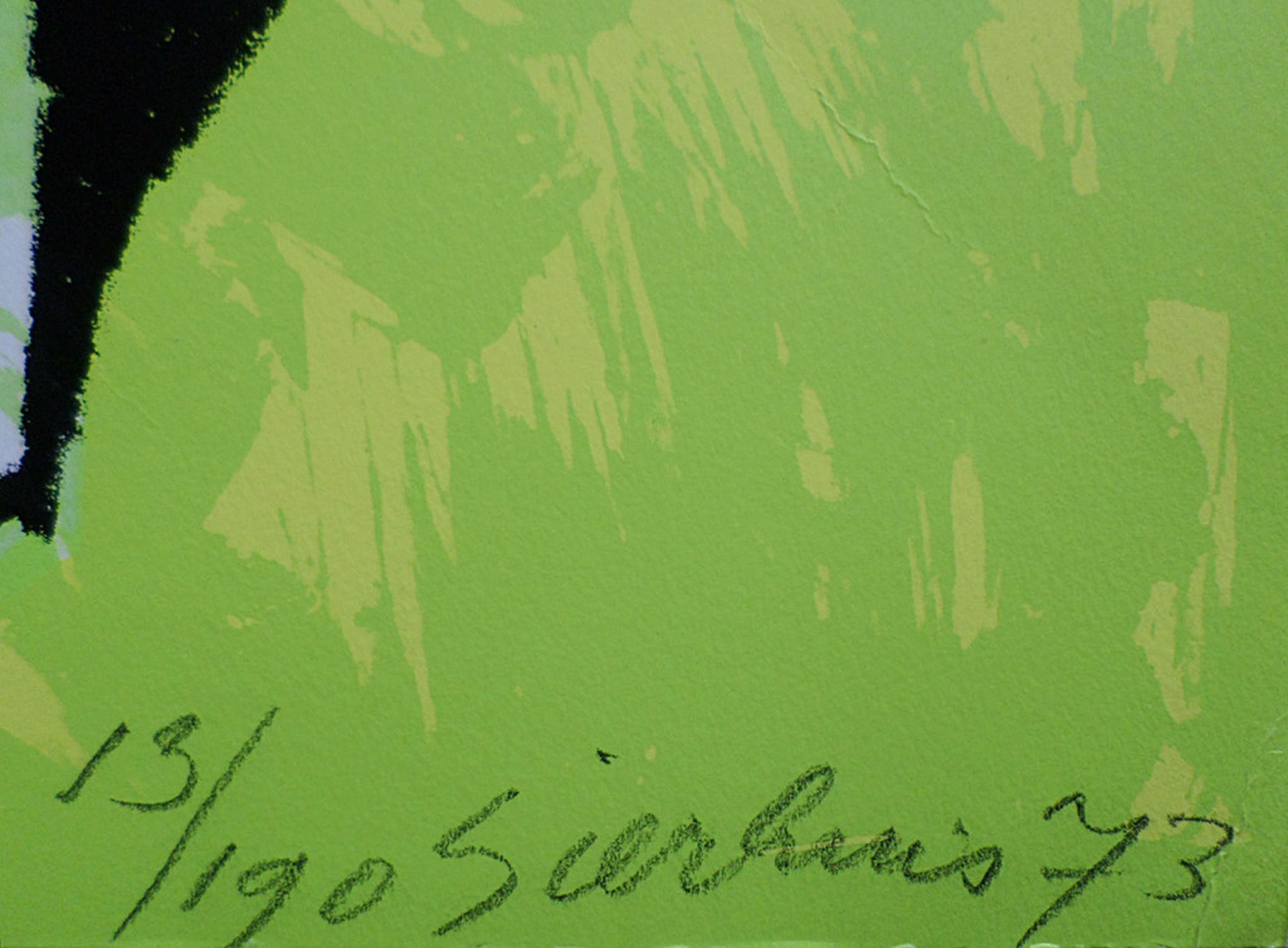 Mooie zeefdruk van Jan Sierhuis uit 1973, uitgegeven door Prent 190. Handgesigneerd, gedateerd en genummerd. Dit is nummer 13 uit een oplage van 190 stuks. In zeer goede conditie; slechts wat kleine kreukjes in de hoeken.
