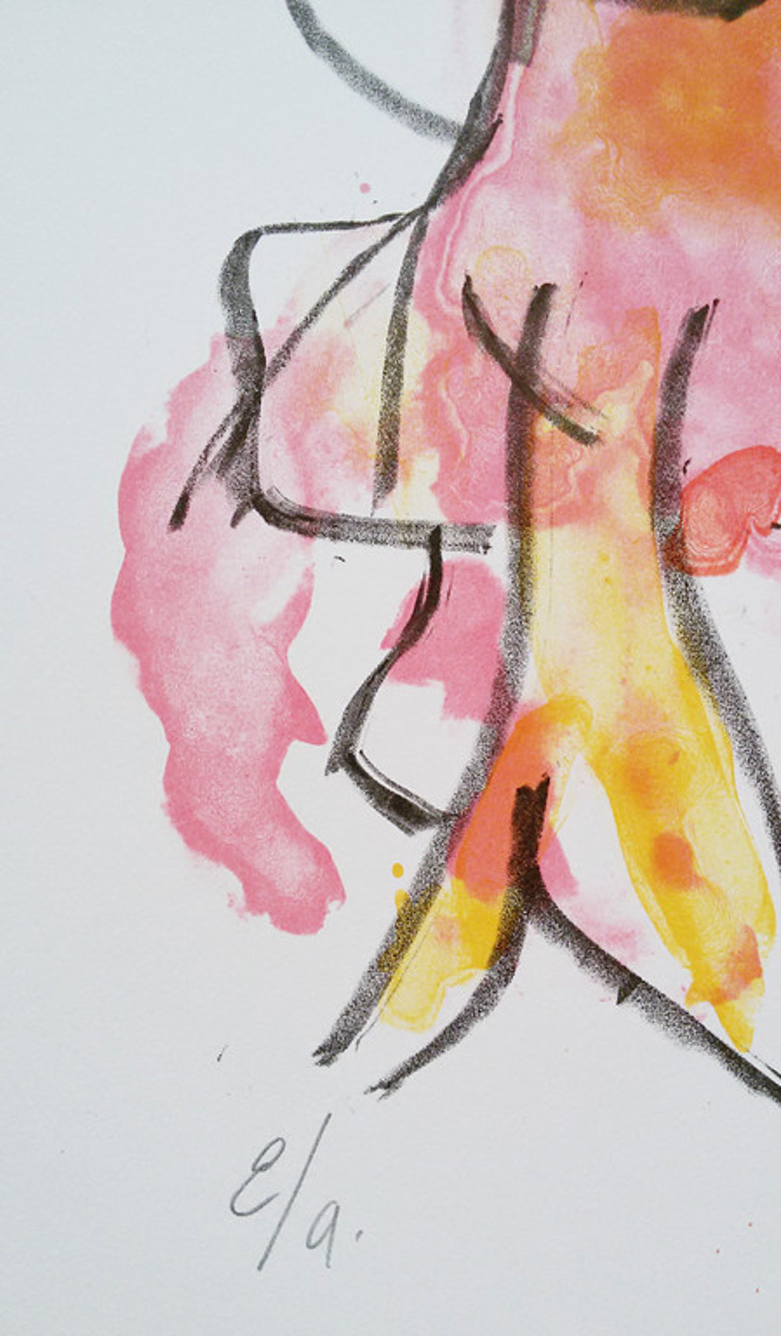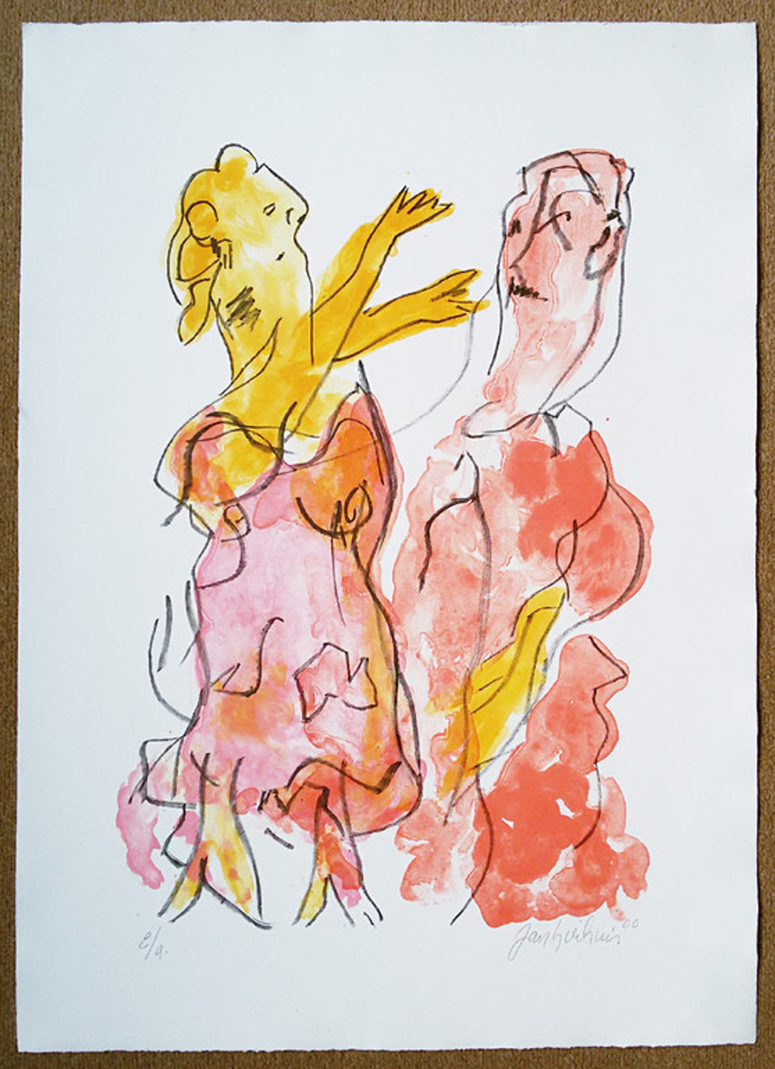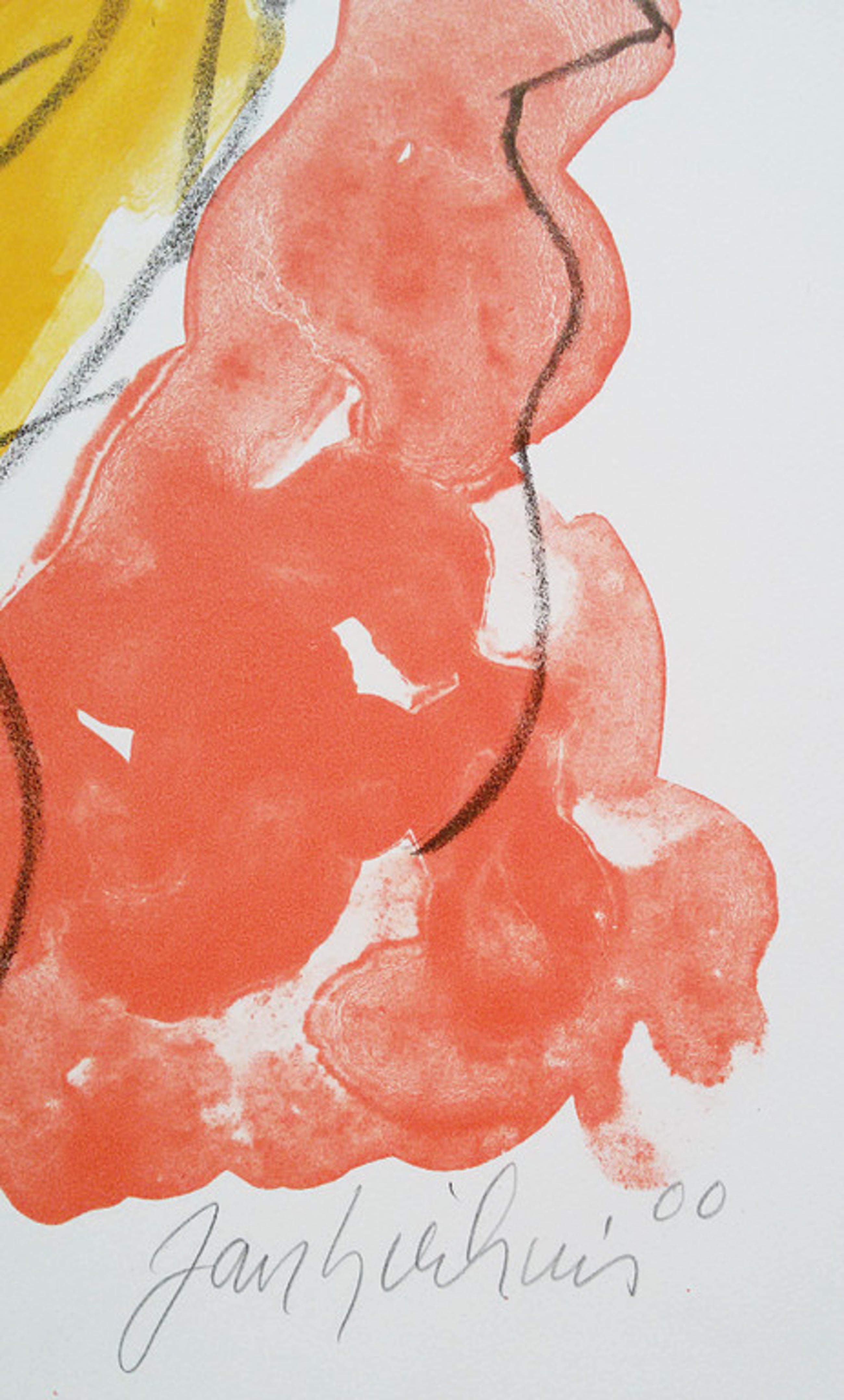 Karakteristiek werk van Jan Sierhuis. Litho op geschept papier, met potlood gesigneerd en gedateerd (‘00), een E.A. exemplaar. In uitstekende conditie.