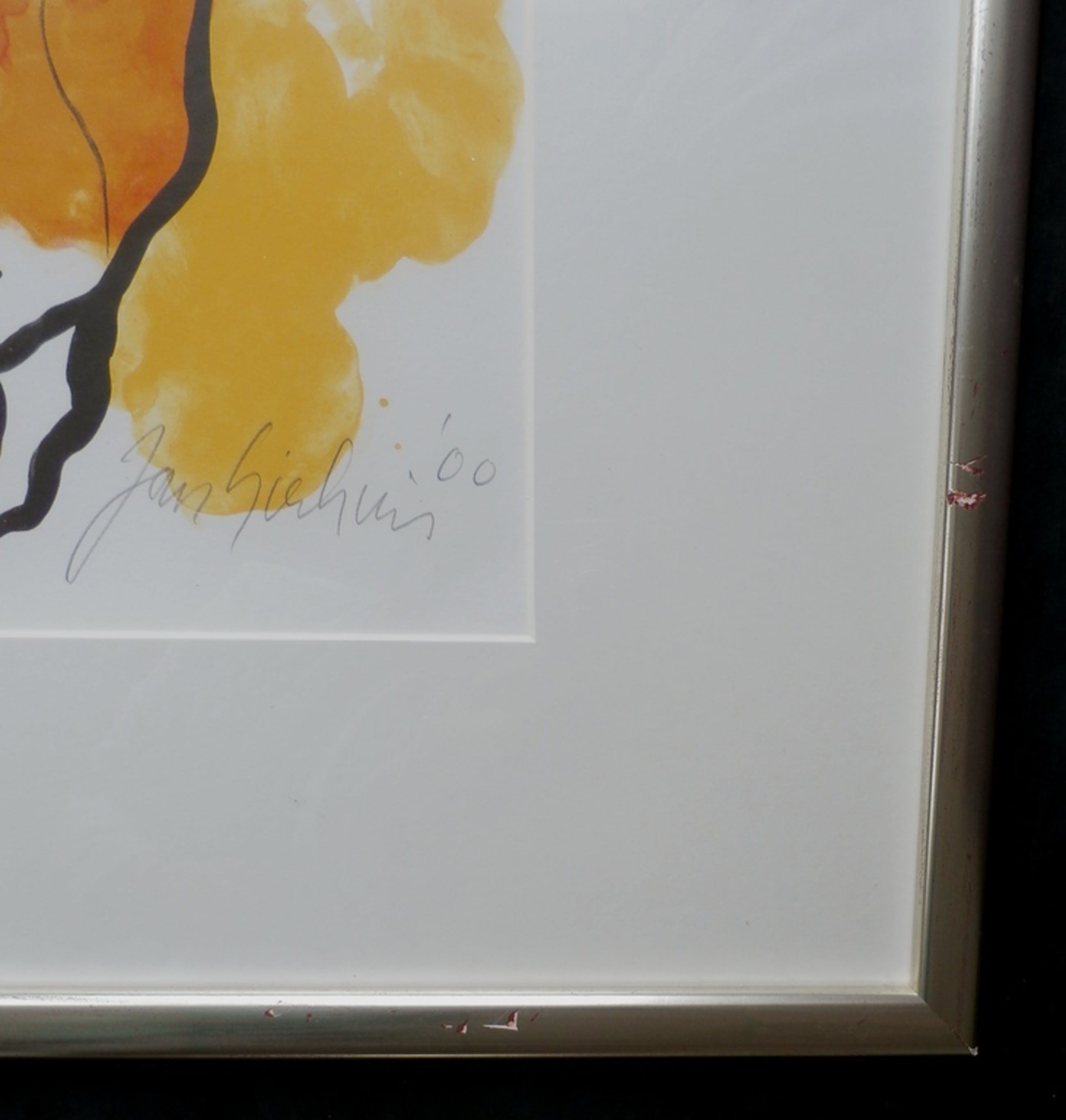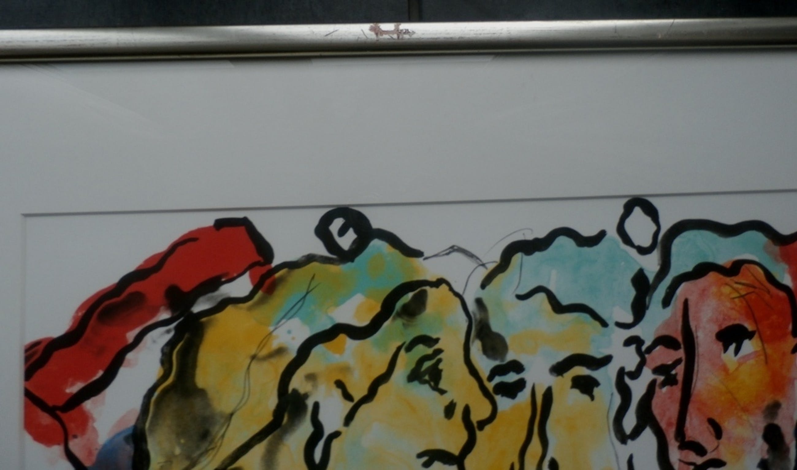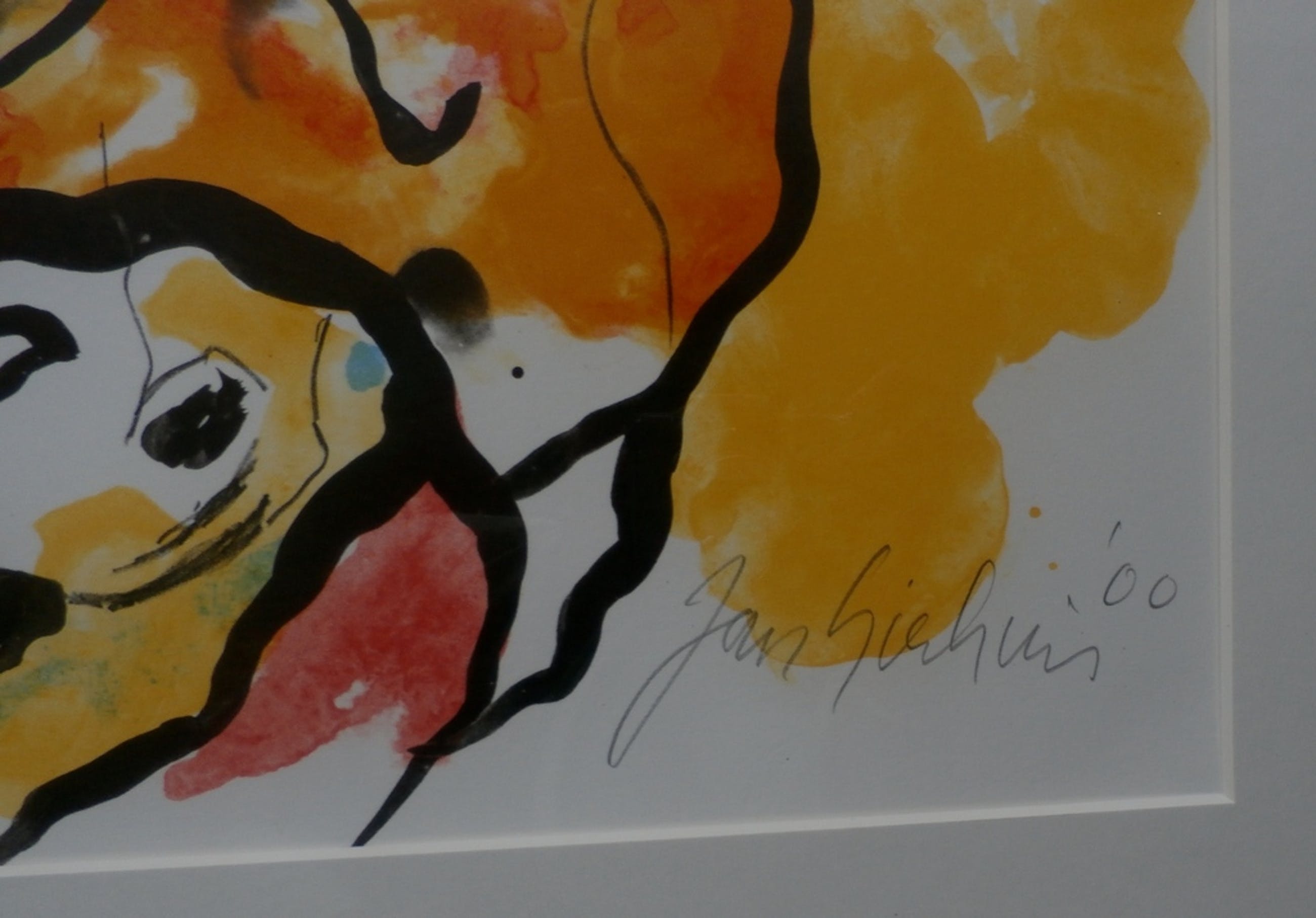Ingelijste zeefdruk van Jan Sierhuis. Titel: figuren met wijn en Nederlandse vlaggen. Nummer: 24/35. Het werk is rechtsonder, met potlood, gesigneerd door de kunstenaar. Afmetingen incl. lijst: H73 x b88 cm, afmetingen voorstelling: H50 x b62 cm. .Het werk is rechtsonder gesigneerd door de kunstenaar. De authenticiteit van het aangeboden werk wordt voor 100% gegarandeerd. Een certificaat van echtheid kan, op aanvraag, worden meegeleverd.