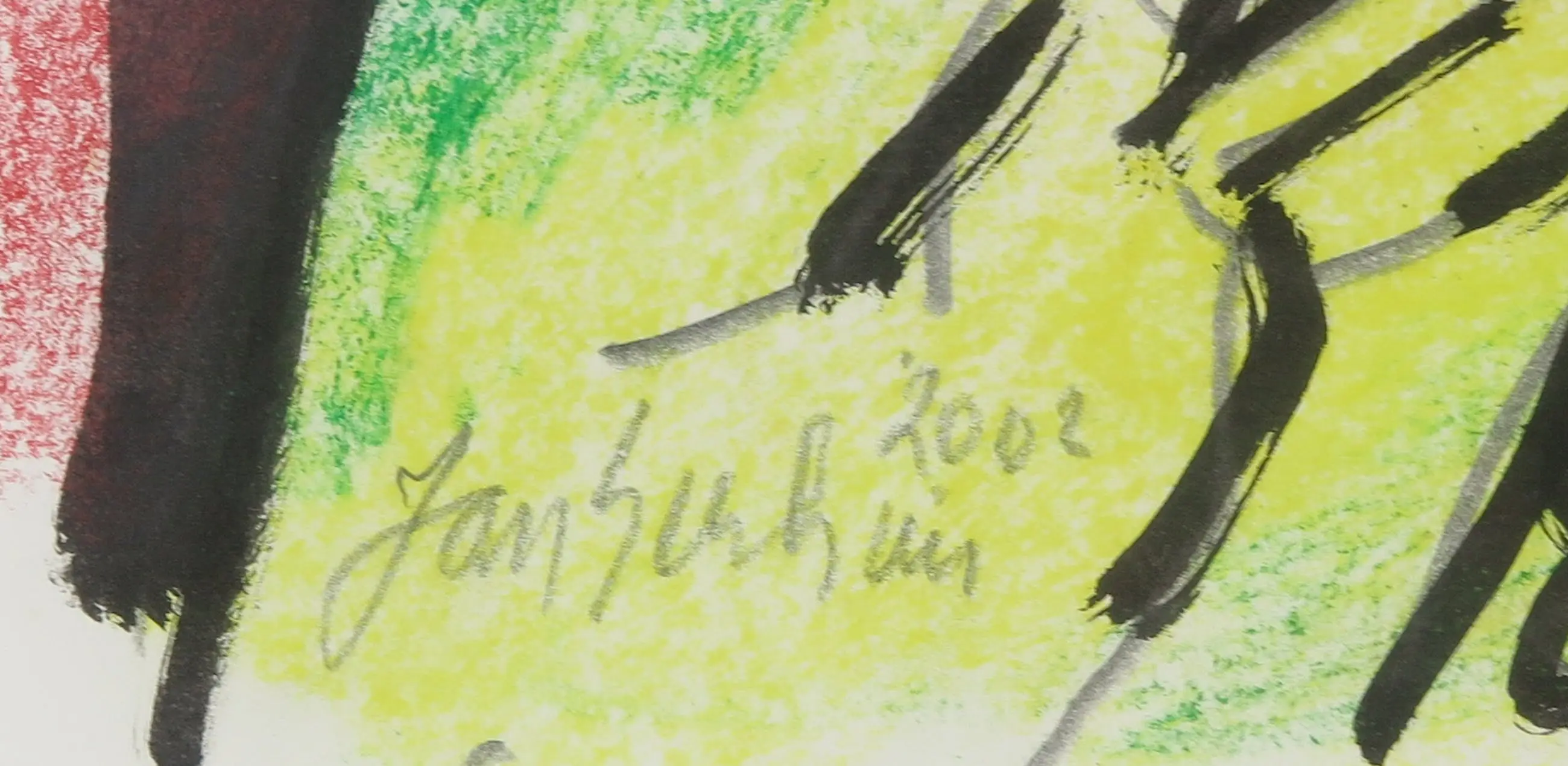 Een karakteristieke en kleurrijke tekening van Jan Sierhuis. Zwevend ingelijst en in (zeer) goede staat!
