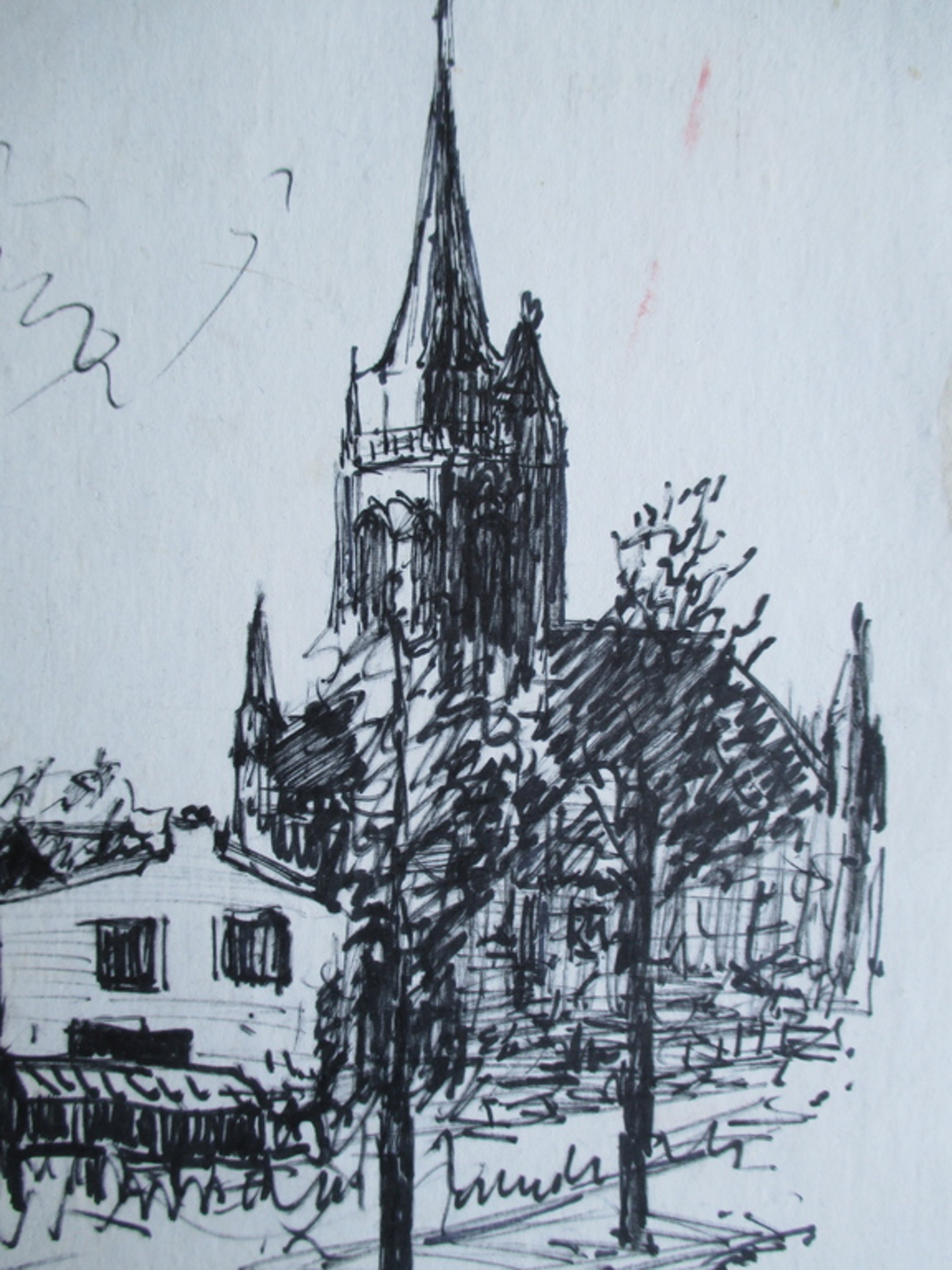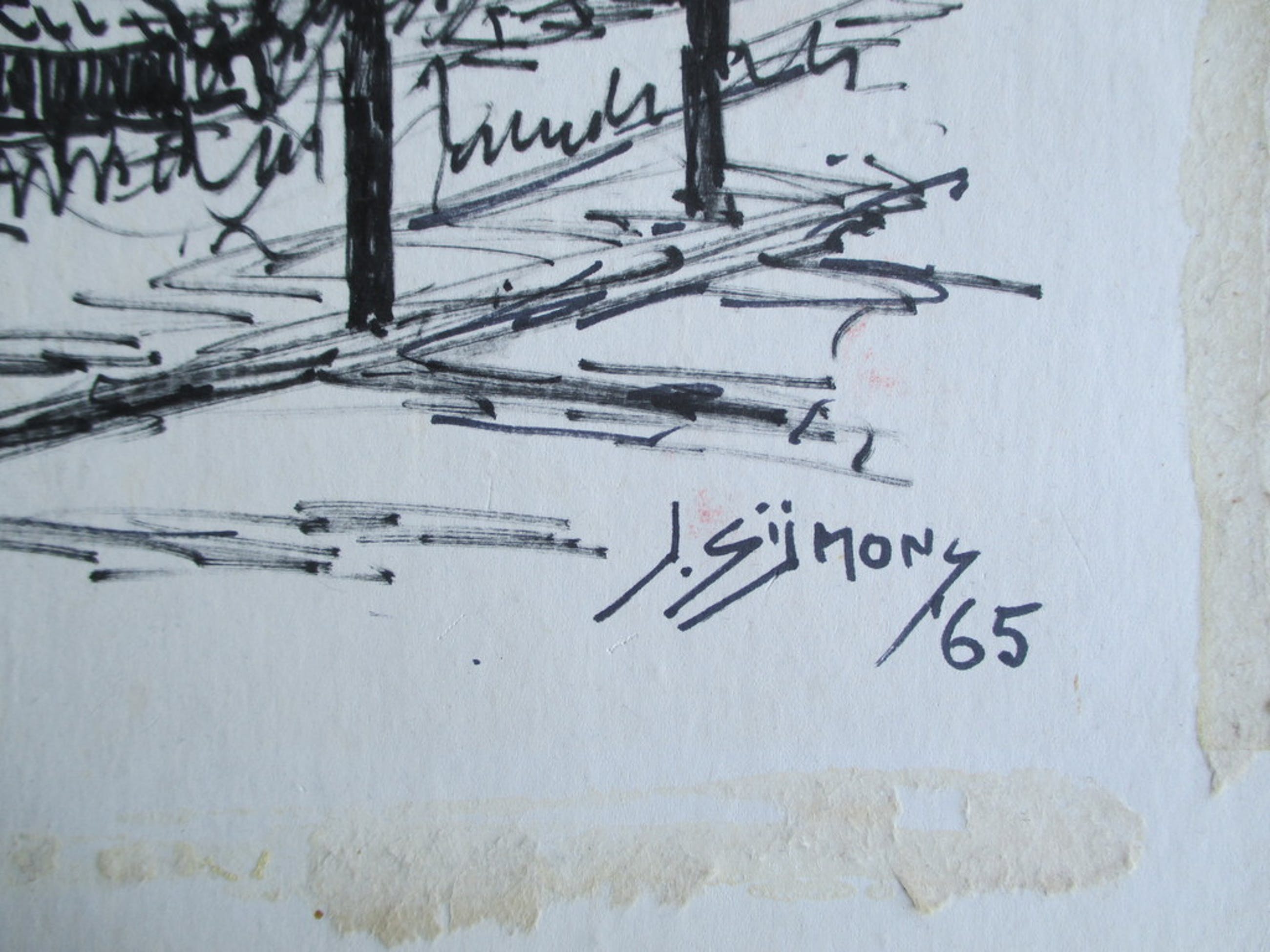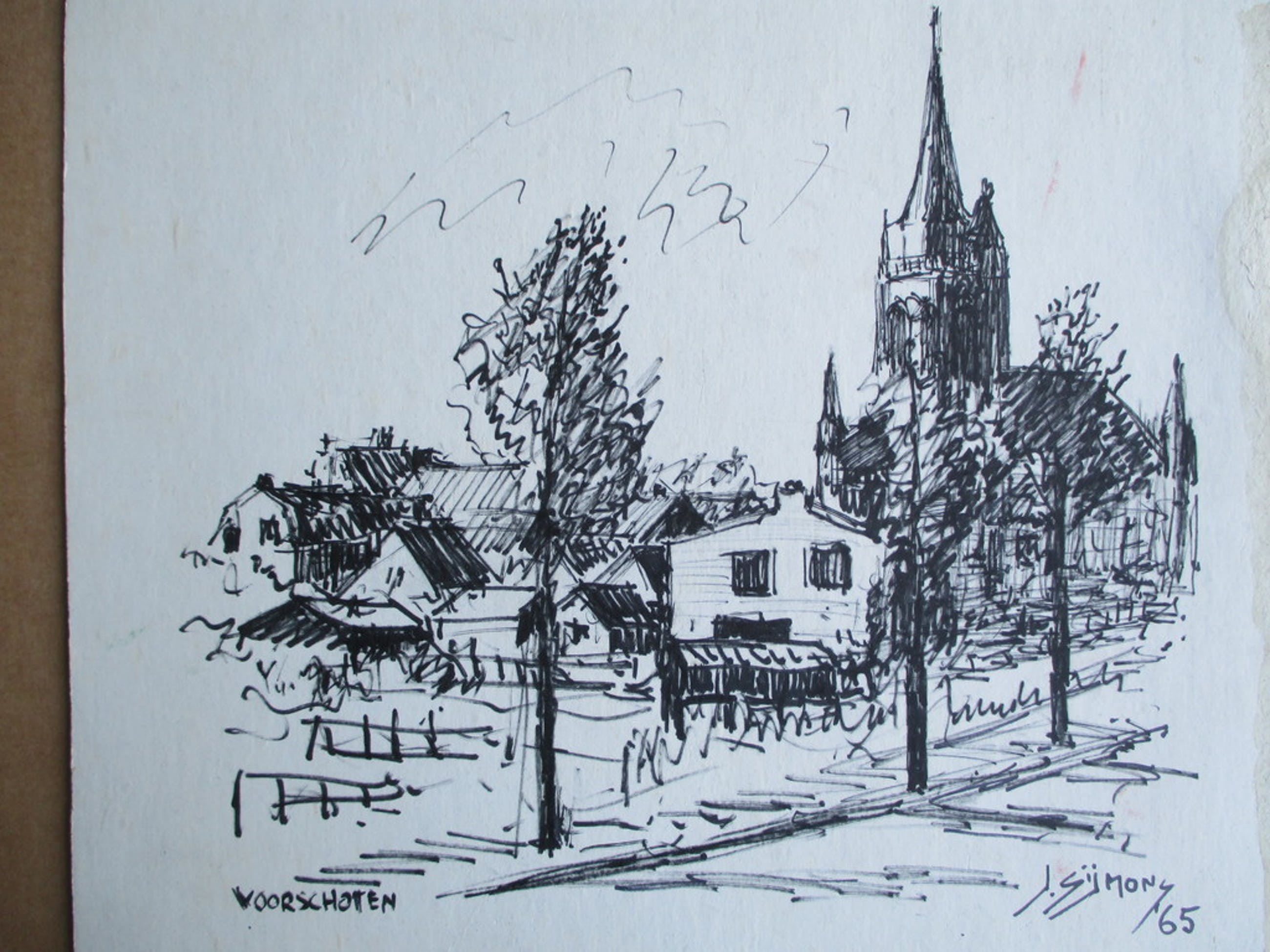 Jan Sijmons (1918-), stifttekening op karton uit 1965. Titel: Voorschoten. Afmeting karton: 31,5x30. R.o gesigneerd. Er zijn lijmresten van een passepartout op het karton achtergebleven. Zie hiervoor en voor de verdere staat de foto's. Dit werk is afkomstig uit de nalatenschap van Harm Kamerlingh Onnes (schilder, 1893-1985).