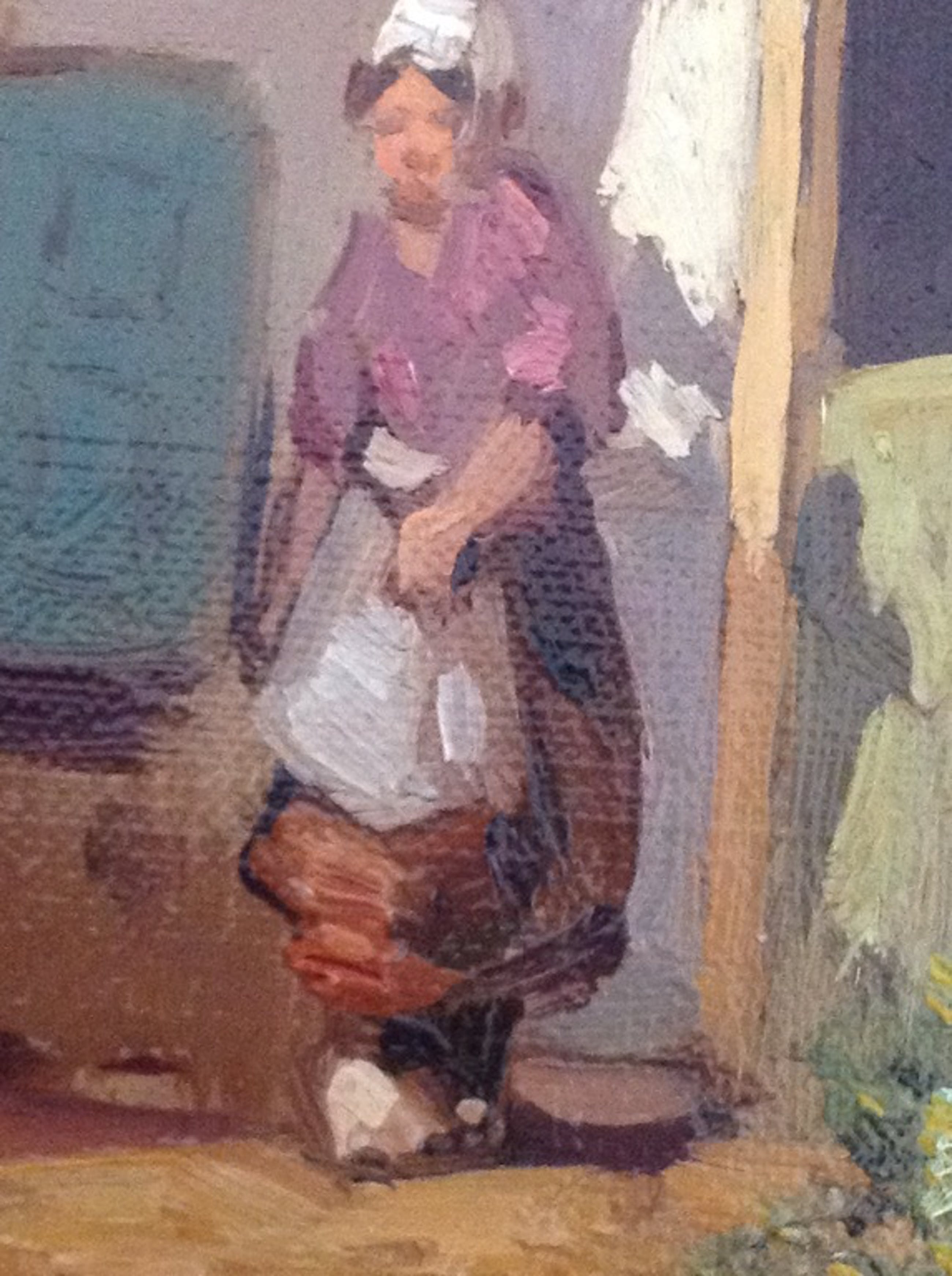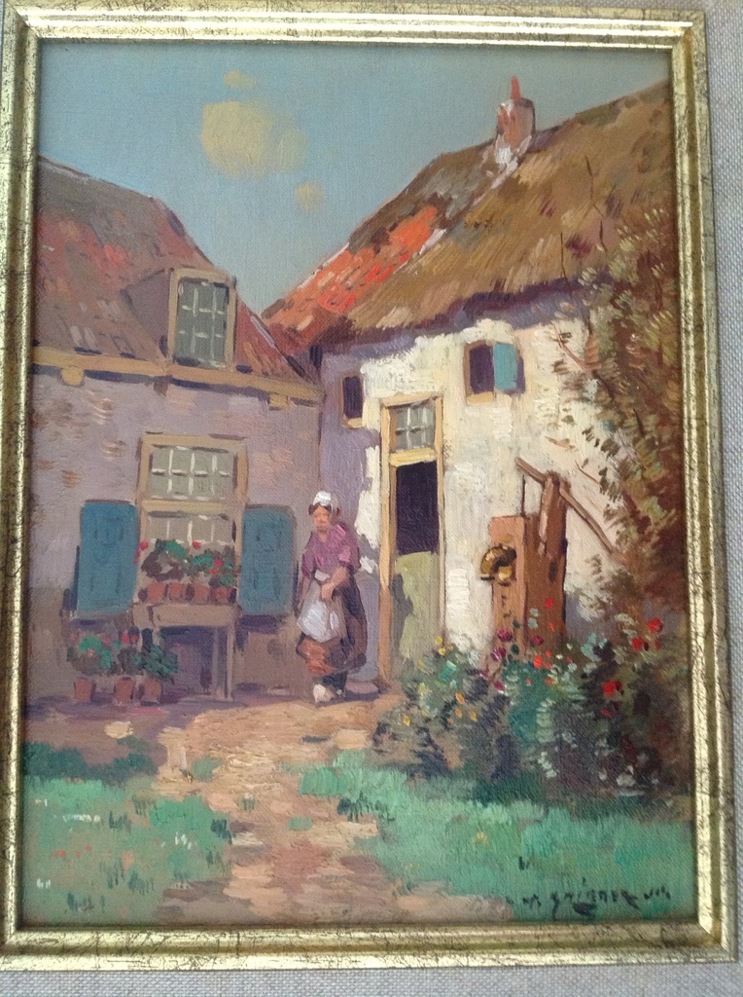 Leuk schilderijtje van Knikker. Boerenerf met boerin.