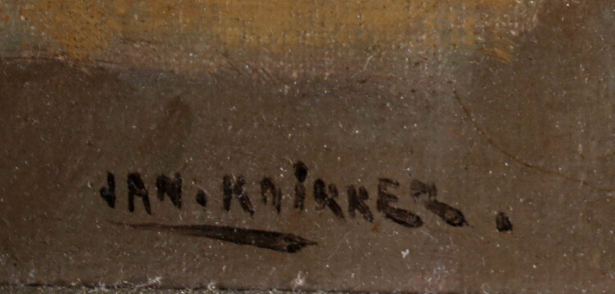 | Vergeelde vernis, oppervlaktevuil, randschade door de lijst, punaisegaatjes in de hoeken. De lijst bevat oppervlaktevuil, slijtschade door de tijd. | |