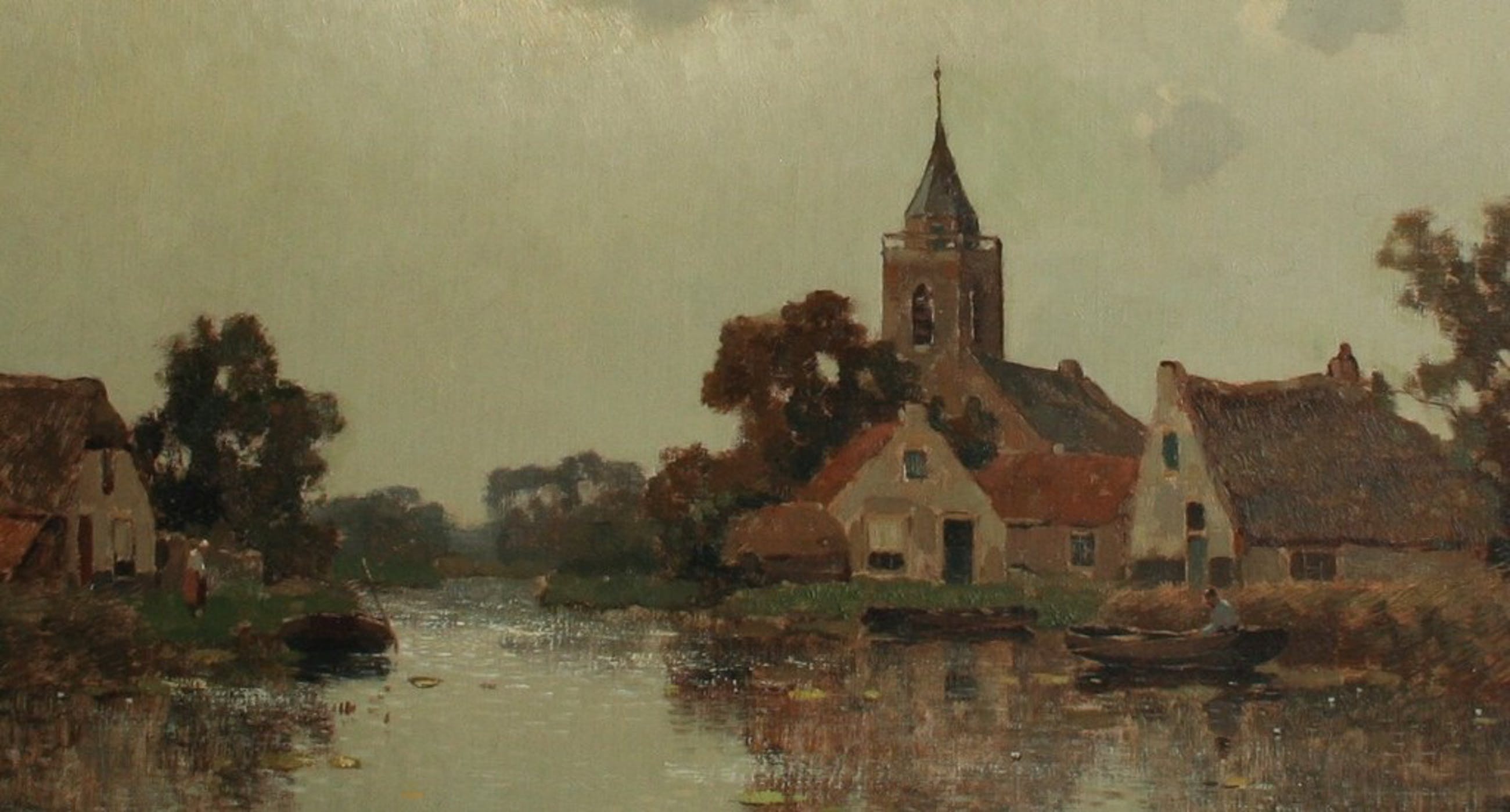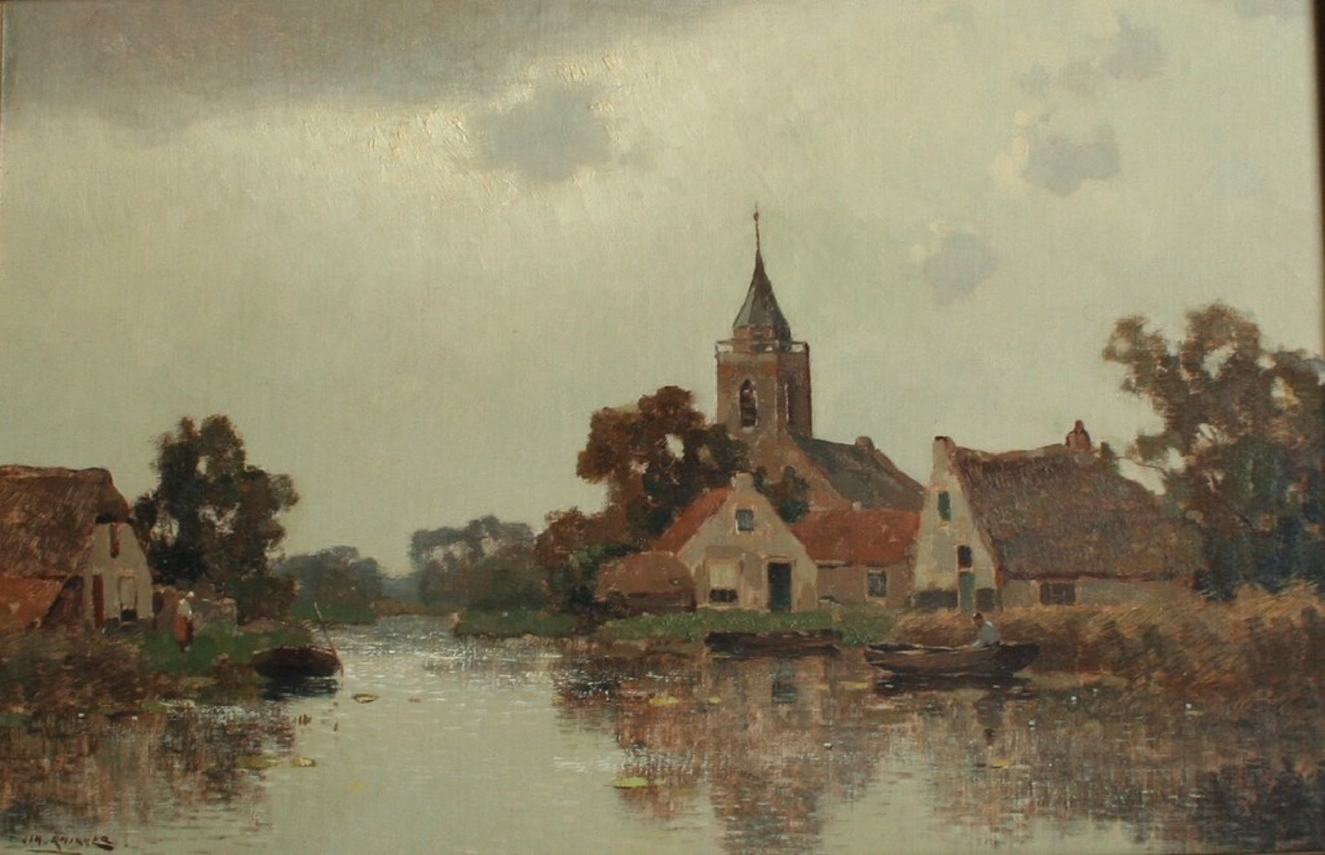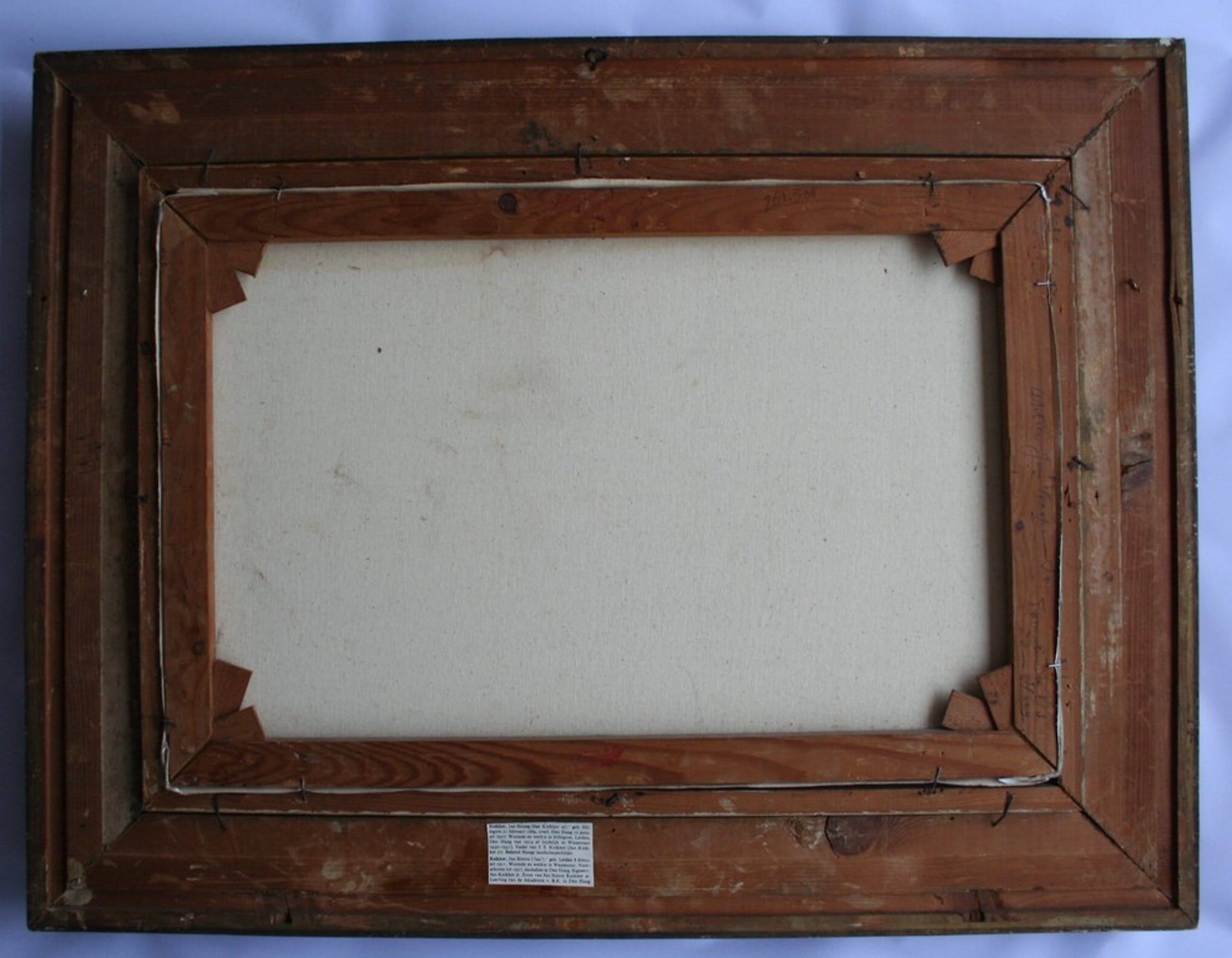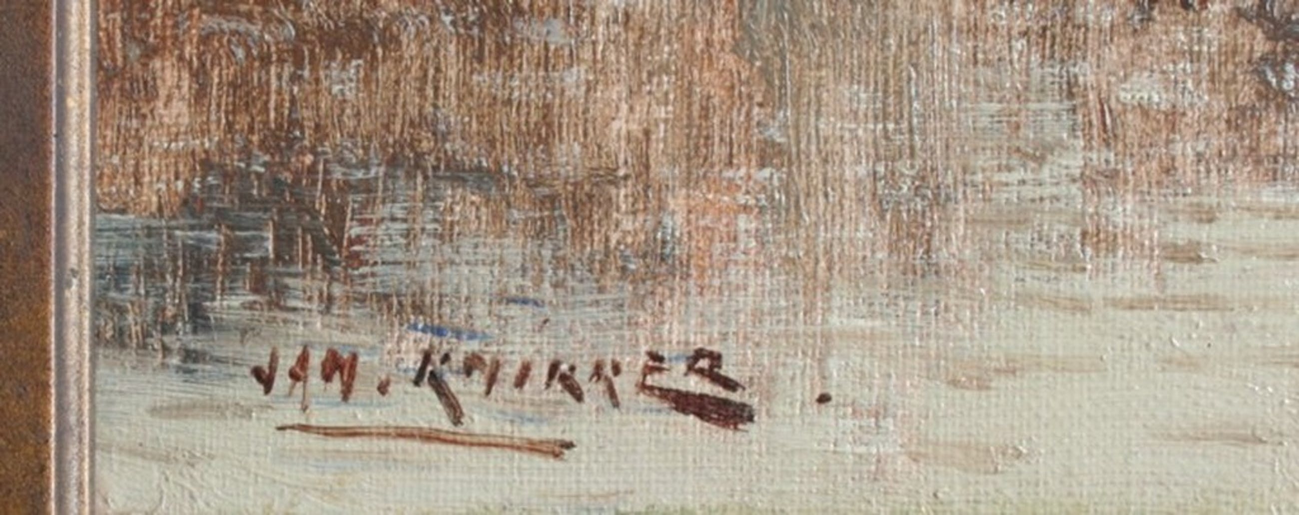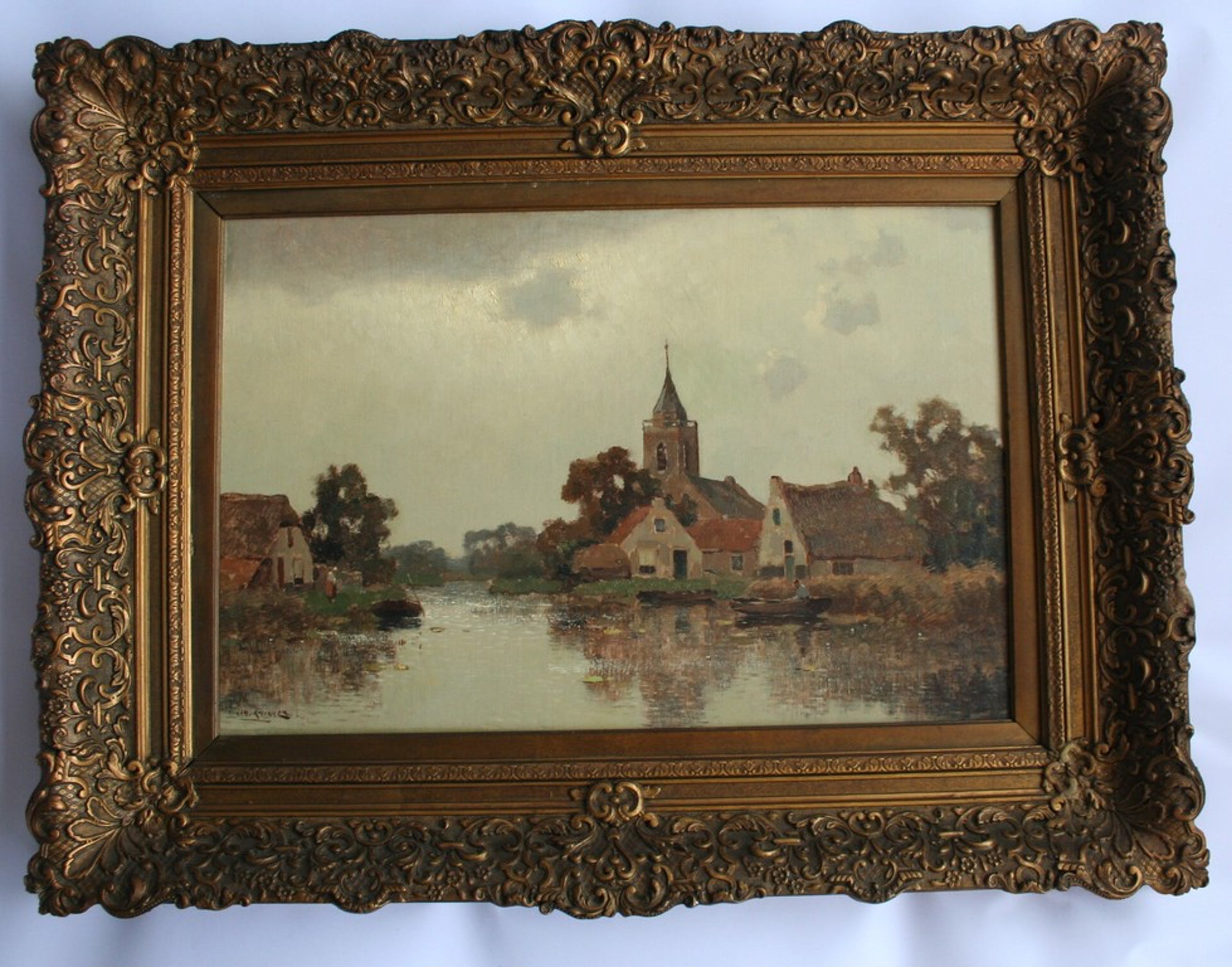Schilderij van Jan Simon (Jan) Knikker (1889 - 1957). Doek is 60,5 x 40,5. In klassieke lijst met ornamenten, afmeting 83 x 63 cm. Lijst is 6 cm. dik. Lijst heeft enig craquelé en is op twee plaatsen gerestaureerd. Nietemin een sfeervol geheel. Linksonder gsigneerd met Jan Knikker.