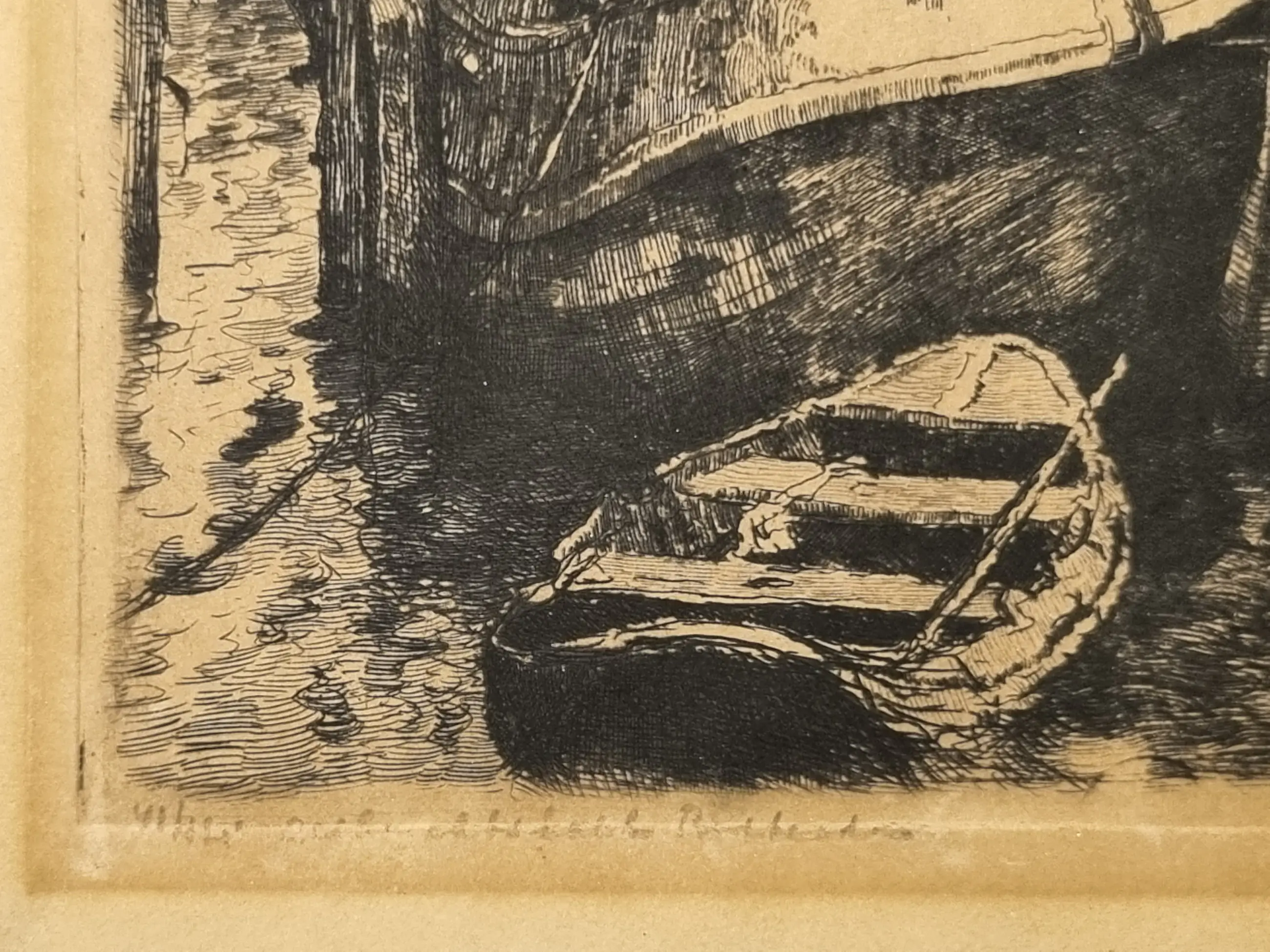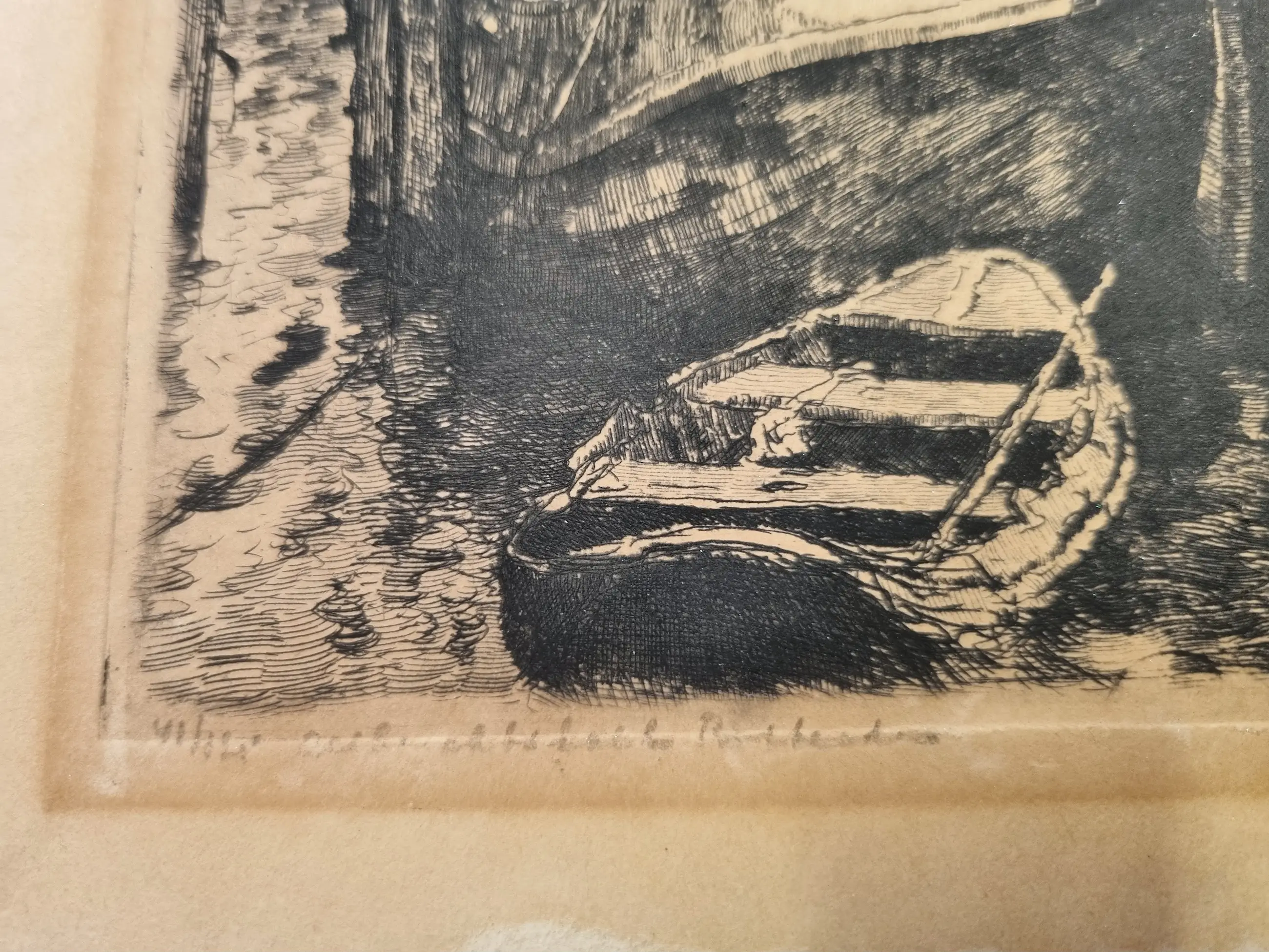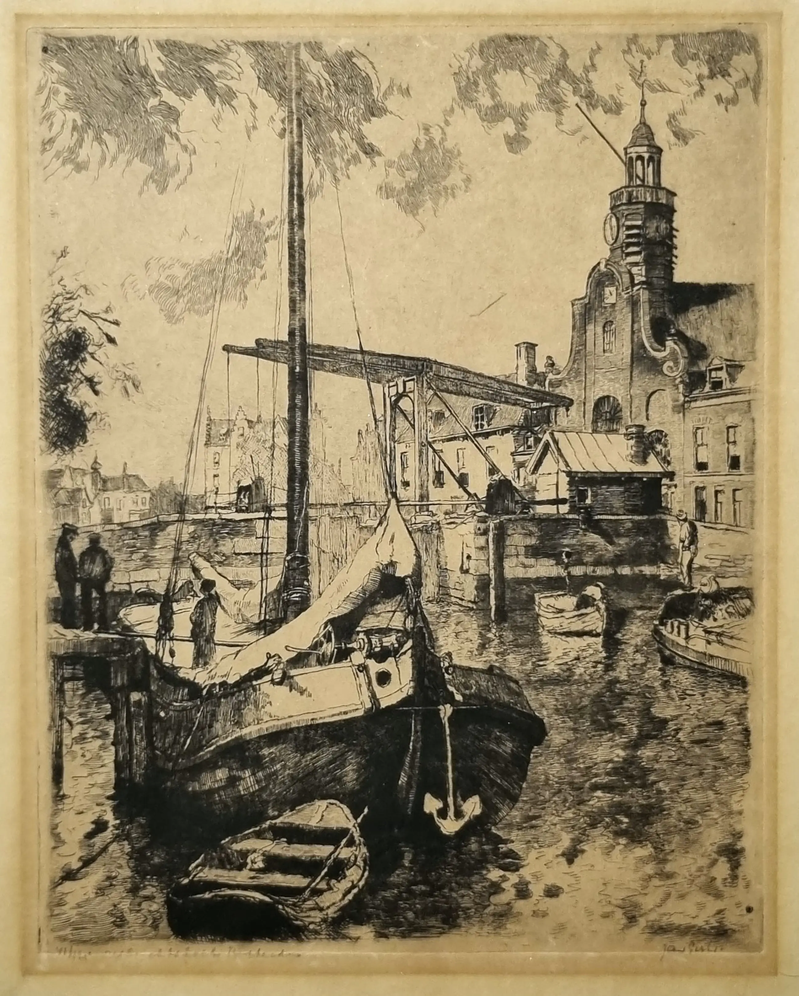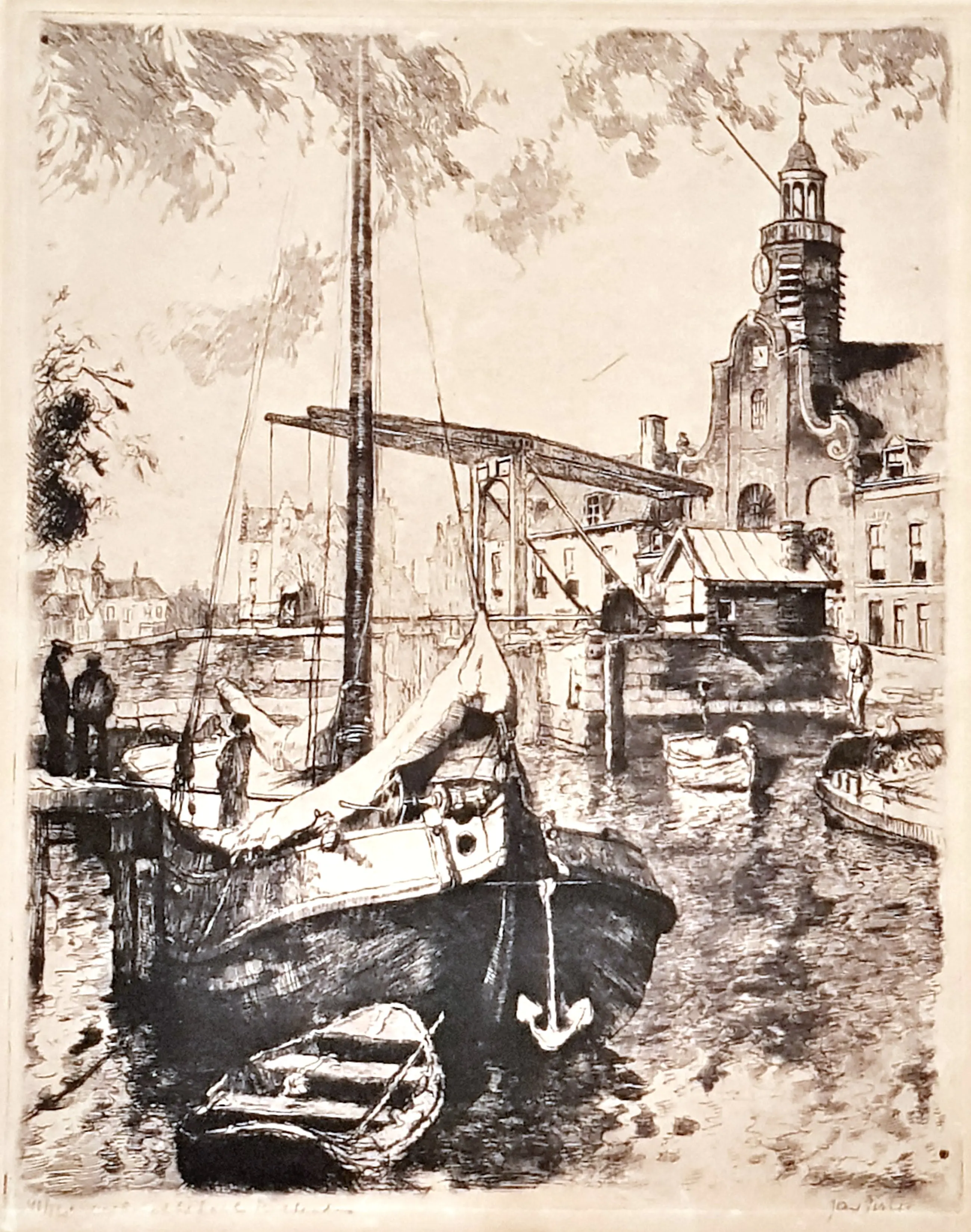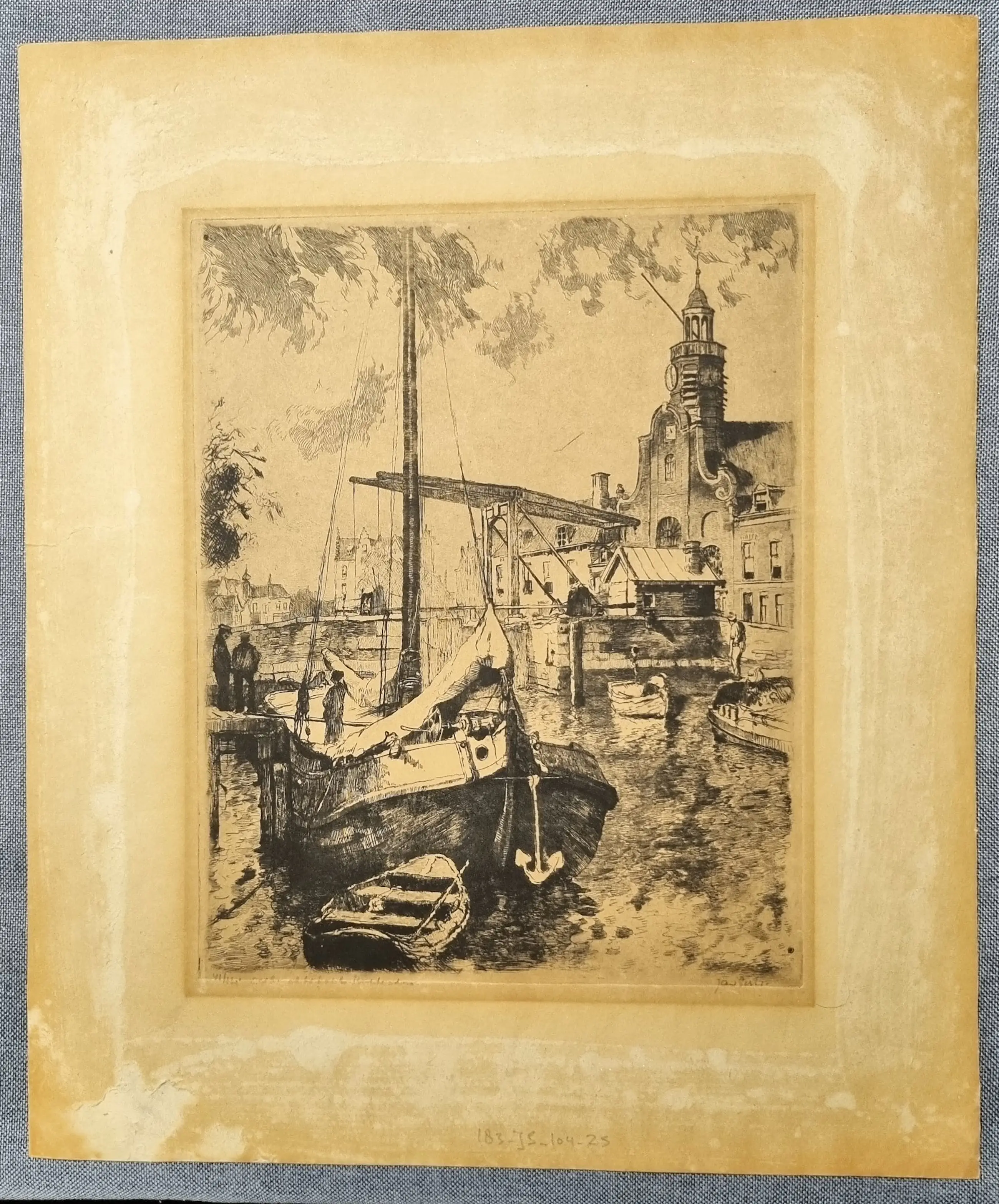 | De ets is onderdeel van de Rijnmond Toen collectie en is indertijd bij inname zorgvuldig gereinigd, zuurvrij gemaakt en vervolgens opgeslagen in een zuurvrije archiefdoos. In de marge links, ruim buiten het afbeeldingsgebied zit een oppervlakkig scheurtje, verso geseald met zuurvrij tape. (Zie de betreffende afbeelding) In verband met mijn leeftijd wordt de verzameling geleidelijk ingekrompen. In de collectie is van dezelfde ets een tweede exemplaar beschikbaar, zie voor het 2e exemplaar collectie nr. 139-JS. | |||||||||||