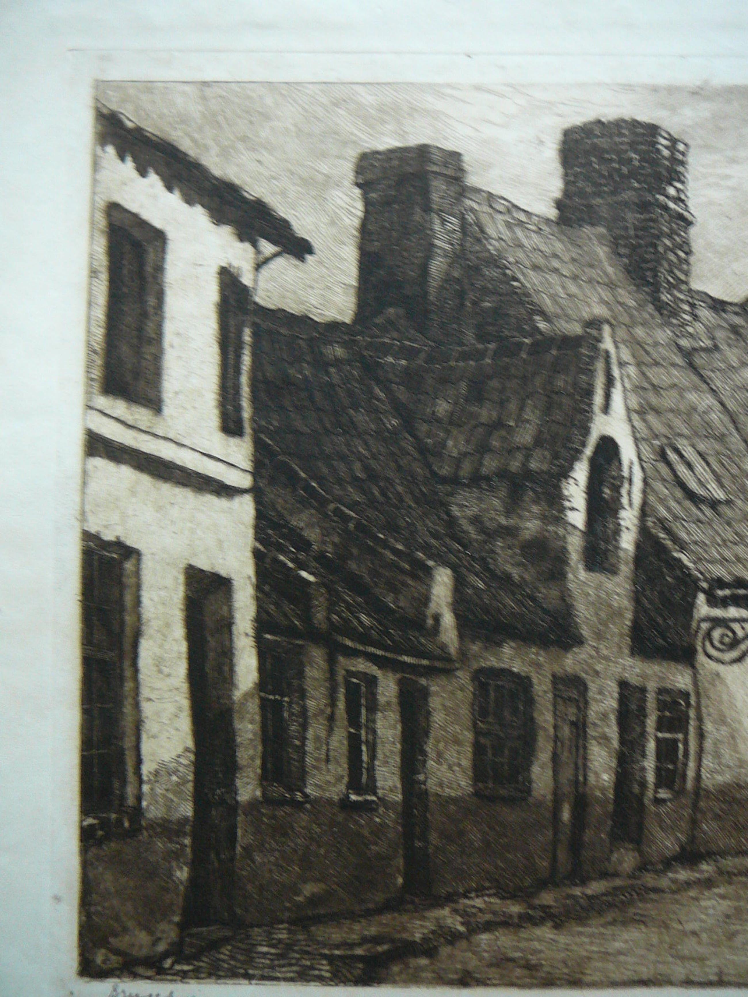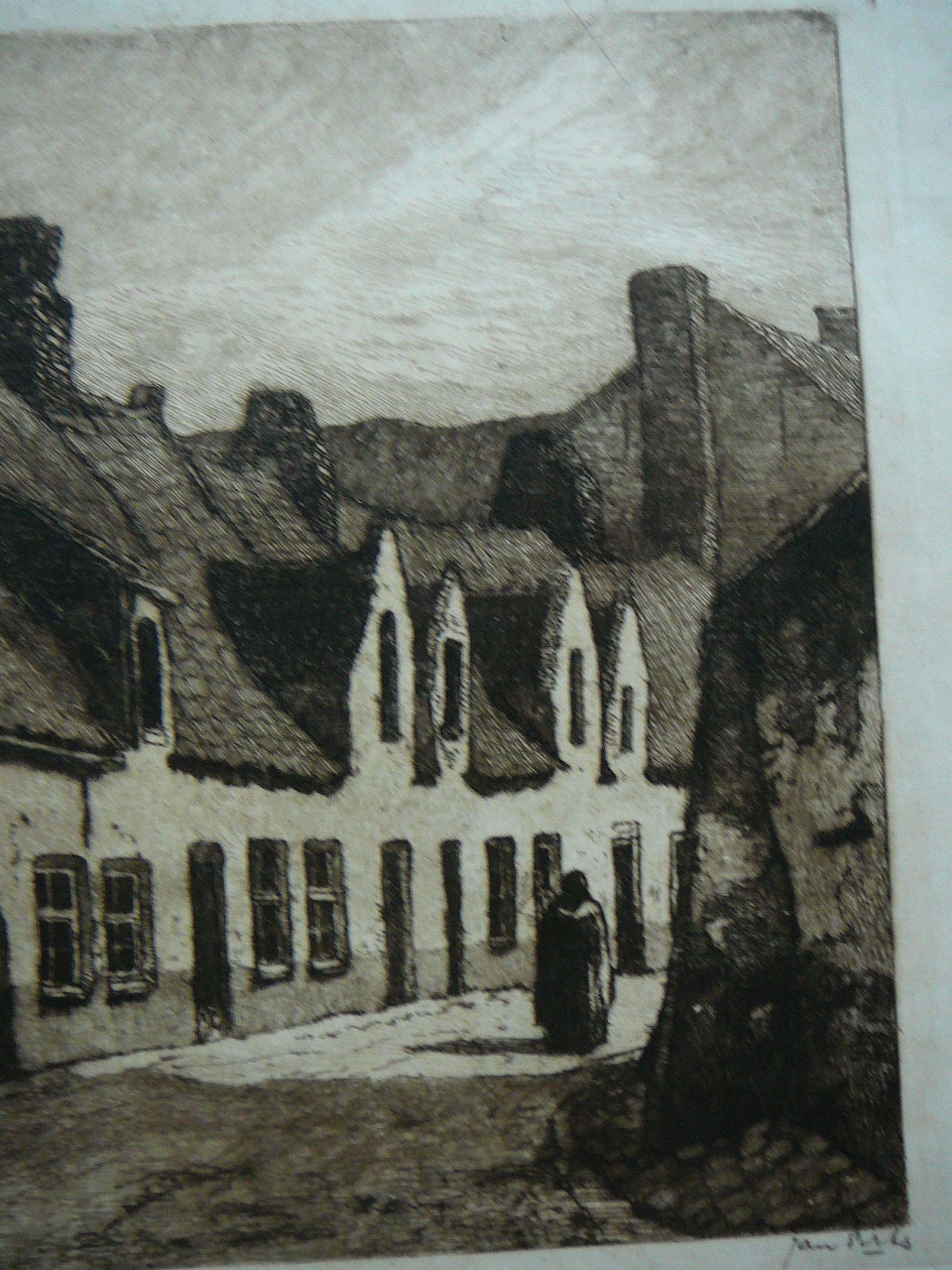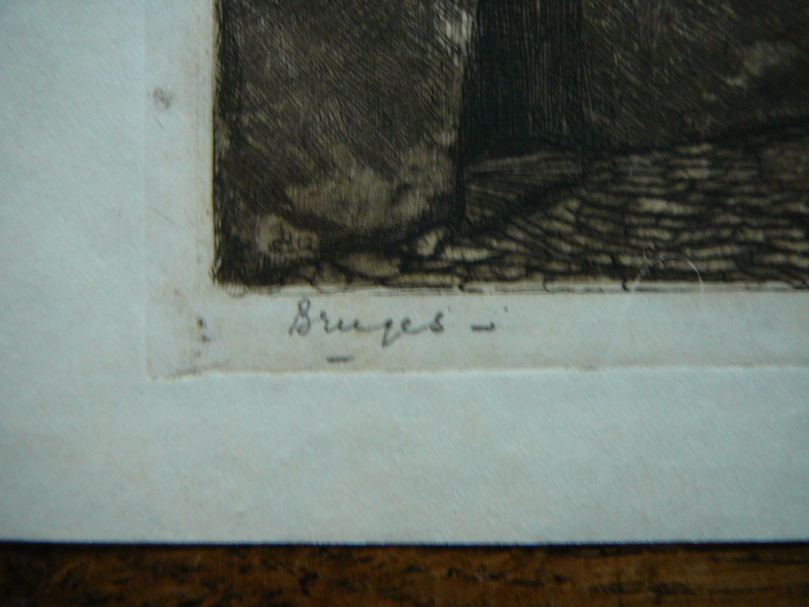 Zeer mooie ets van een oud straatje in Brugge In het najaar van 1912 maakte Sirks in het gezelschap van de Rotterdamse kunstenaar H.P.Groen een reis naar Vlaanderen. Eén van de plaatsen die zij bezoeken is Brugge Tijdens deze reis maakt hij enkele schetsen van een middeleeuws straatje, waaruit één van zijn vroegst gedateerde etsen De ets is in uitstekende conditie en met potlood gesigneerd en betiteld.