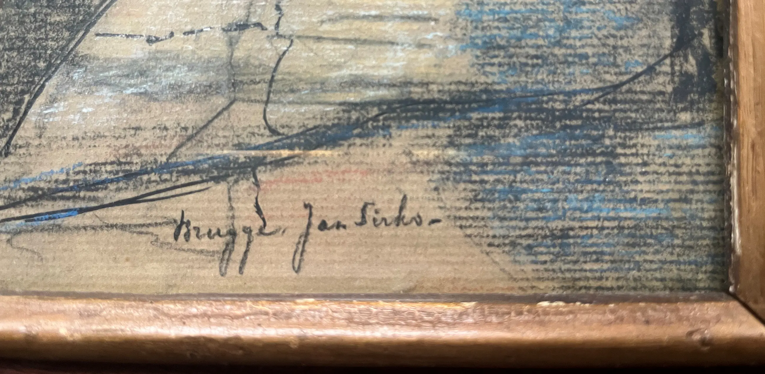 Dit werk heeft jarenlang bij mijn grootvader aan de muur gehangen, hij heeft het waarschijnlijk zelf ooit aangeschaft tijdens één van zijn bezoeken aan Brugge, waar familie woonde. Ook bij ons heeft het jaren gehangen, maar past niet meer in ons interieur.