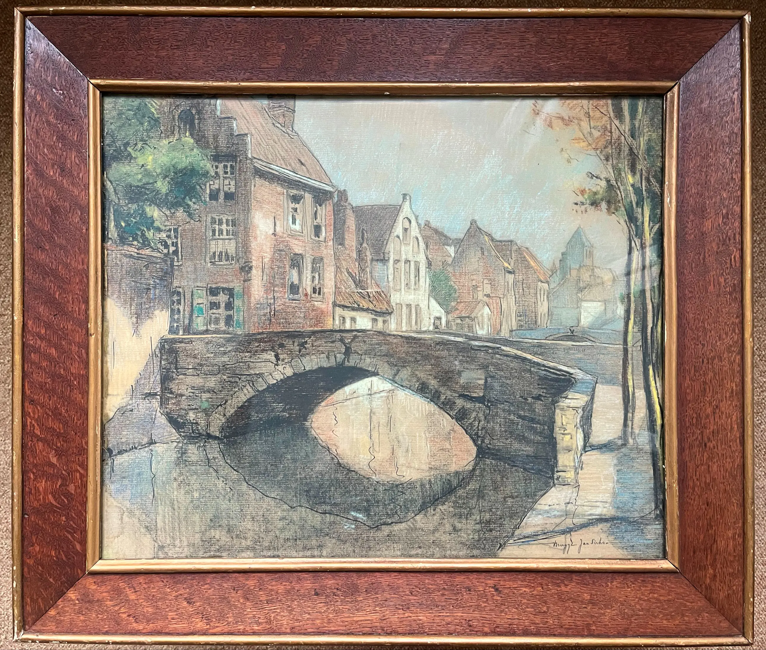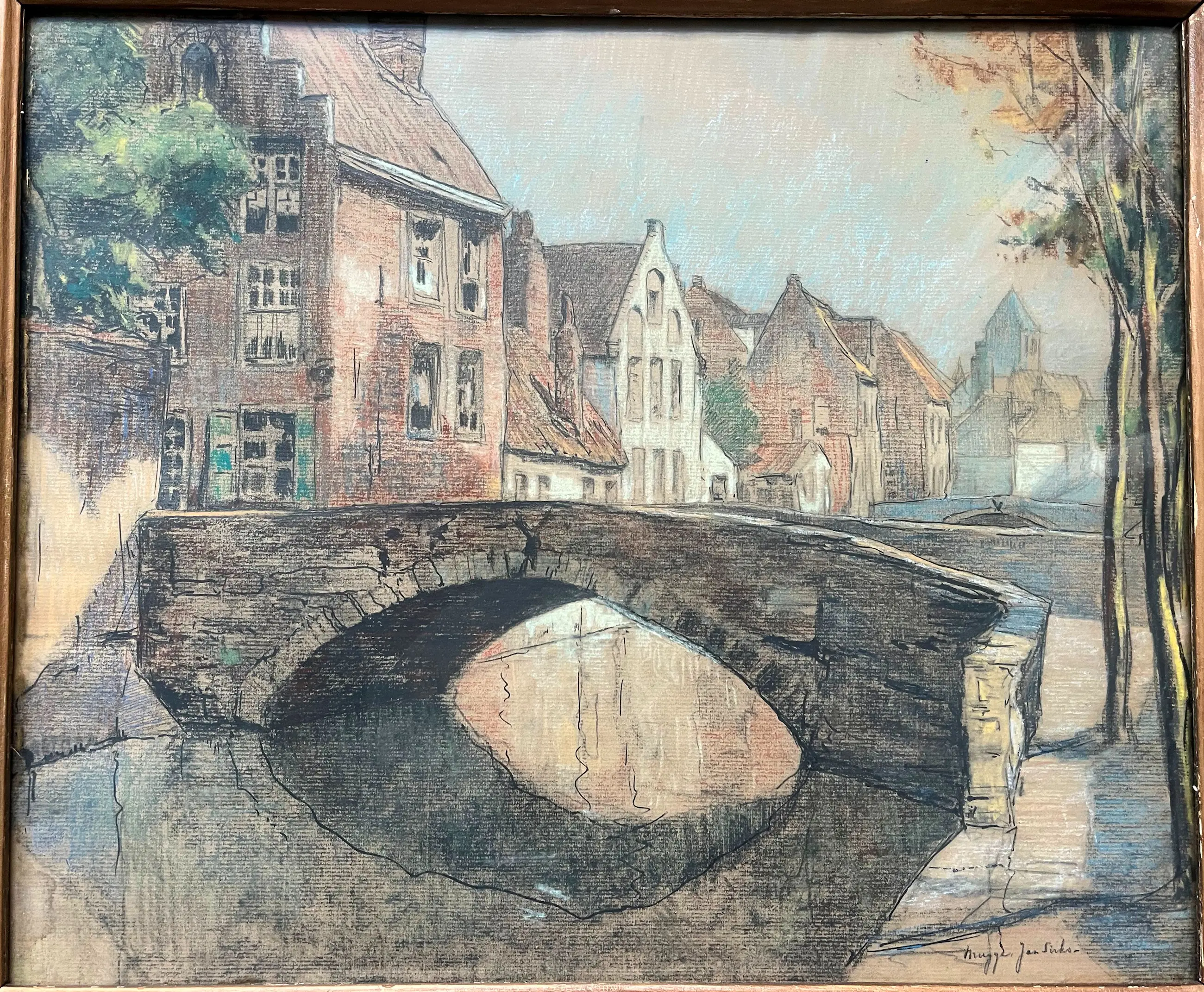 Tekening op papier in potlood en inkt, ingekleurd met potlood en krijt. Tekening van een tafereel uit Brugge, met bruggetje en oude huizen. Deze tekening is de basis voor een ets met dezelfde afbeelding, maar hier gaat het om de originele studie/tekening. Lijst is origineel (heeft lichte beschadigingen).