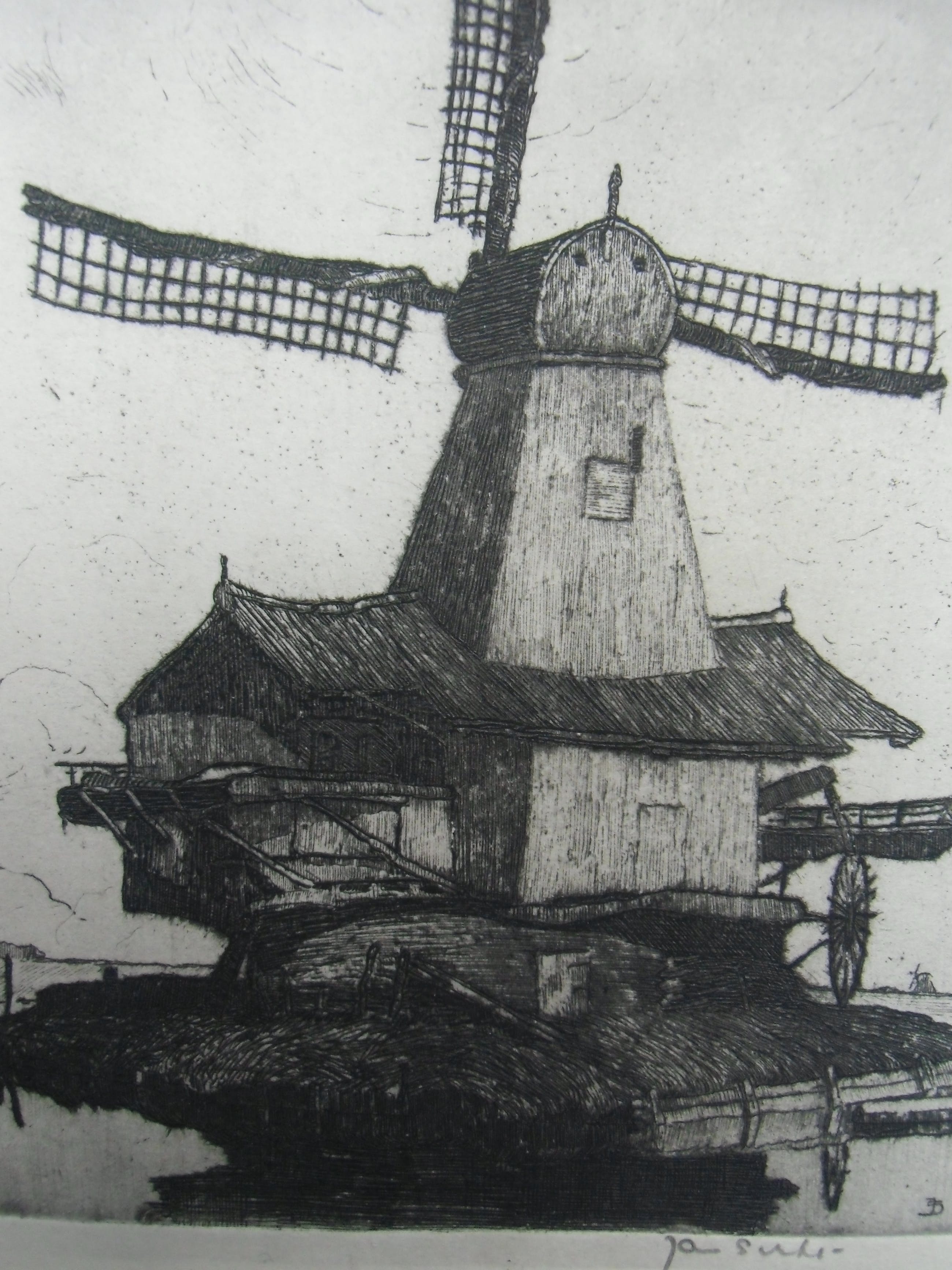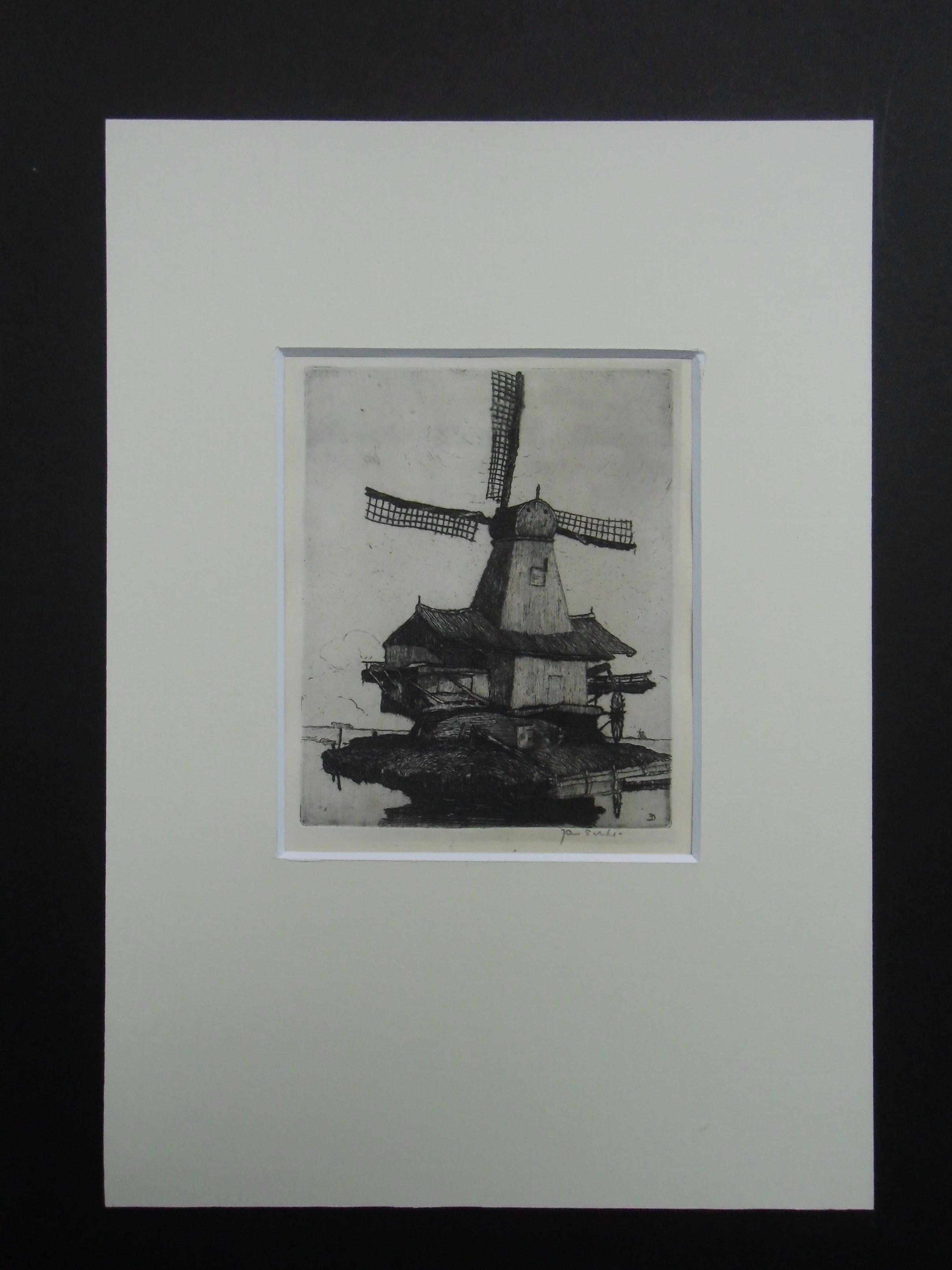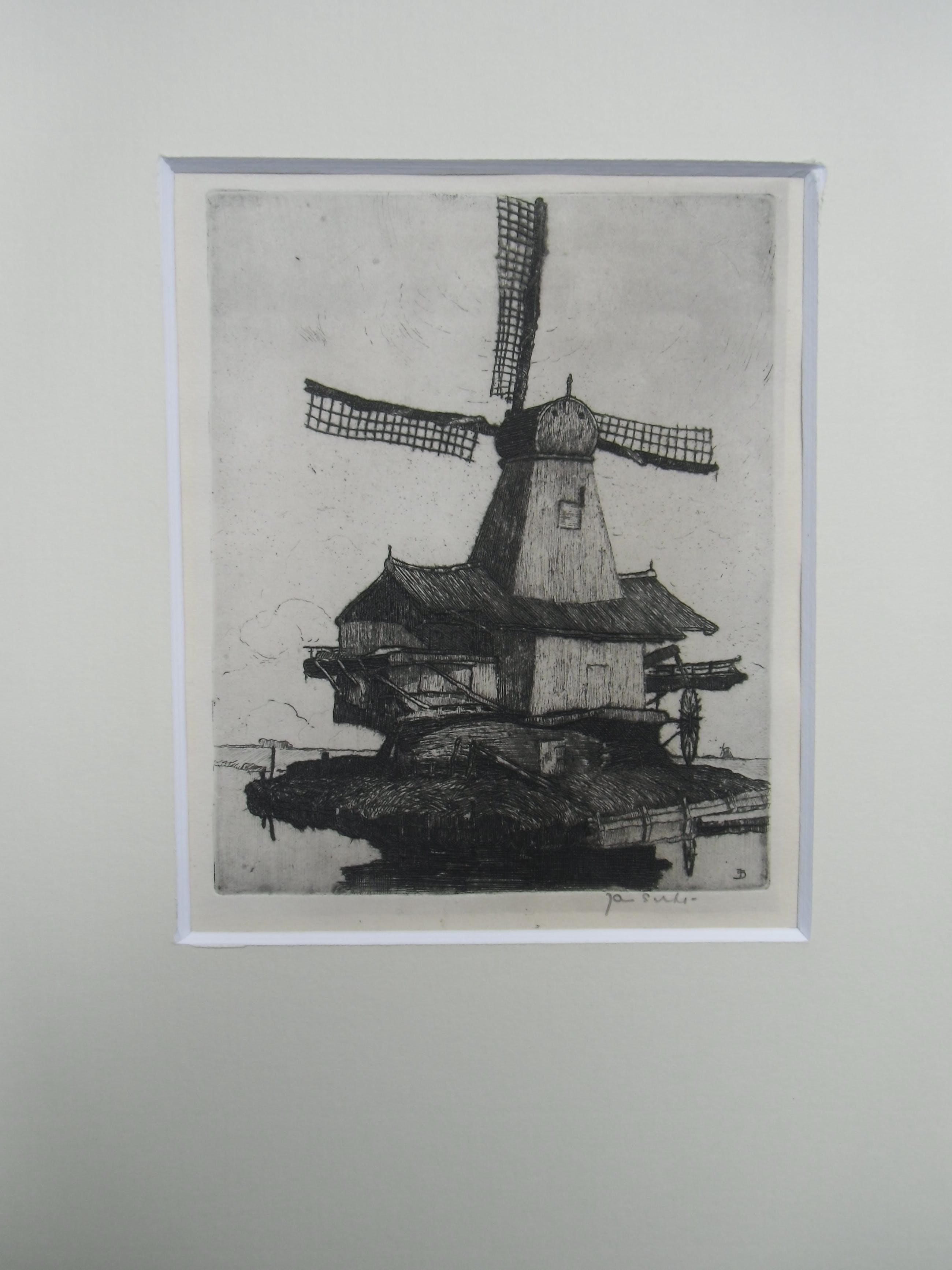 Het onderwerp van deze ets "De Houtzaagmolen " werd ook wel de gele molen genoemd en bevond zich in Overschie. De molen werd rond 1915 gesloopt. De ets is in prima conditie. De marges zijn tussen 1 en 1.5 cm. Gesigneerd met potlood en r.o. monogram.