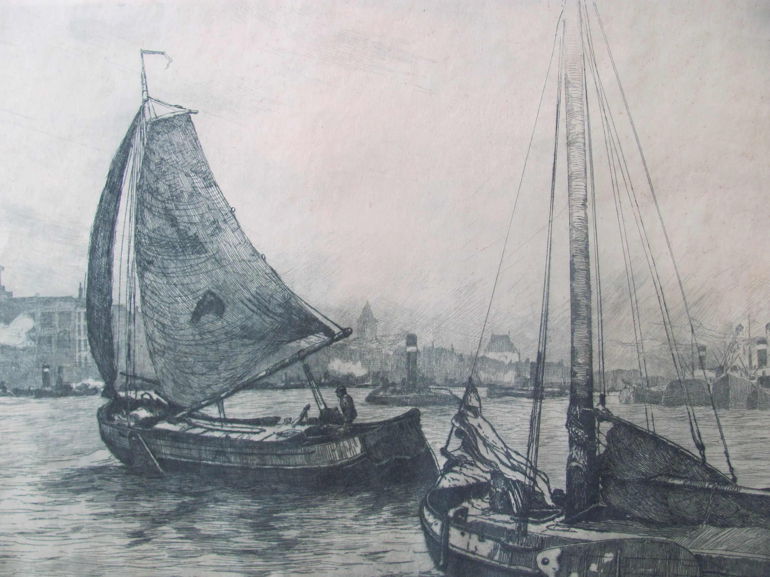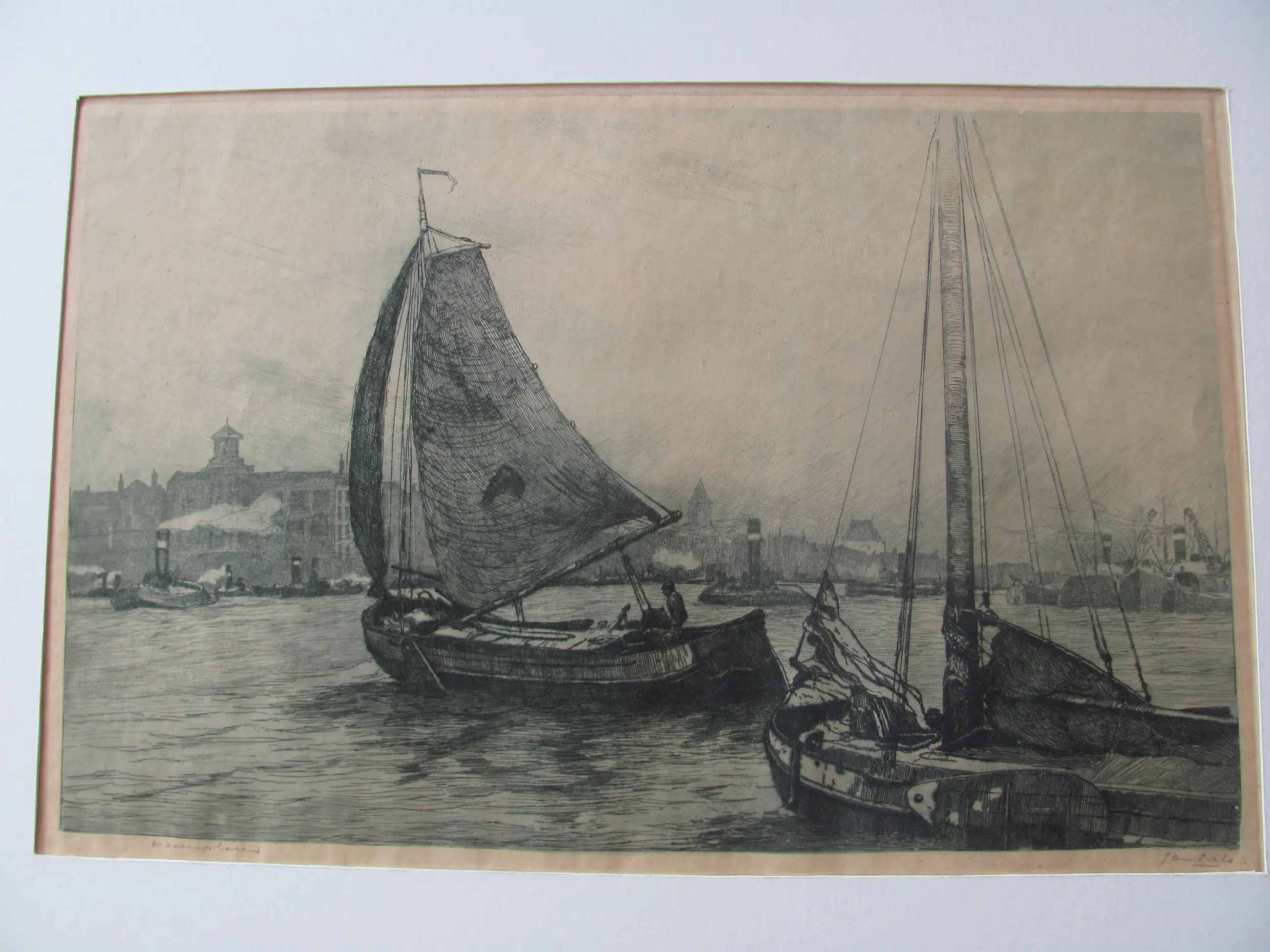 Ets van Jan Sirks van de haven in Rottedam. Gesigneerd: Rechtsonder met potlood. Linksonder staat met potlood genoteerd: 30 exemplaren.