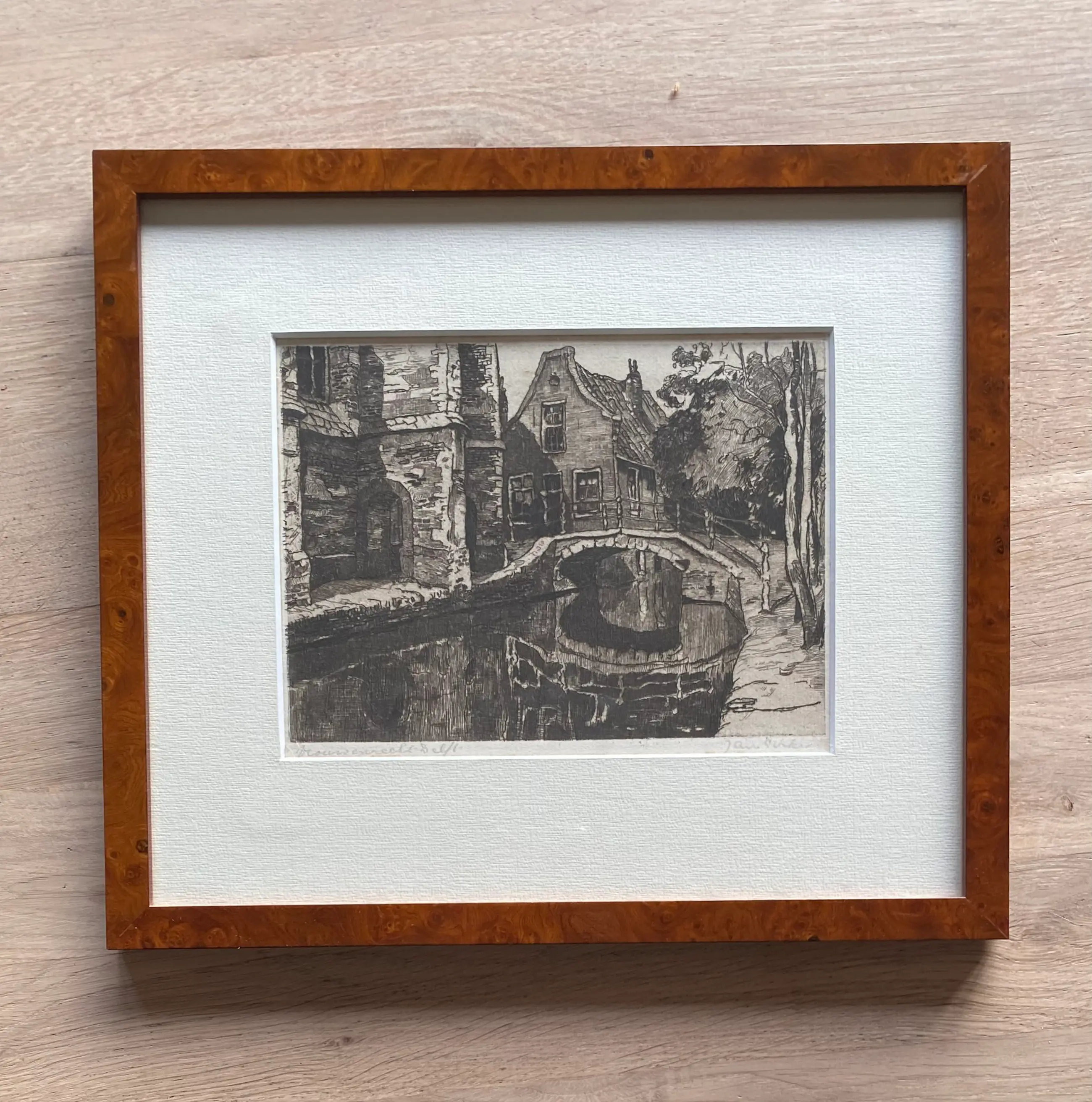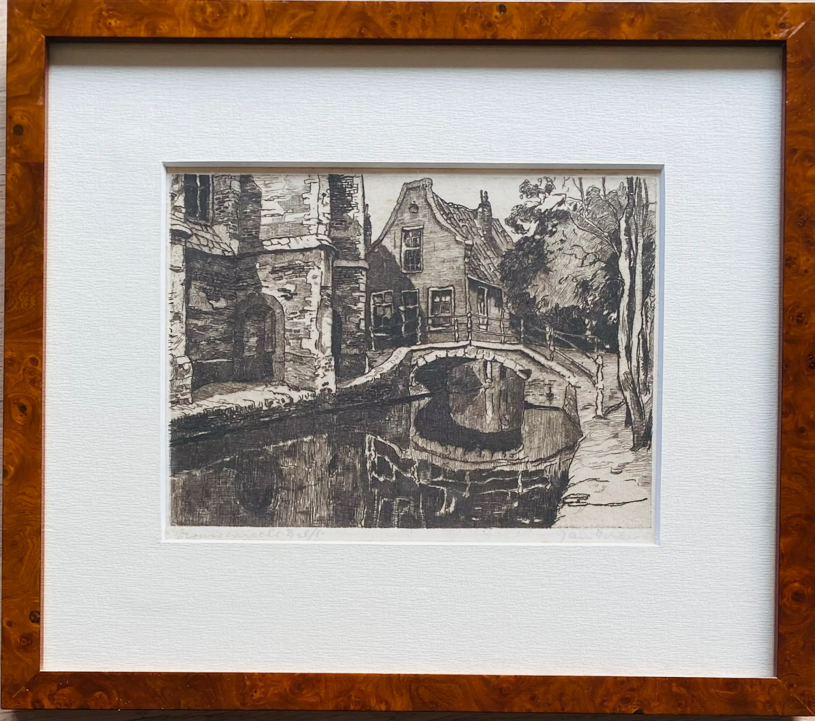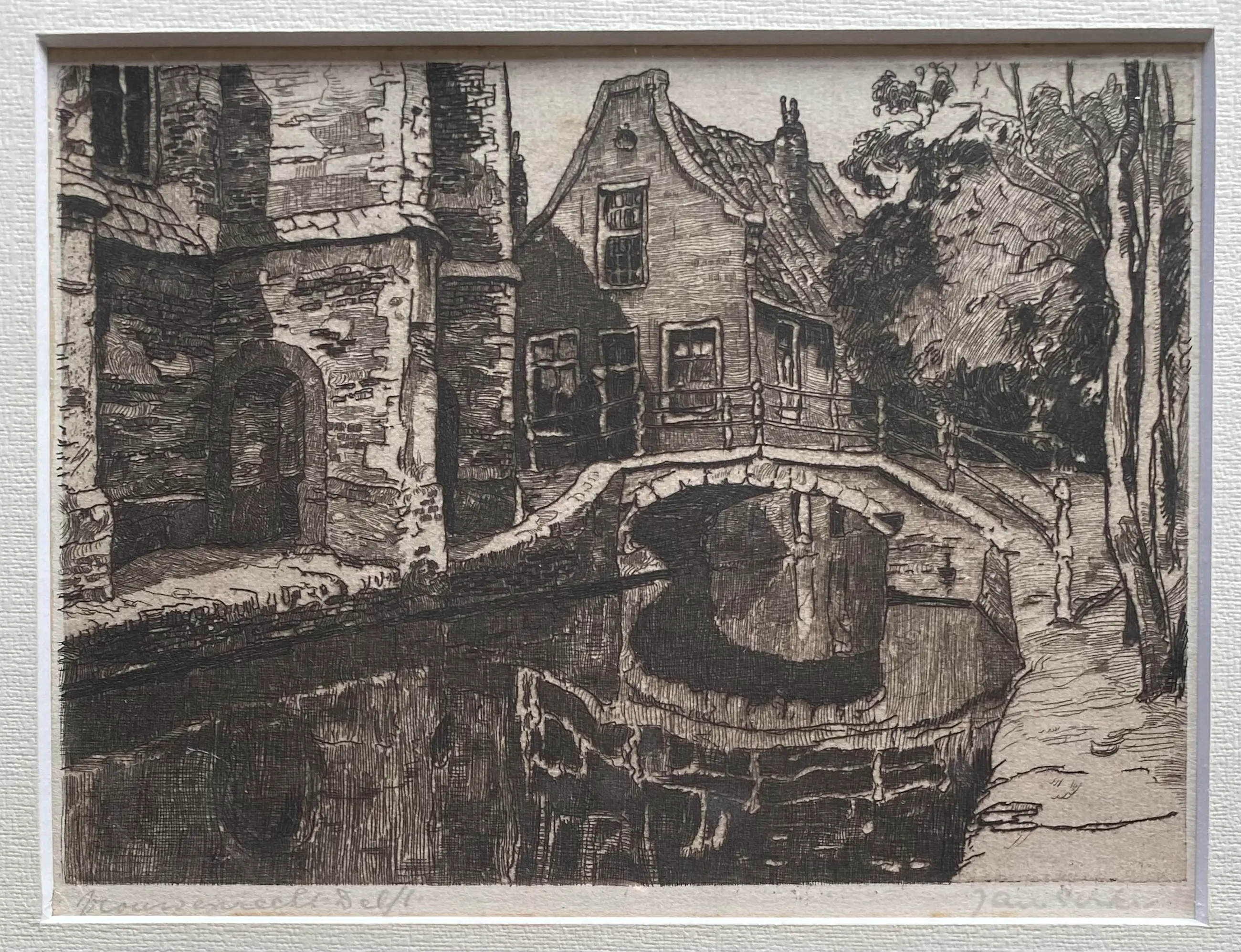 Prachtige ets van Jan Sirks met zicht op het bruggetje bij de Vrouwenregt/ Kerkstraat te Delft. Professioneel ingelijst. In zeer goede conditie.