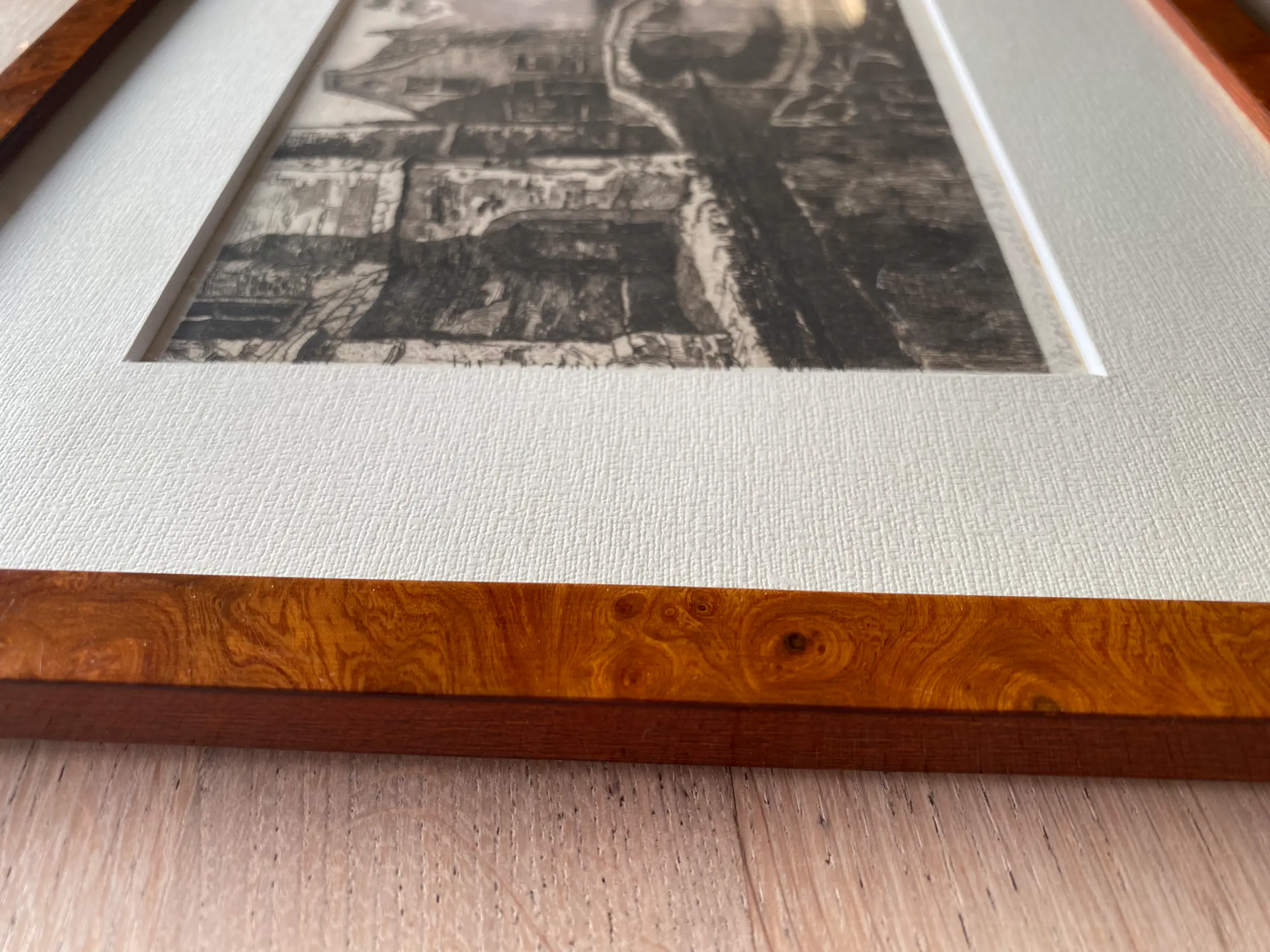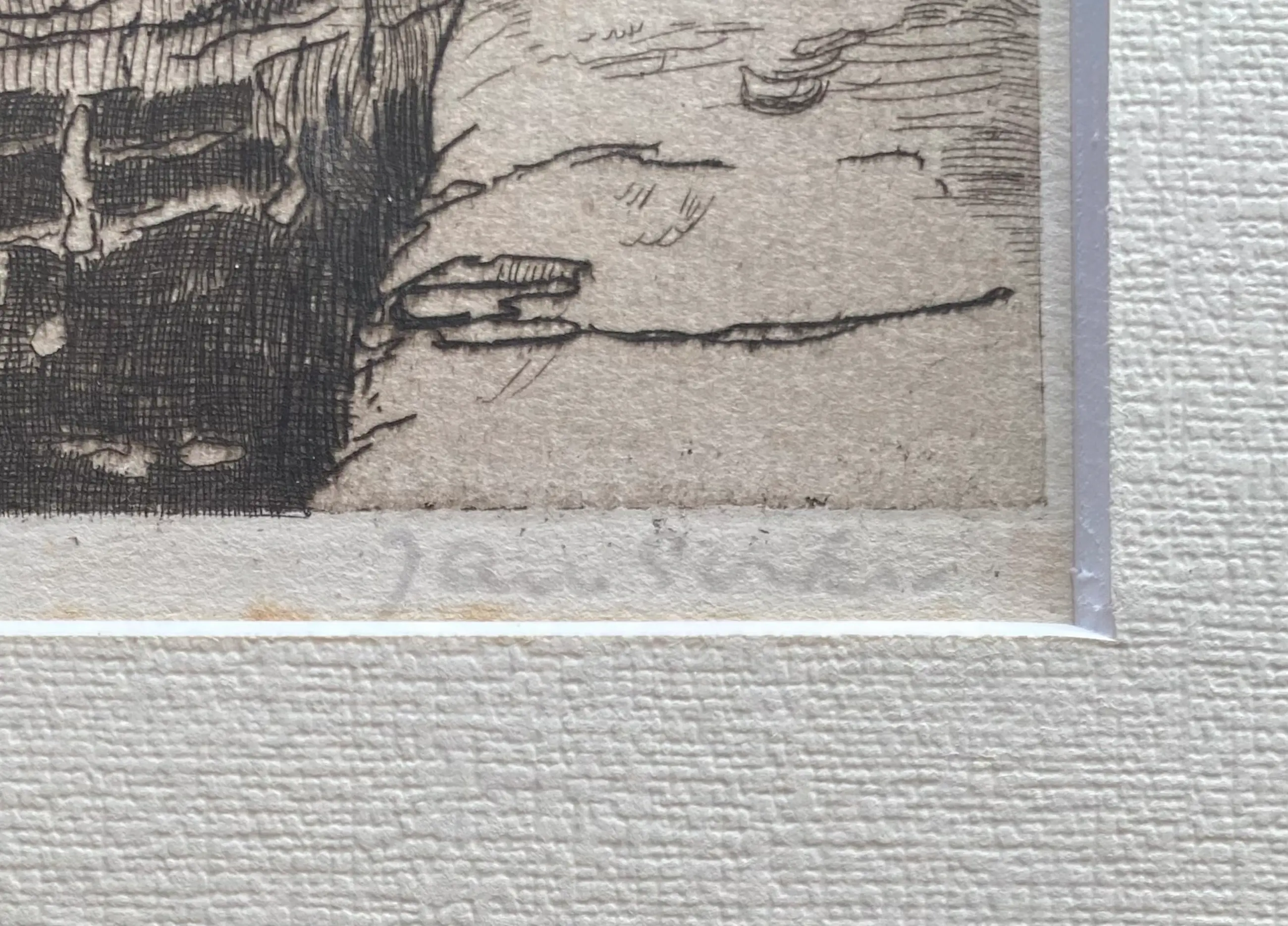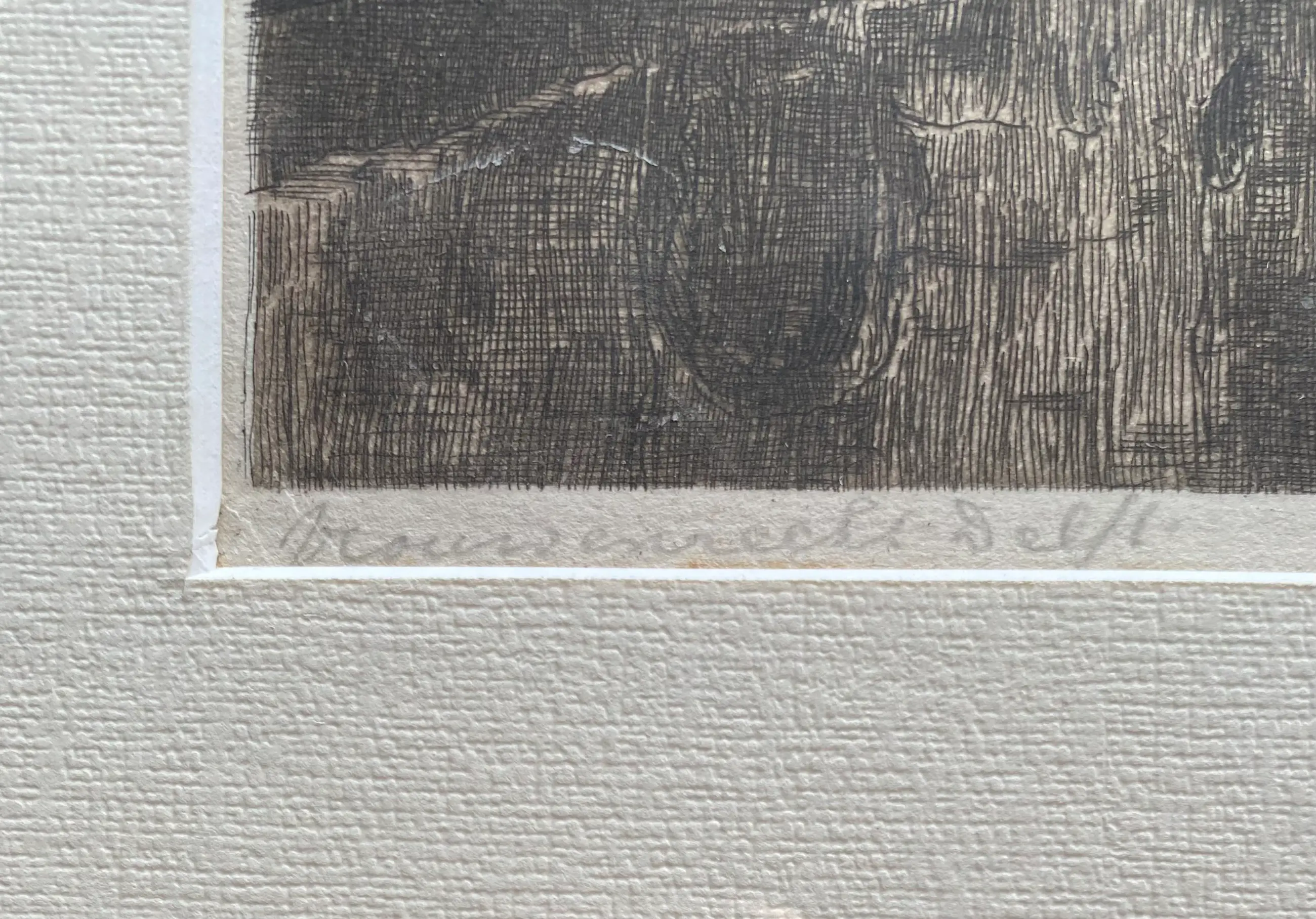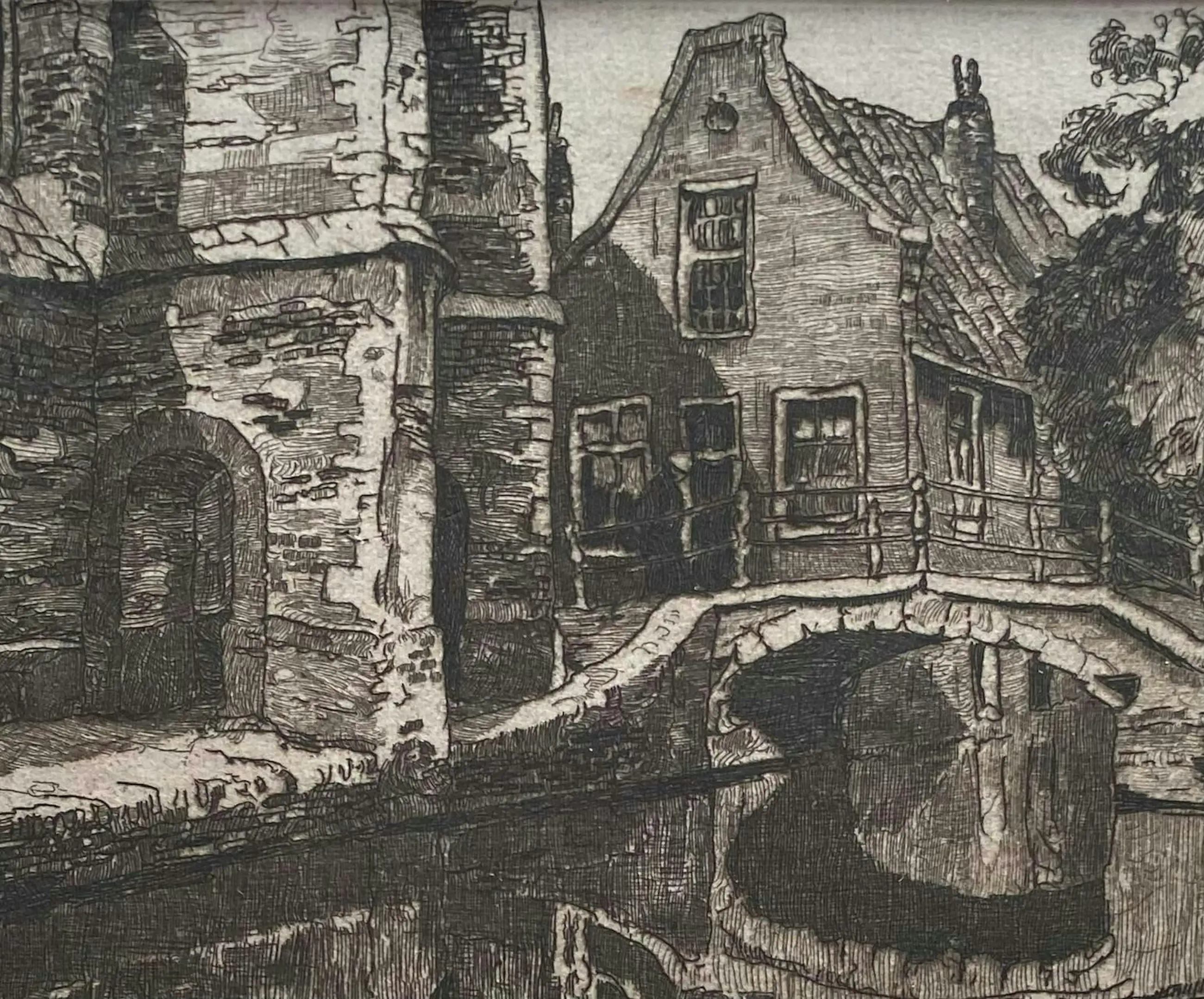 Prachtige ets van Jan Sirks met zicht op het bruggetje bij de Vrouwenregt/ Kerkstraat te Delft. Professioneel ingelijst. In zeer goede conditie.