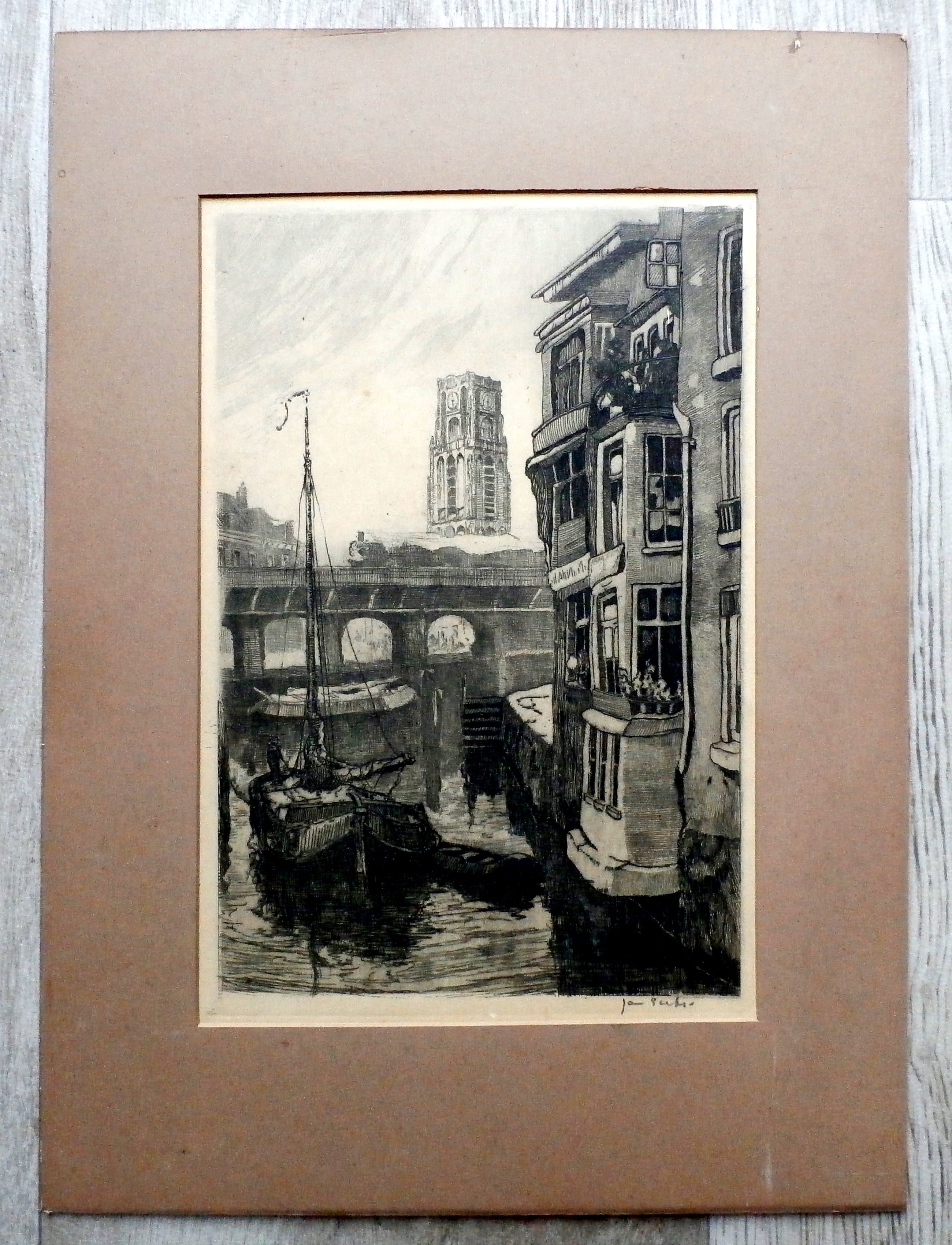 mooie ets van Jan Sirks van de kade van Rotterdam.
