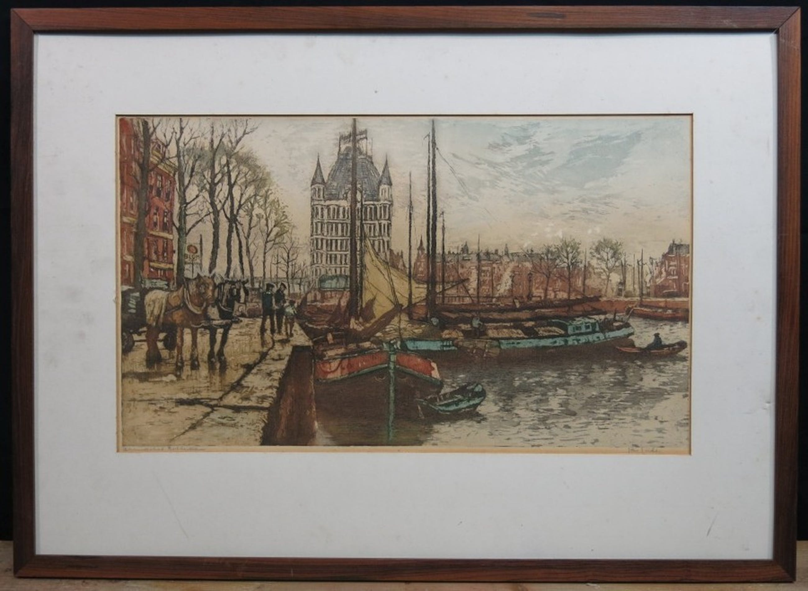 Conditie: Het beeld is in prima staat; rechts van het midden is het papier beschadigd, verder is er een egale verkleuring zichtbaar. Het werk is door ons uitgelijst na het nemen van de foto.
