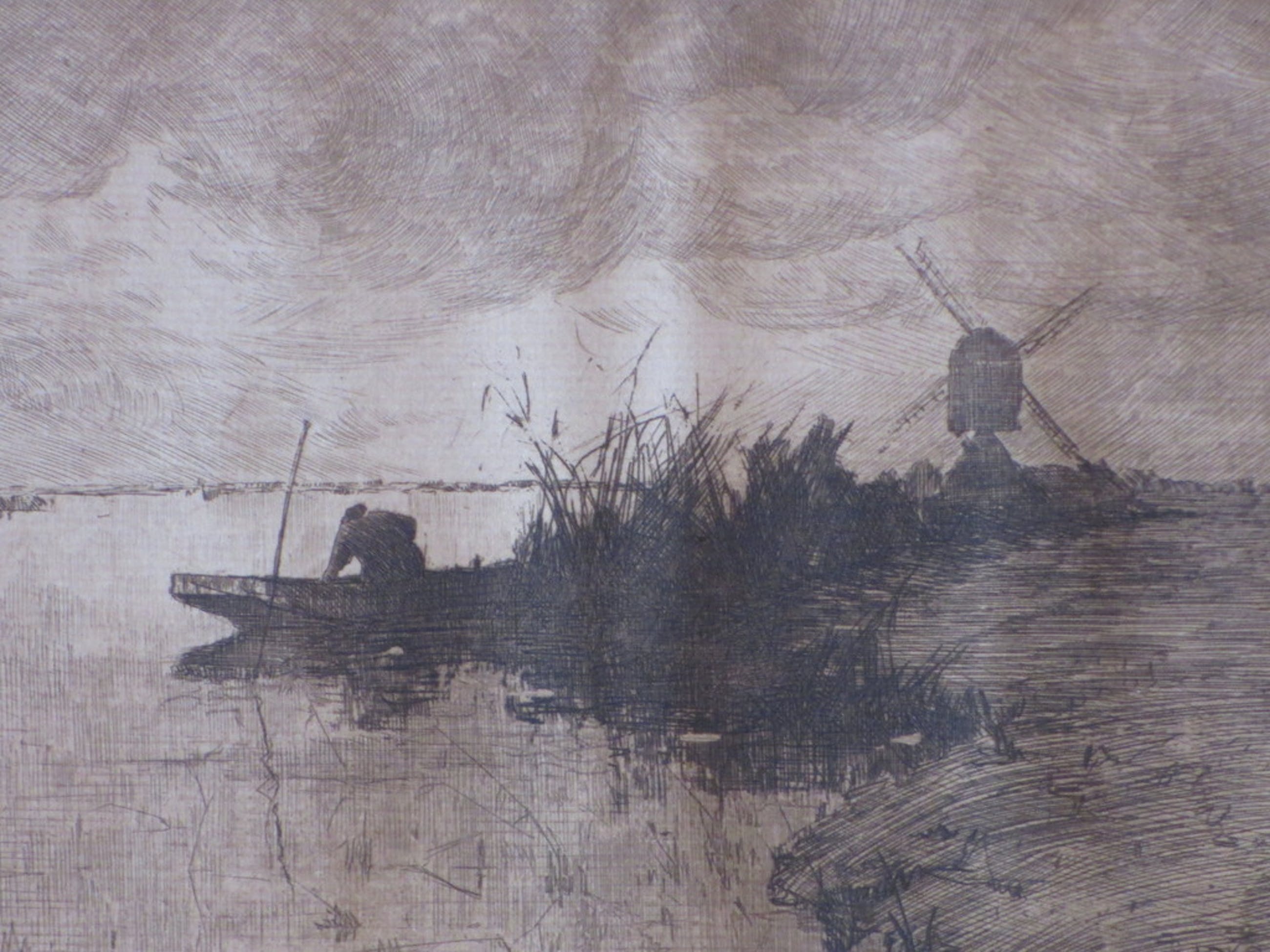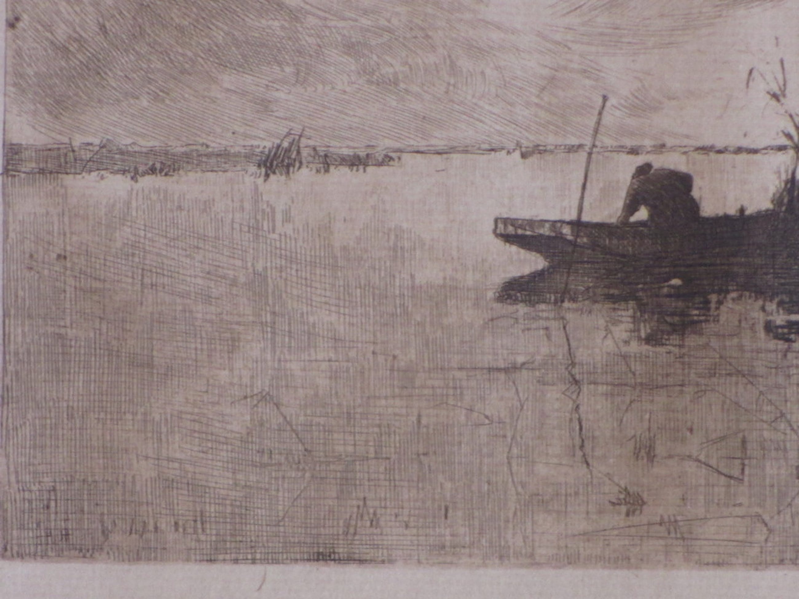 Voorstelling van een visser in een roeiboot op het water in de polder