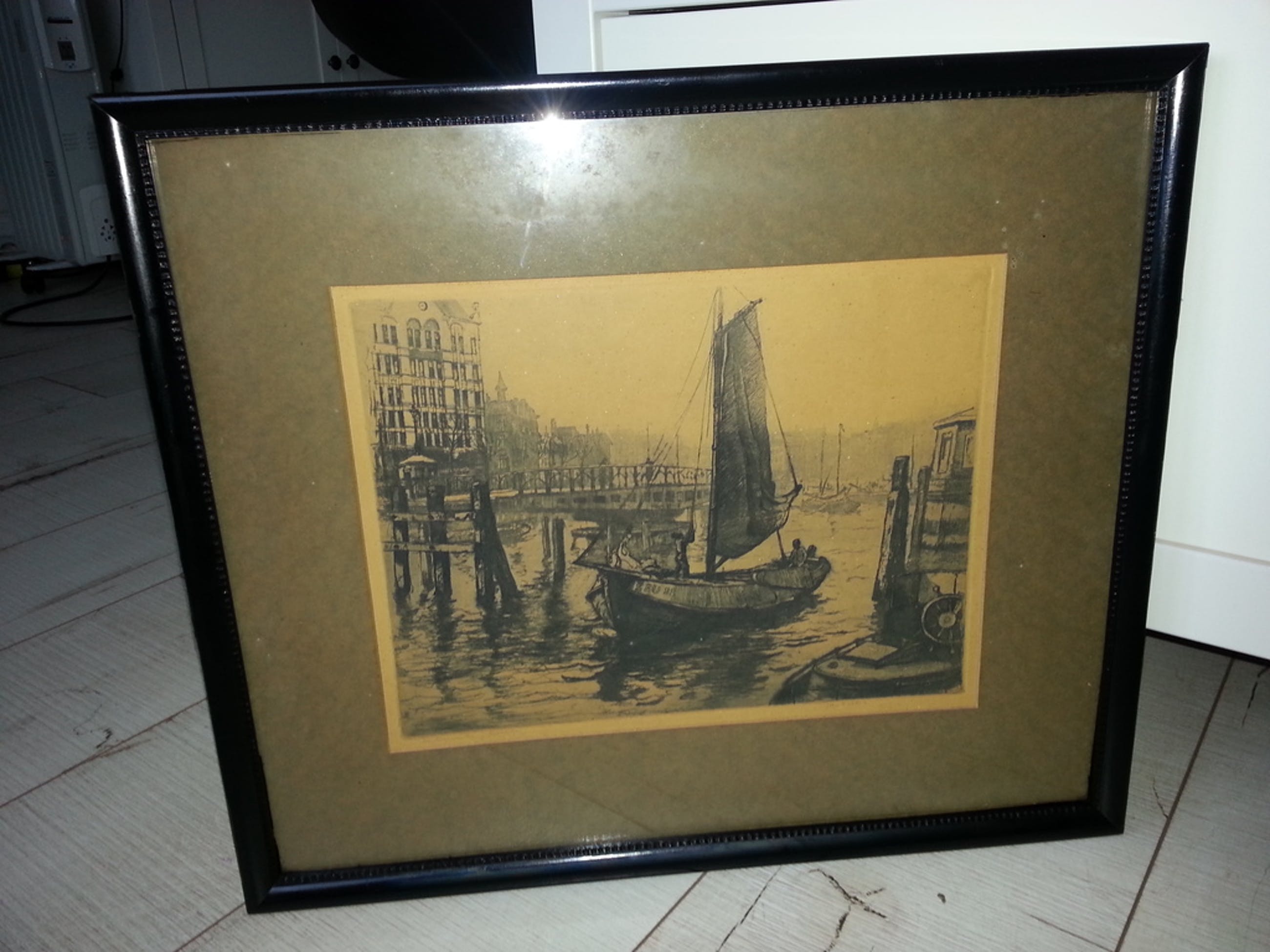 Lijst, ontspiegeld glas en ophangwerk. Kan zo aan de muur.