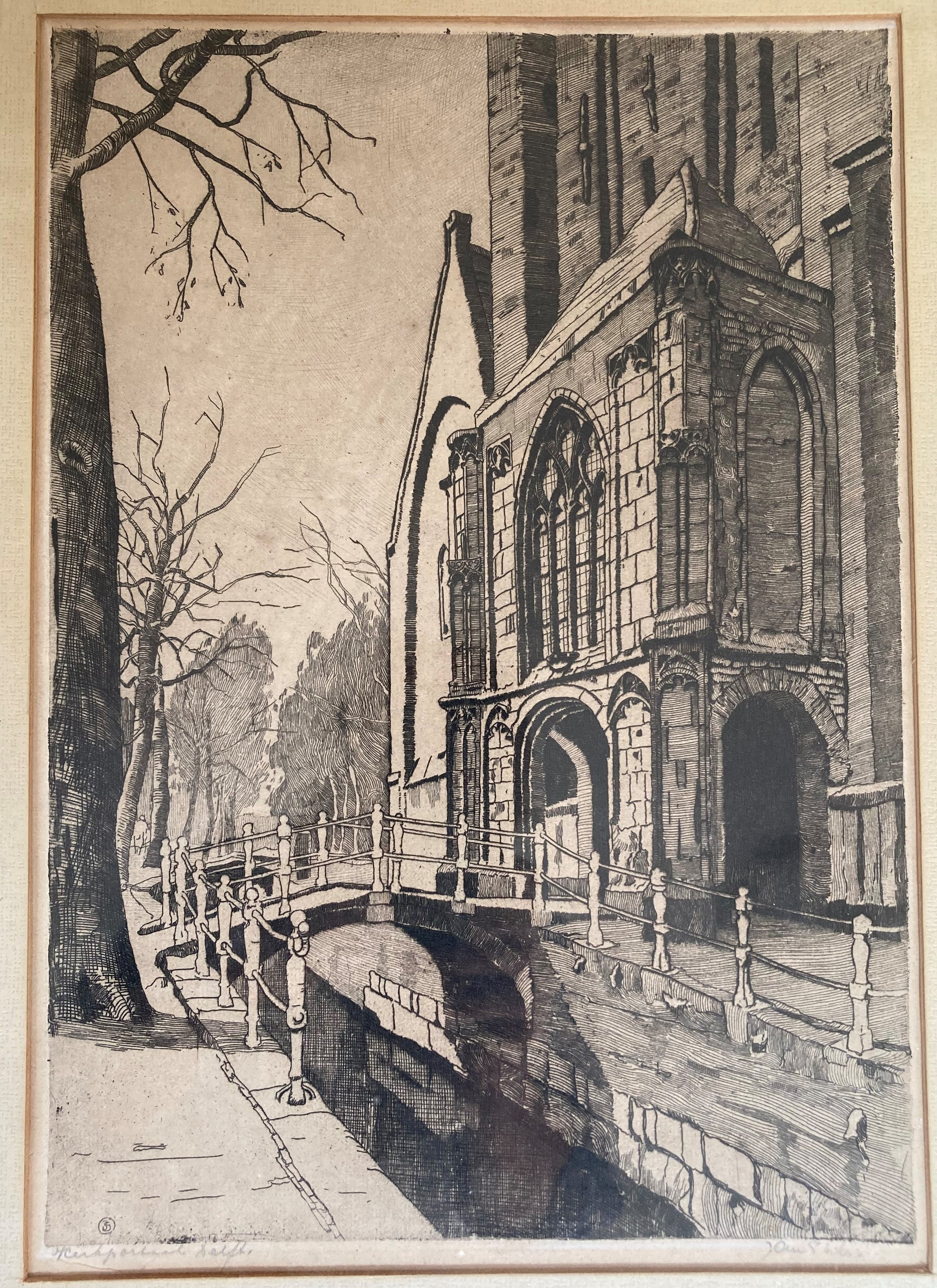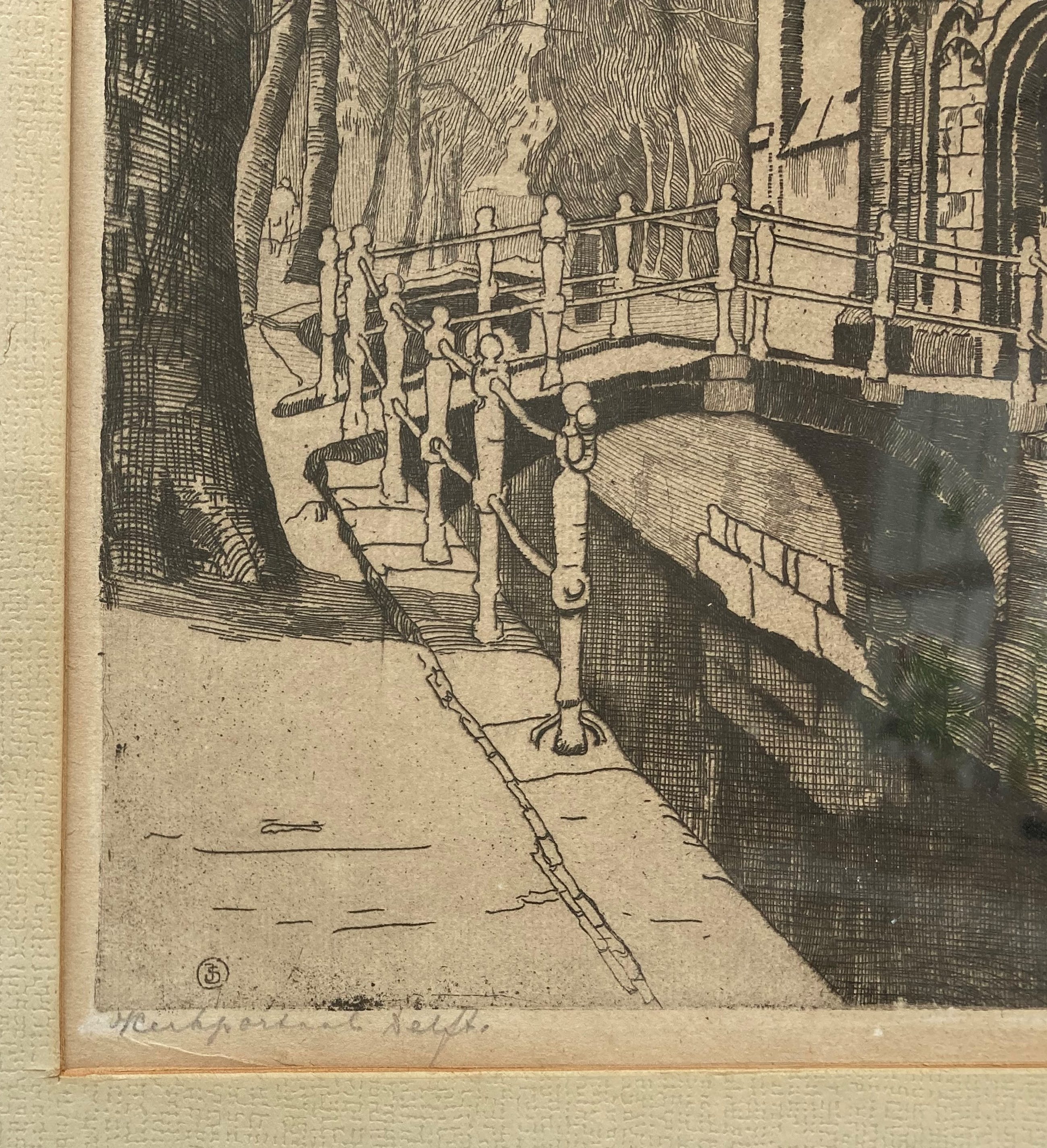 is het stempel van de etser te zien. De titel ‘Kerkportaal Delft’ is in