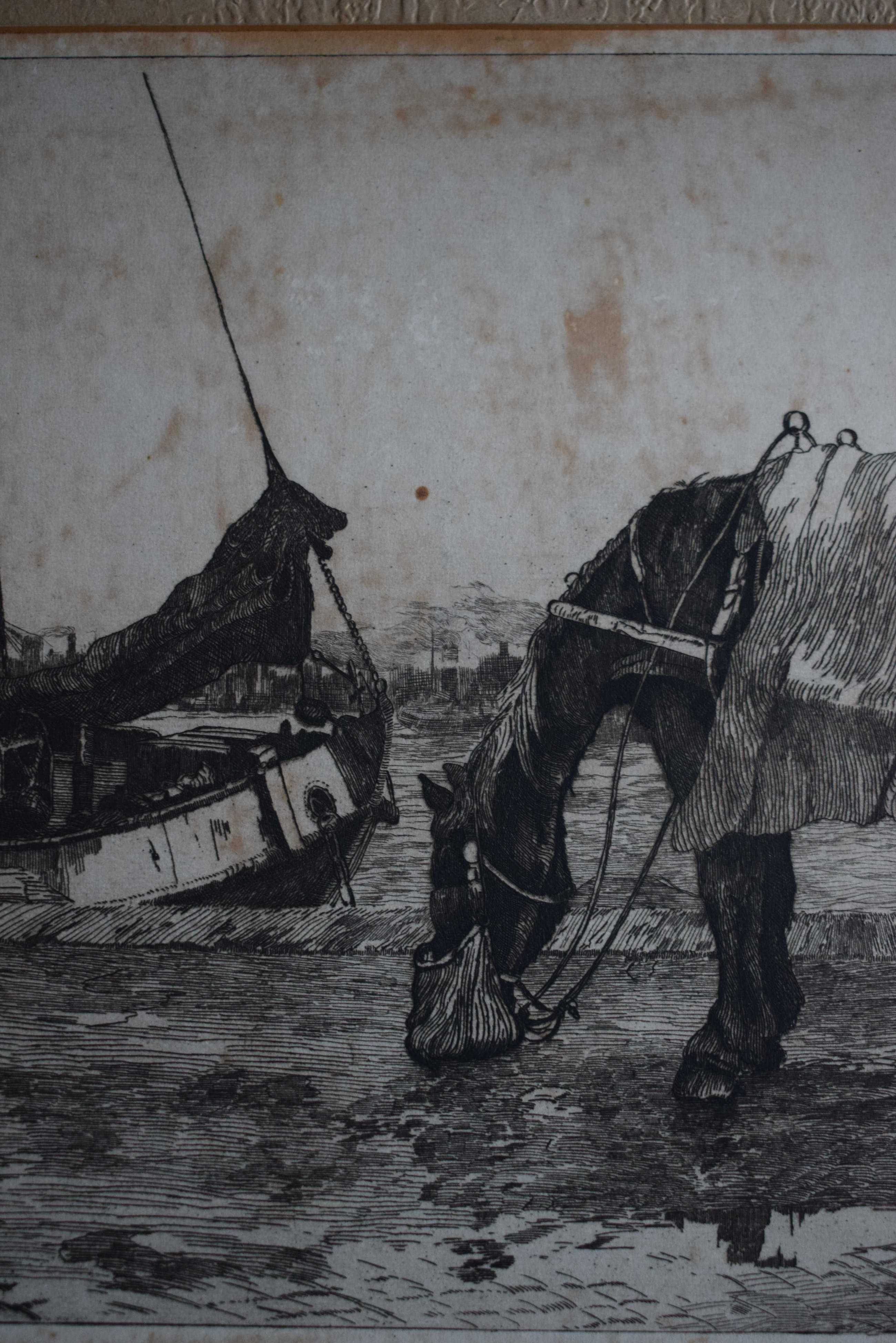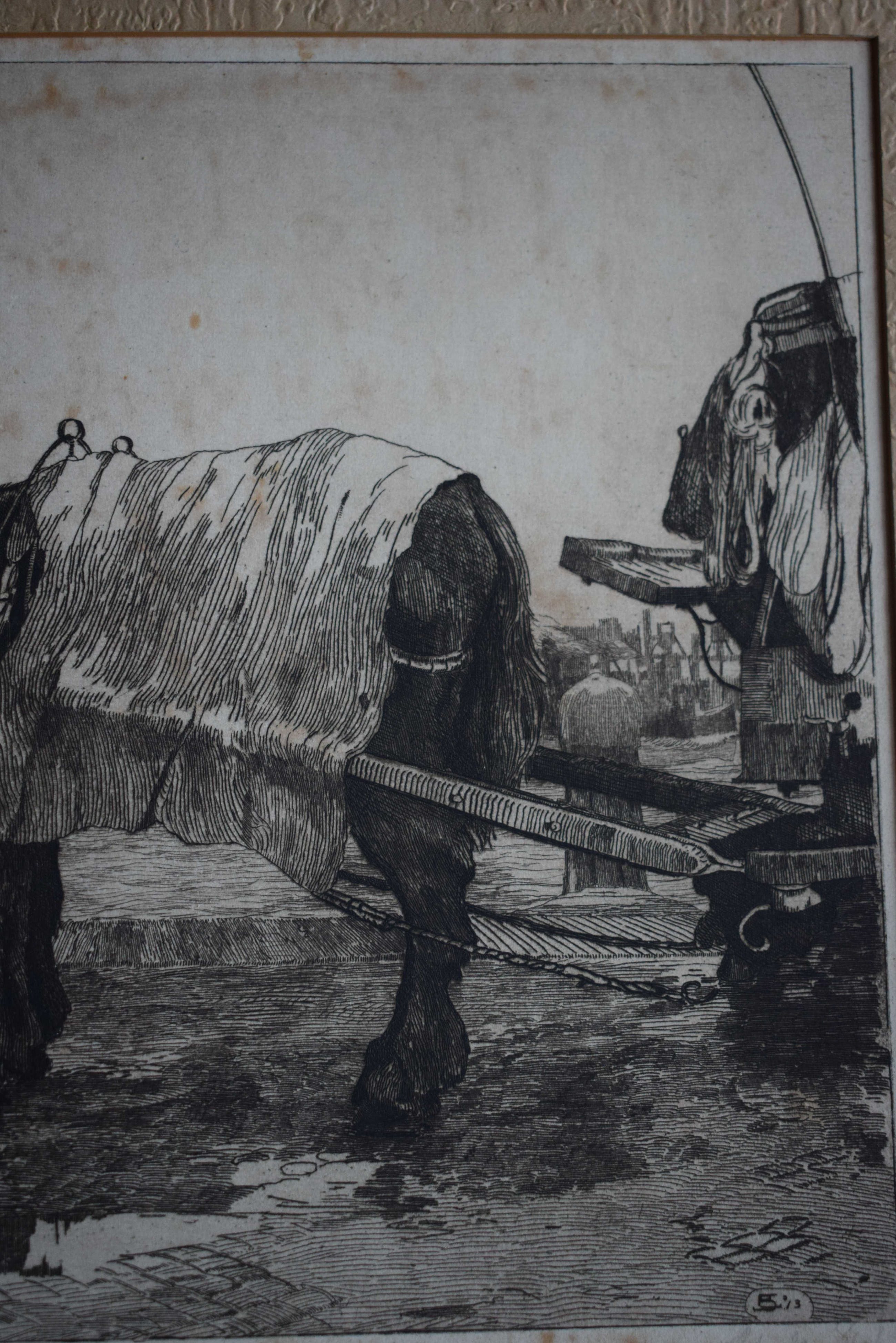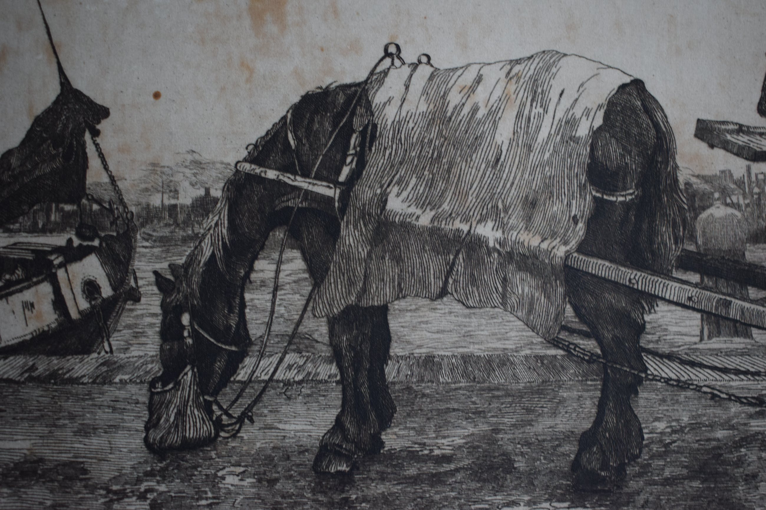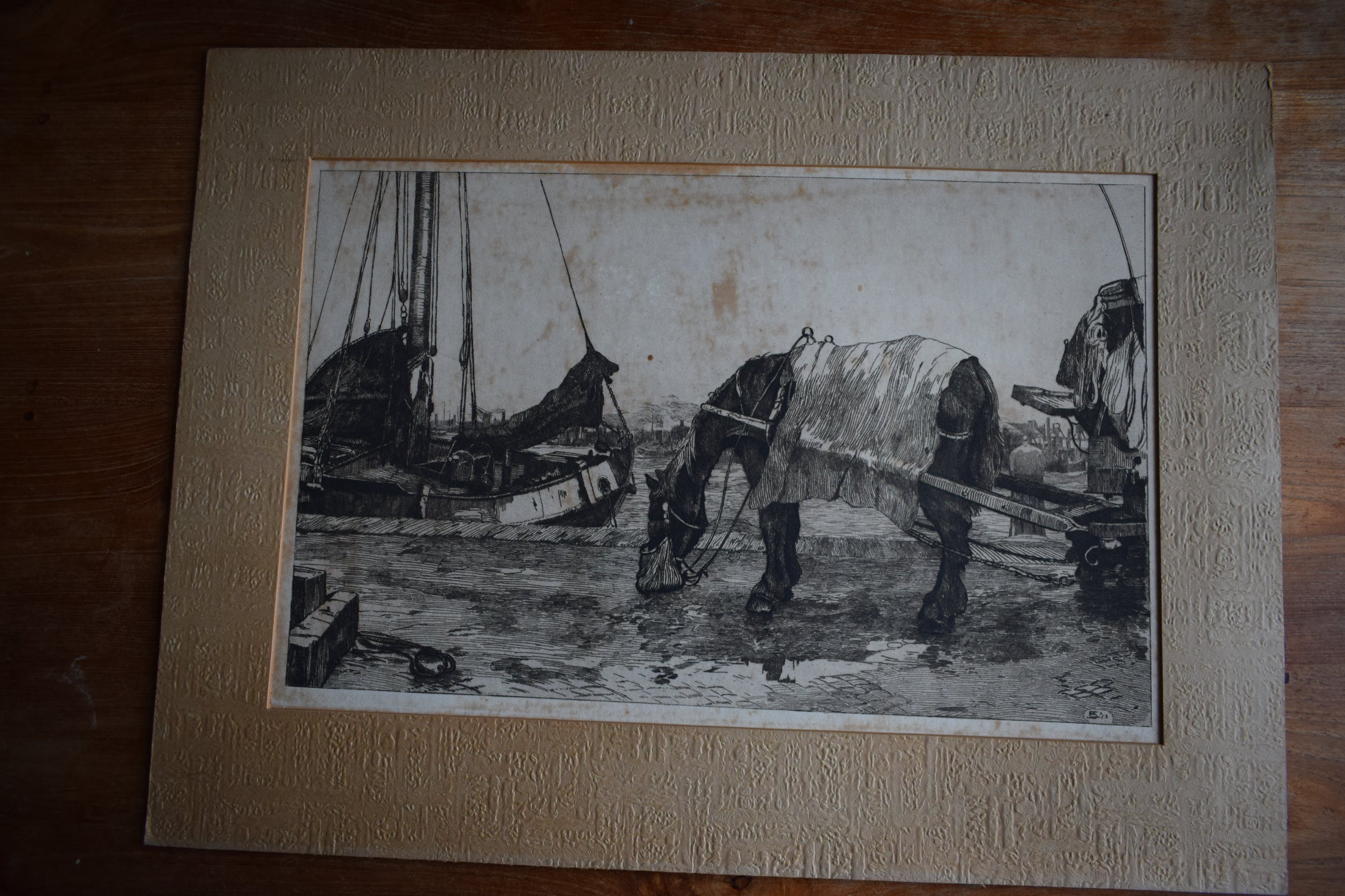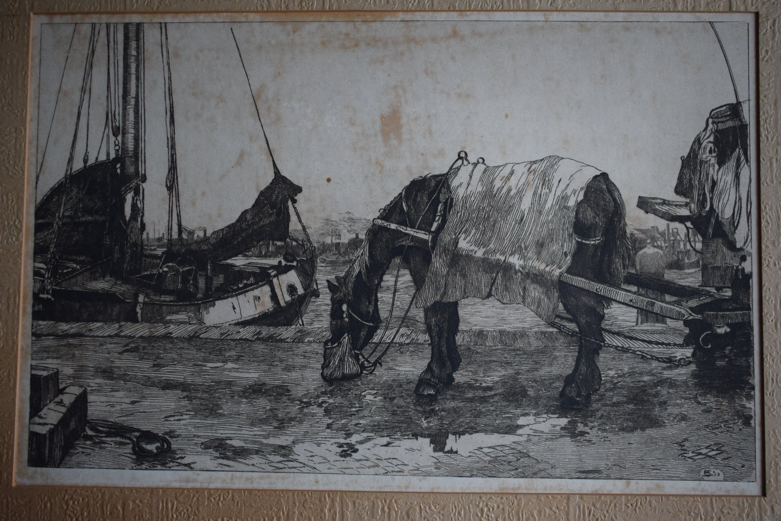 Ets van Jan Sirks, met een paard en wagen op de kade. Paard is geetst met een voederzak, iets wat bij Jan Sirks vrij vaak voorkwam.