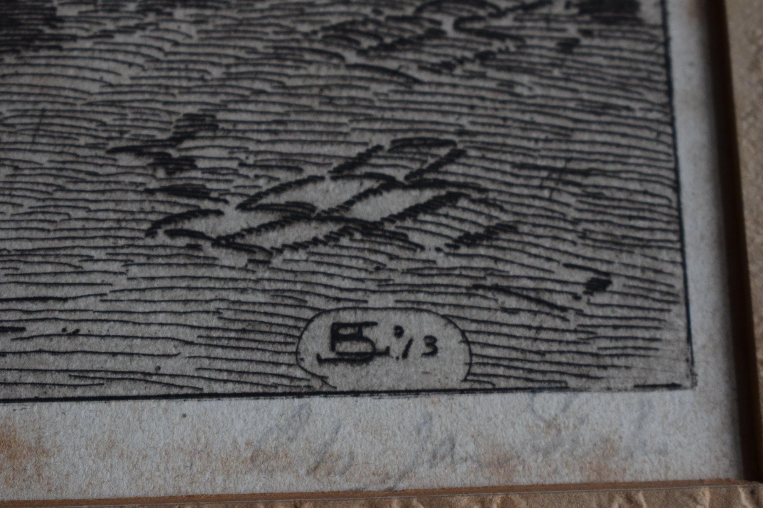Ets zit vast aan de passepartout, papier is vergeeld en heeft last van roest en bruin van het vocht.