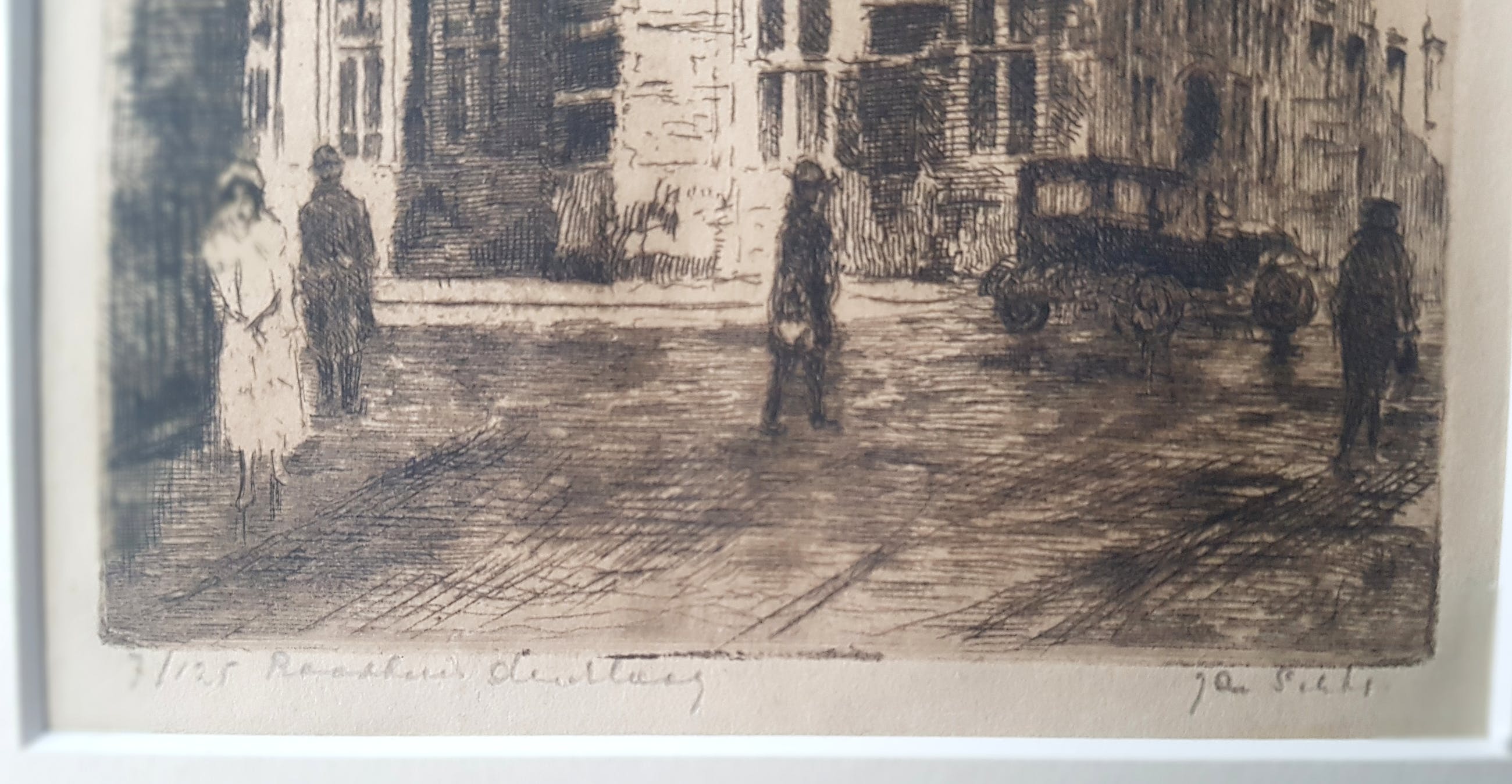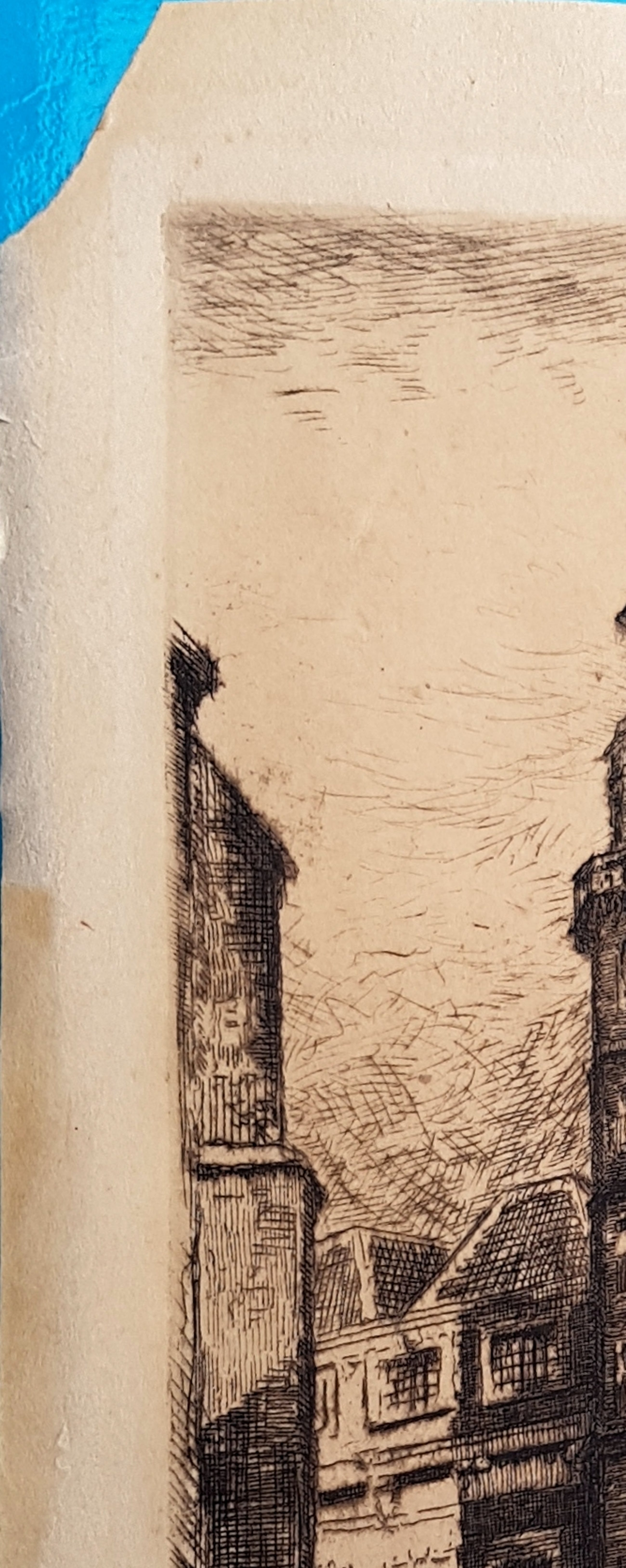Dit etsje maakt reeds vele jaren deel uit van de collectie "Rijnmond Toen" en is indertijd, na aankoop, zorgvuldig schoon en zuurvrij gemaakt. De ets is vrijwel schadevrij (klein afgescheurd hoekje in de marge linksboven, ruim buiten de afbeelding) en kortgeleden gemonteerd in een nieuw, uiteraard zuurvrij, Artique passe-partout, klaar om door de nieuwe collectioneur naar eigen smaak te worden ingelijst.