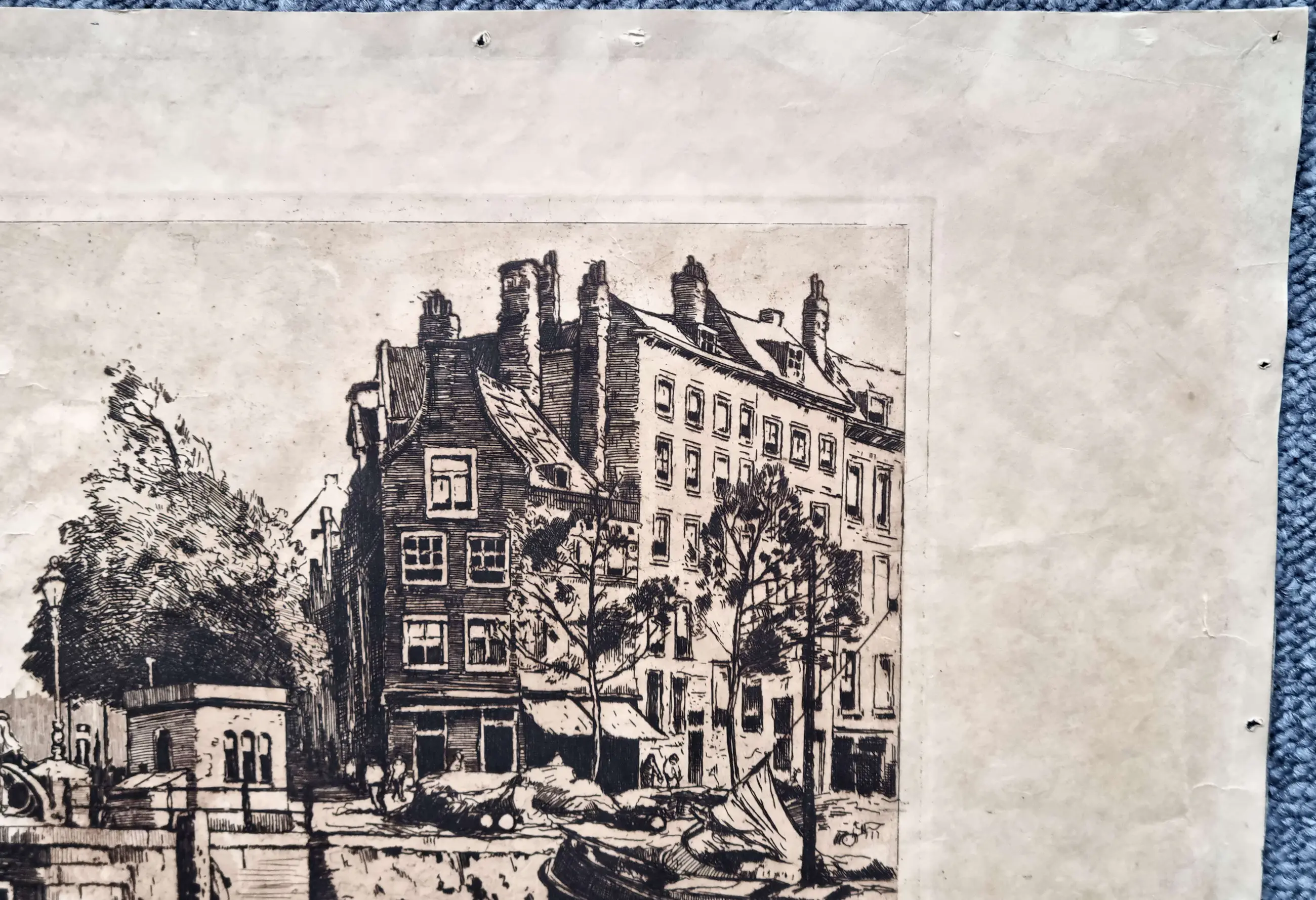 De ets geeft een zicht op het toenmalig deel van het centrum van Rotterdam bij de Oude Haven van voor de 2e Wereldoorlog; de tijd dat de Rotterdamse haven nog in de stad lag.