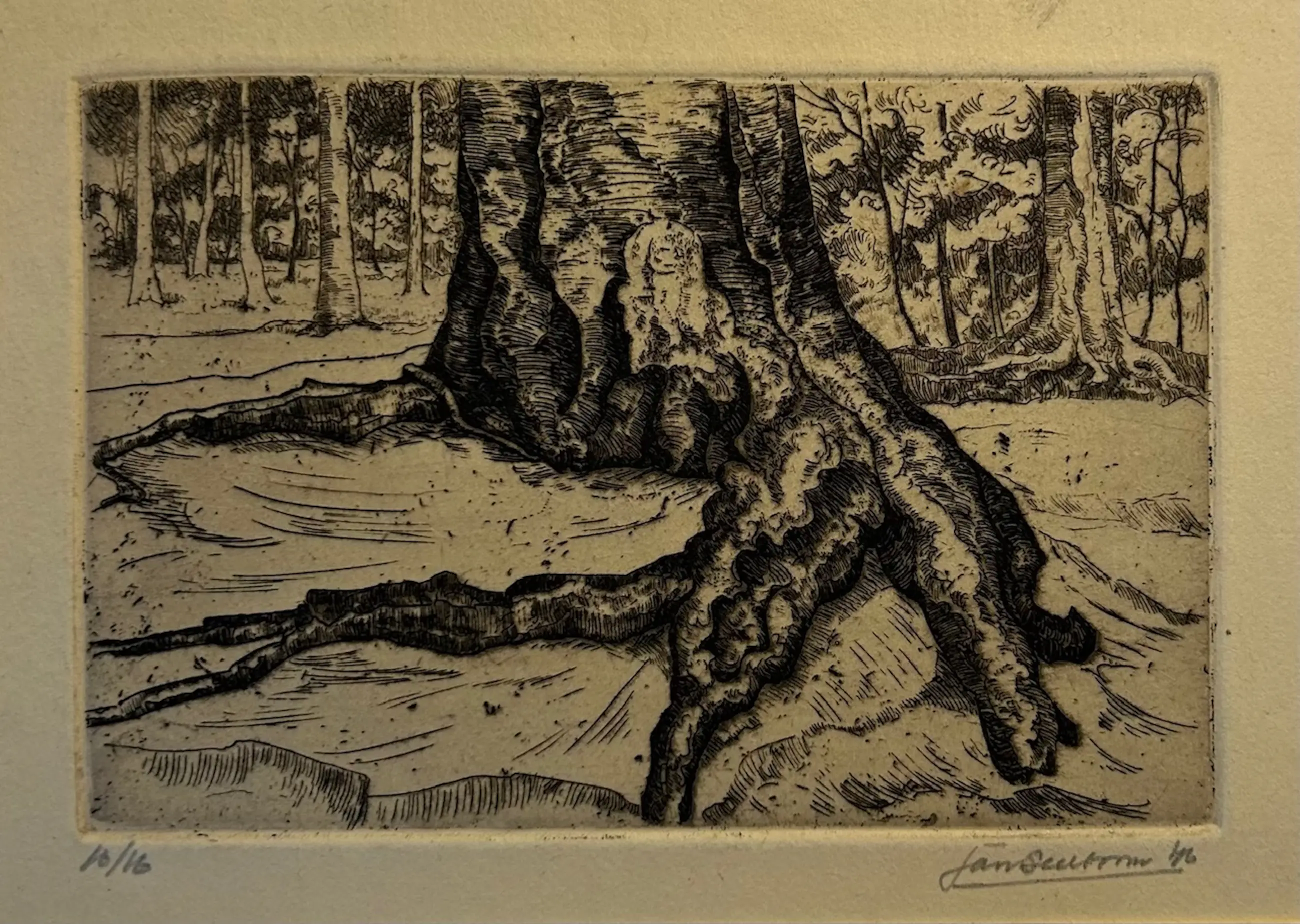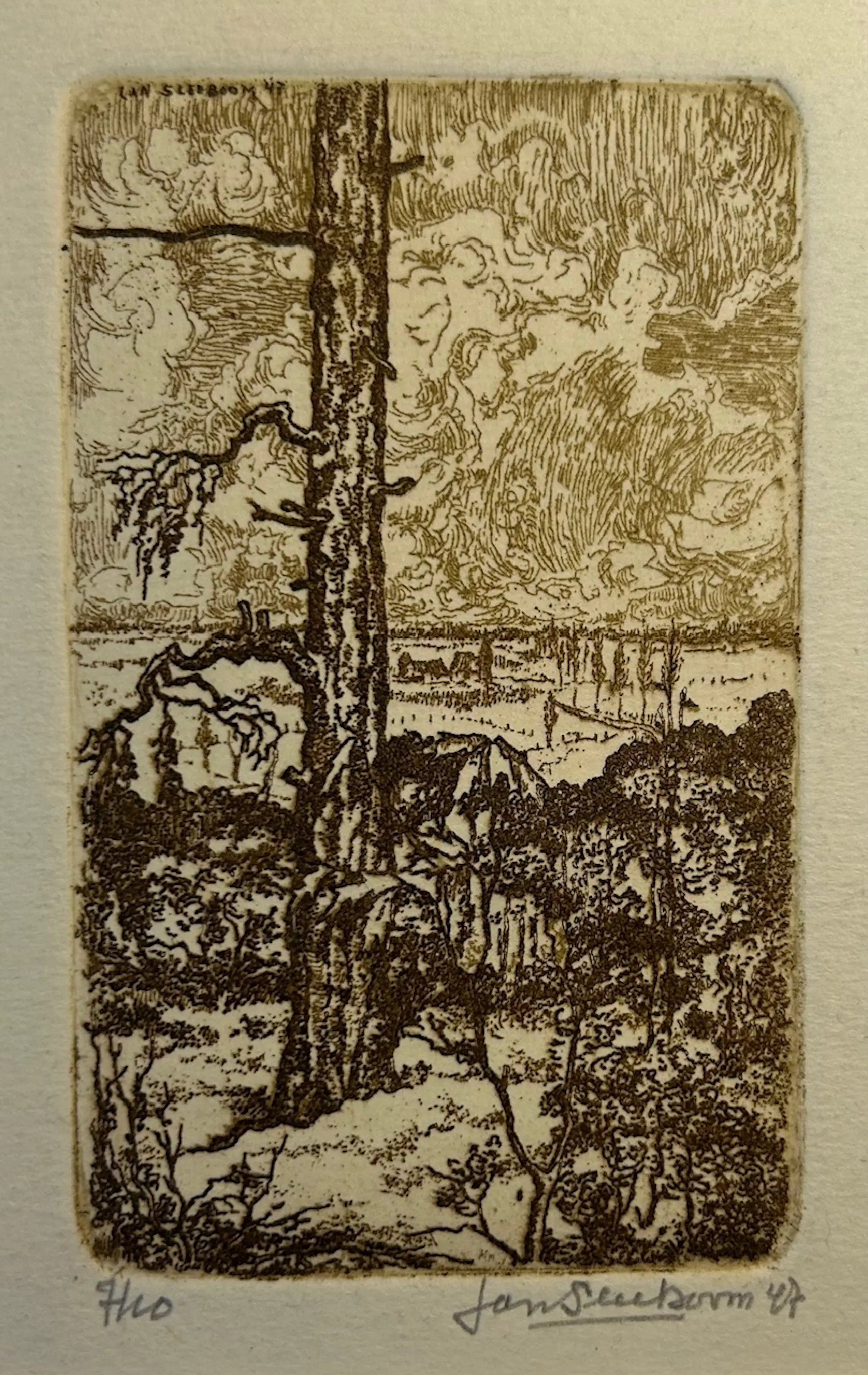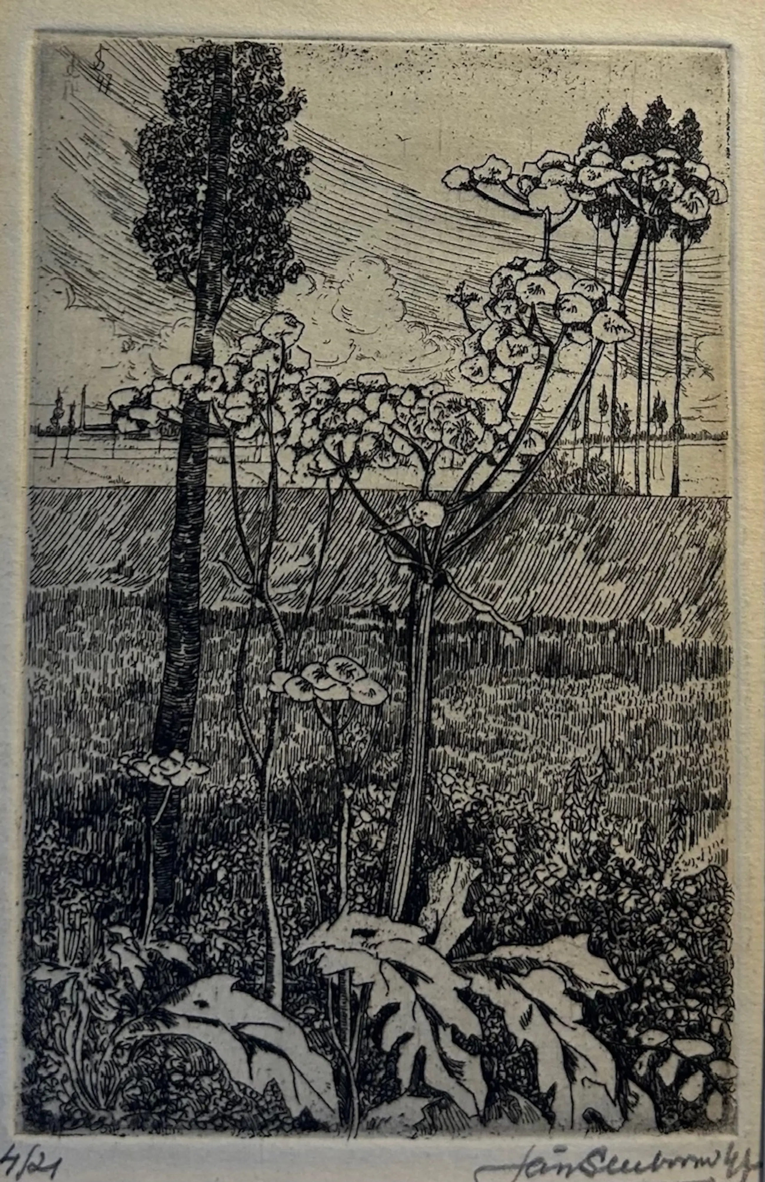 9 etsen van Jan Sleeboom, telkens potloodgesigneerd - Krab. 7,5 bij 11 cm. Drie stuks: nr.2/20; nr. 11/20; nr. 19/20. 1946 - Boom in Landschap. 9,5 bij 6cm. Nr. 7/10exx. 1947 . Bloesem en Boerderij. 7,5 bij 12cm. Nr.2/15exx. 1950 - Hooimijten. 6 bij 9,5 cm. Nr.2/8exx. Ook gesigneerd in de plaat. 1947 - Winter in de Stad (Nijmegen?). 19 bij 14,5cm. Nr.3/15exx. 1950 - Boomwortel. 8 bij 11,5 cm. Nr.10/16 exx. 1946 - Bereklauw. 11,5 bij 7,5cm. Nr.4/21 exx. 1947