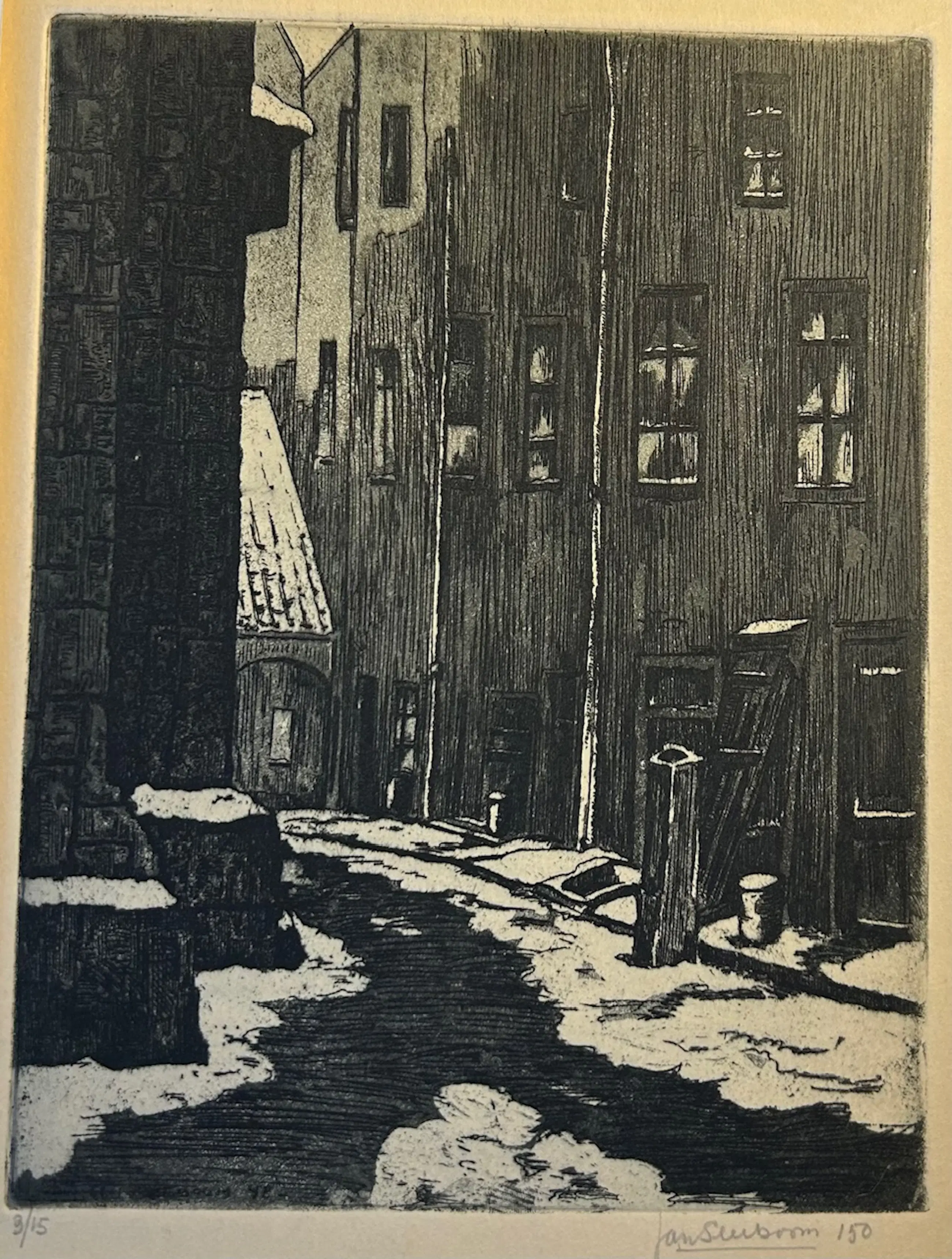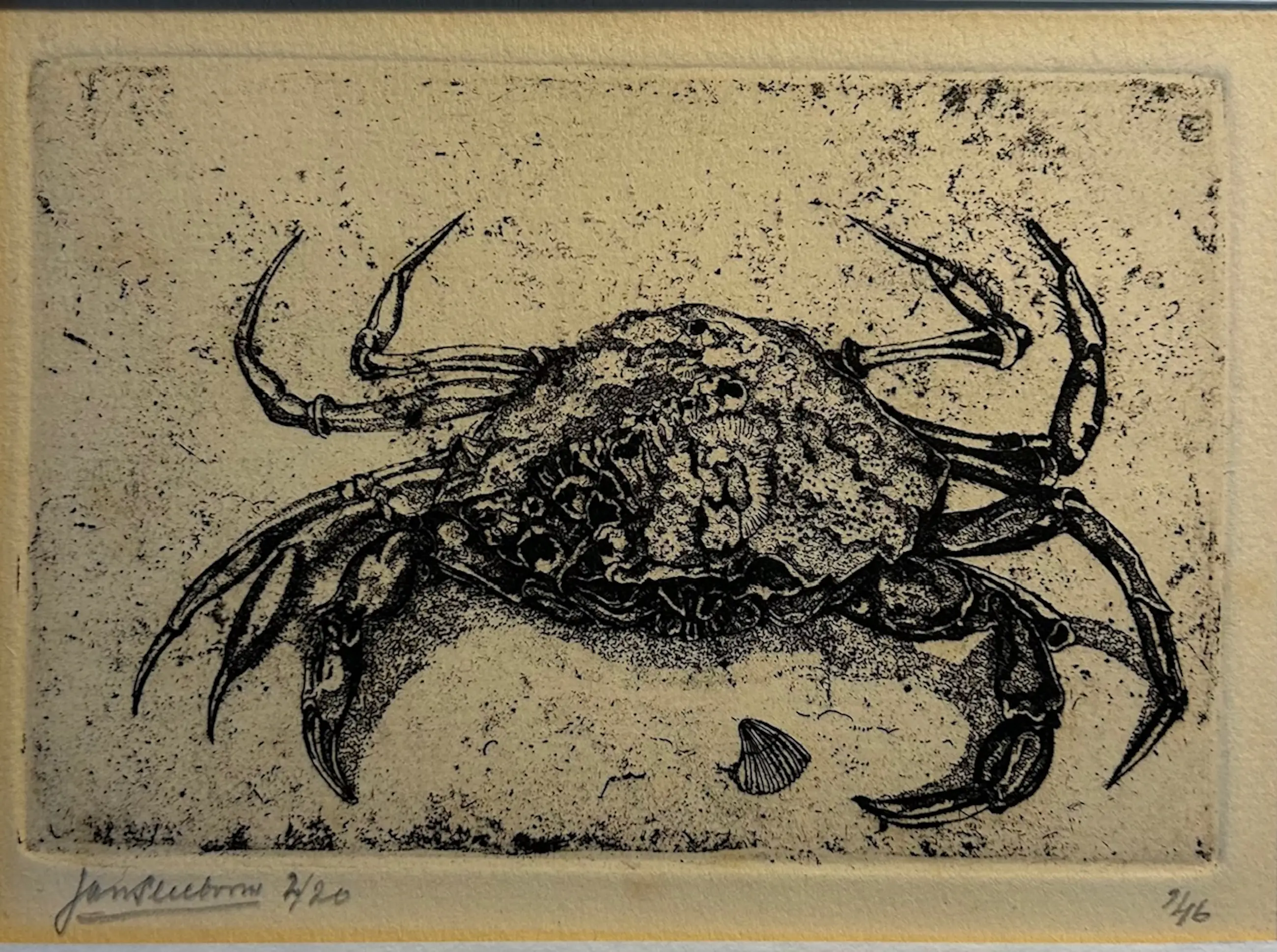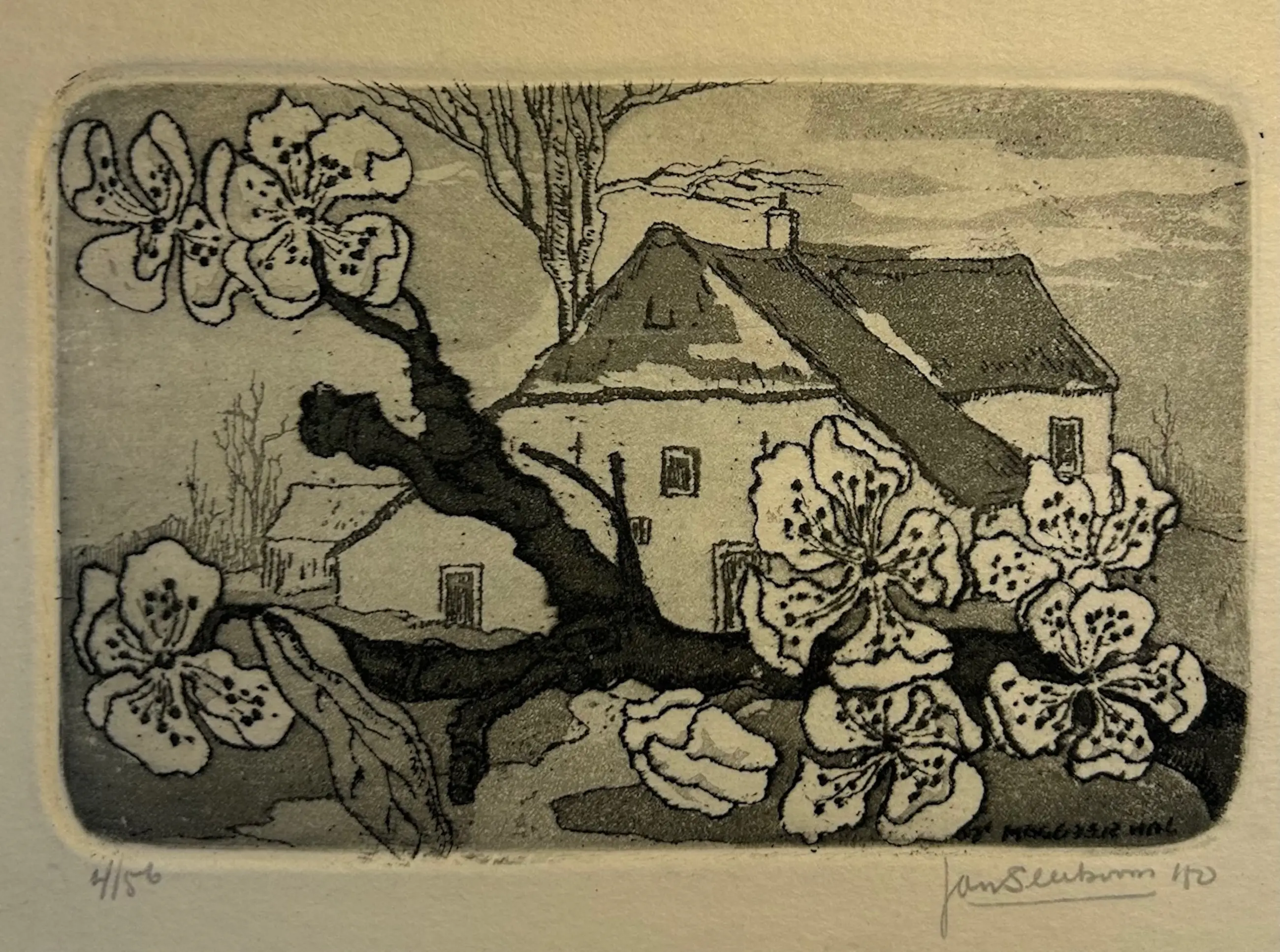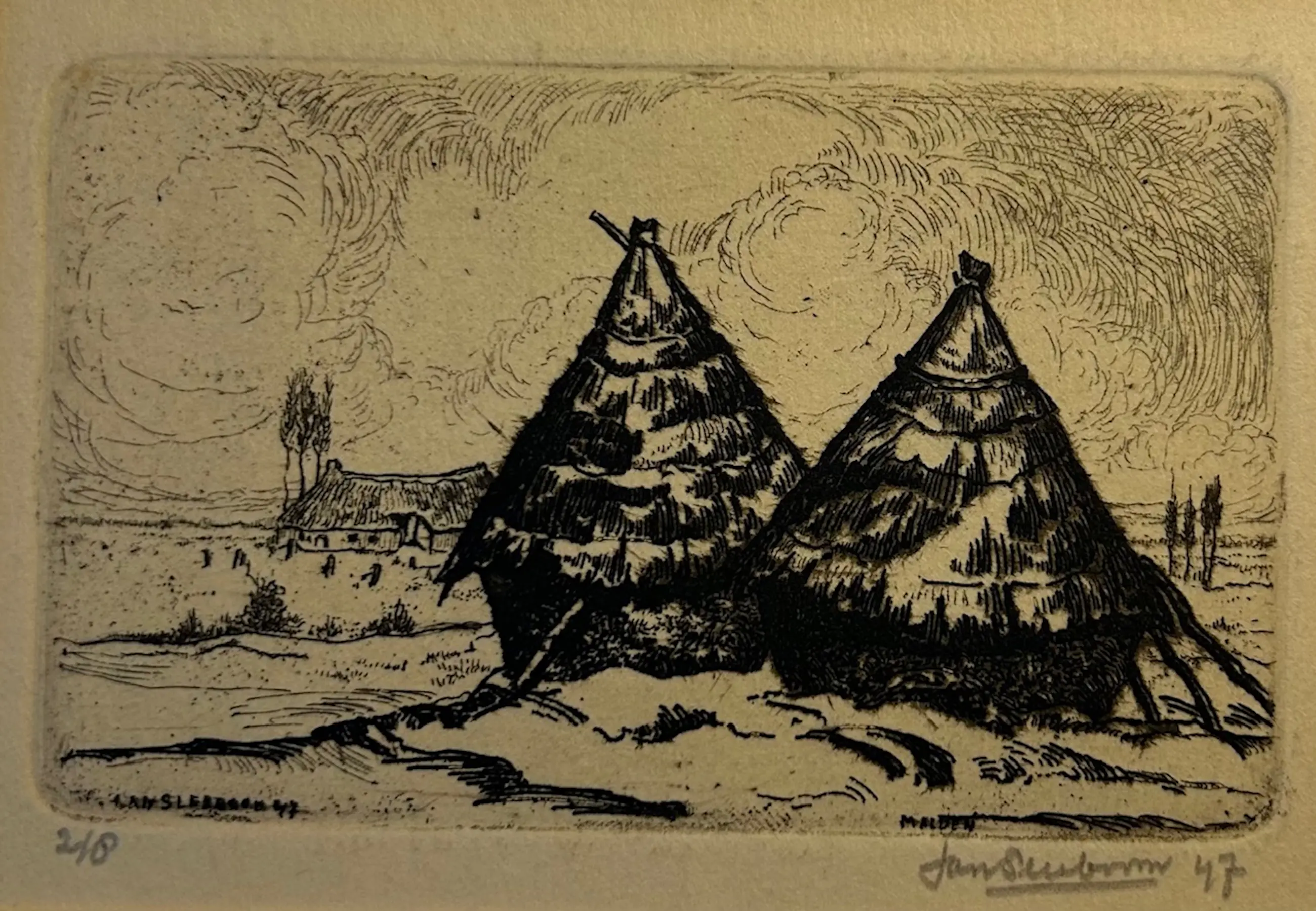 9 etsen van Jan Sleeboom, telkens potloodgesigneerd - Krab. 7,5 bij 11 cm. Drie stuks: nr.2/20; nr. 11/20; nr. 19/20. 1946 - Boom in Landschap. 9,5 bij 6cm. Nr. 7/10exx. 1947 . Bloesem en Boerderij. 7,5 bij 12cm. Nr.2/15exx. 1950 - Hooimijten. 6 bij 9,5 cm. Nr.2/8exx. Ook gesigneerd in de plaat. 1947 - Winter in de Stad (Nijmegen?). 19 bij 14,5cm. Nr.3/15exx. 1950 - Boomwortel. 8 bij 11,5 cm. Nr.10/16 exx. 1946 - Bereklauw. 11,5 bij 7,5cm. Nr.4/21 exx. 1947
