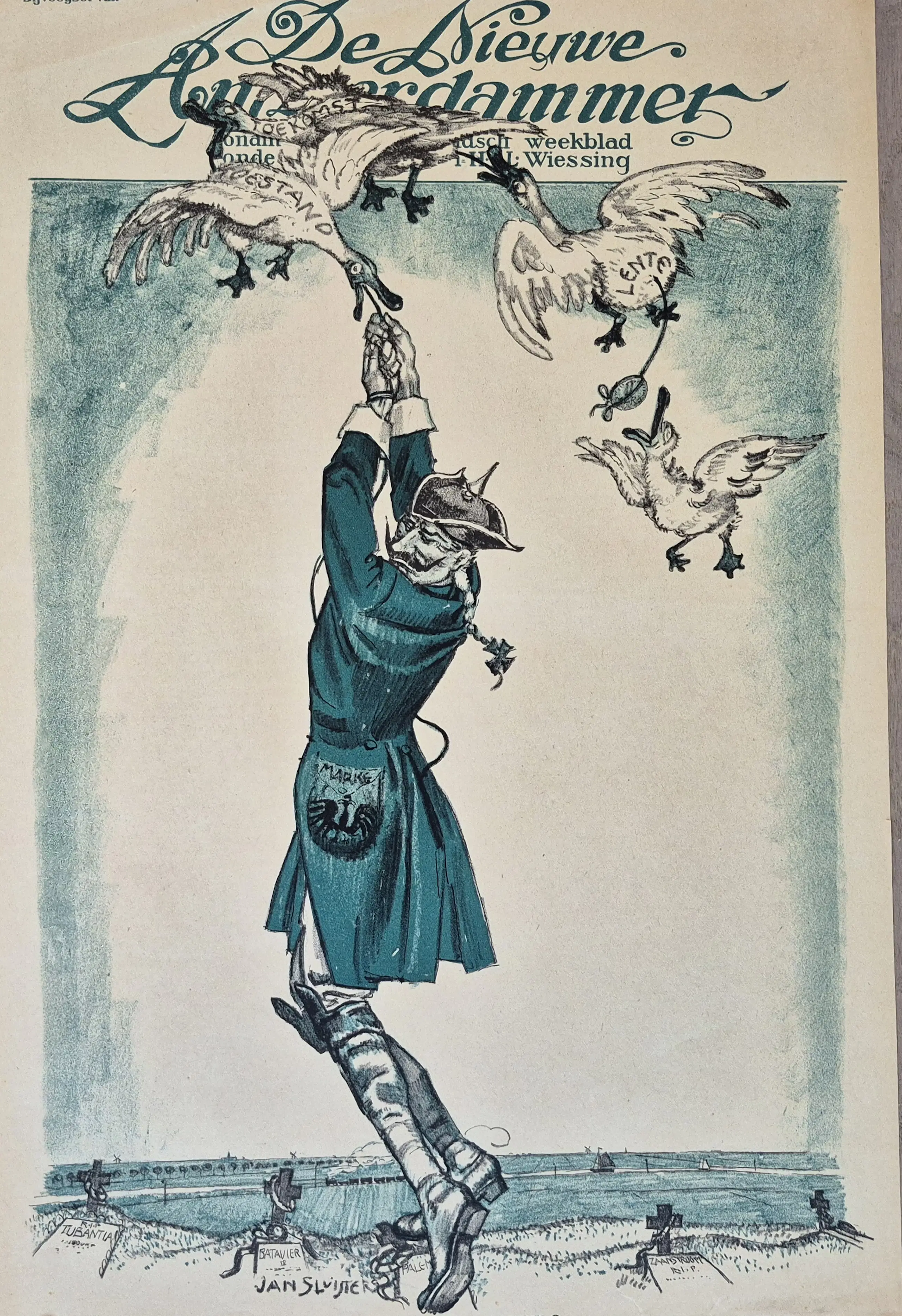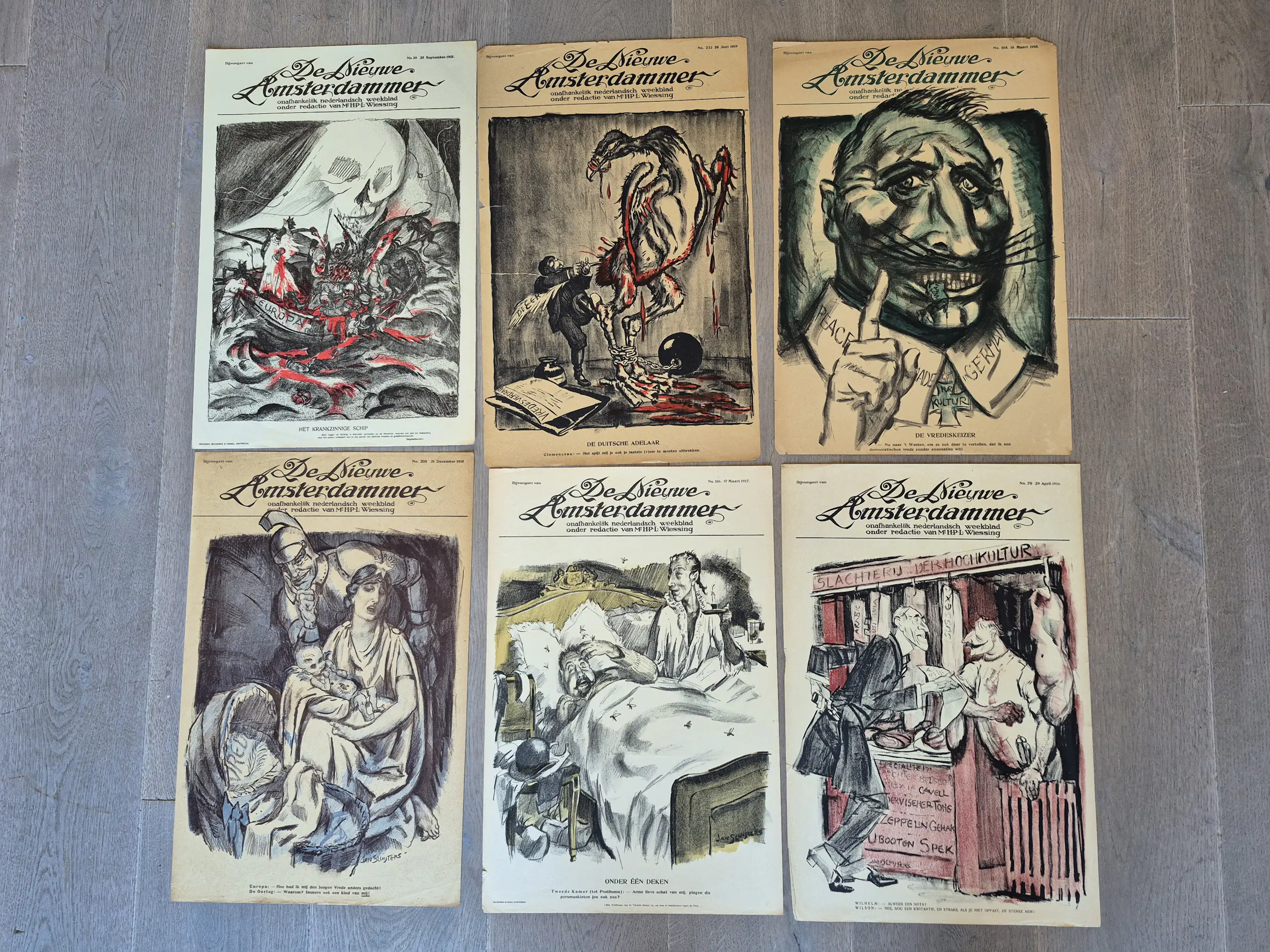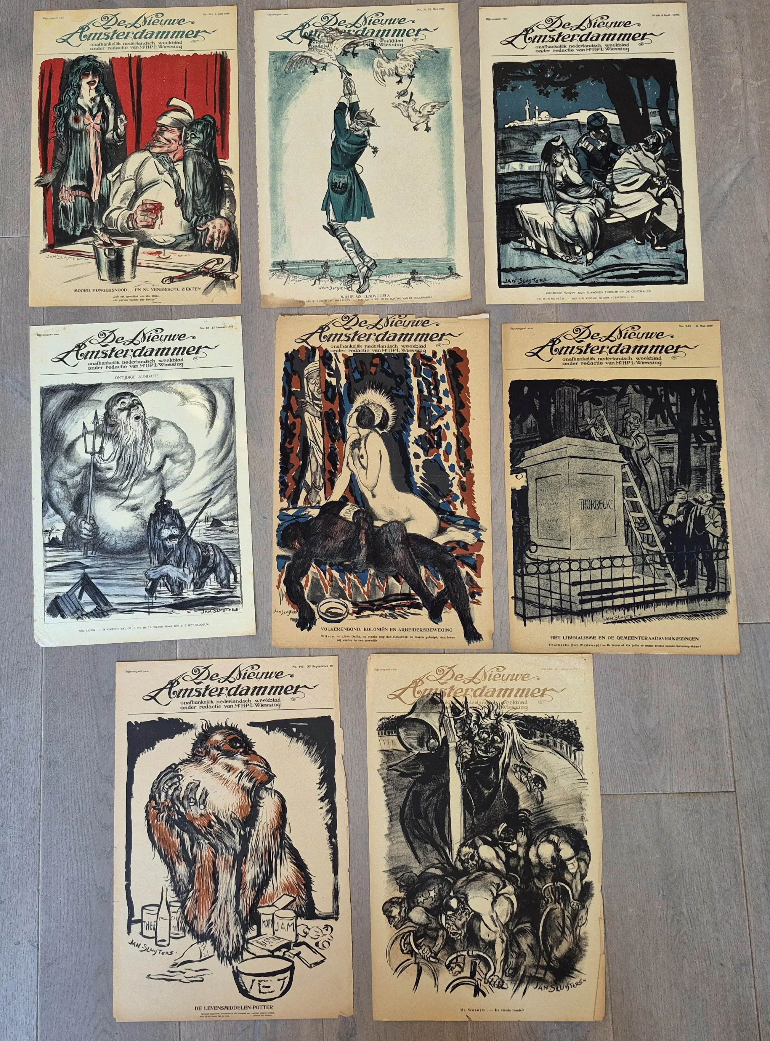 14 politieke spotprenten uitgegeven als bijvoegsels bij De Nieuwe Amsterdammer en gemaakt door Jan Sluijters. Achterkant blanco. Elke week stond een grote spotprent op de voorpagina van de bijlage. Allen gesigneerd in de druk. Foto's zijn onderdeel van de omschrijving.