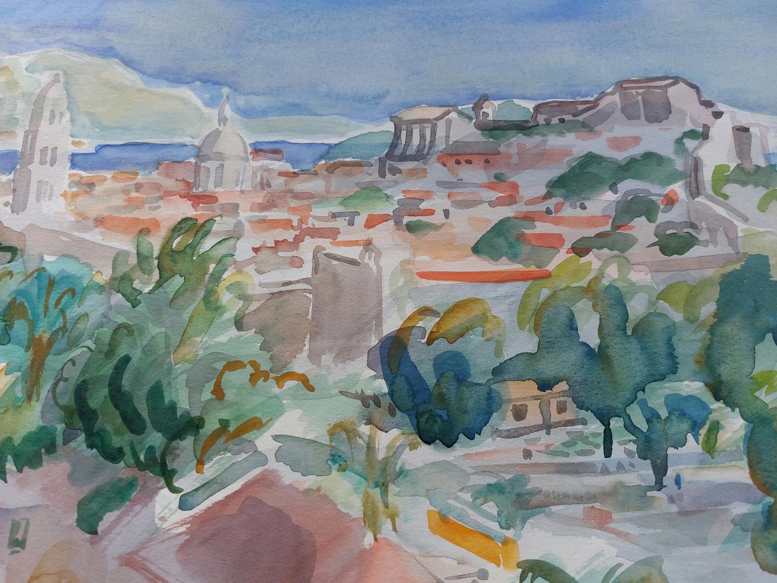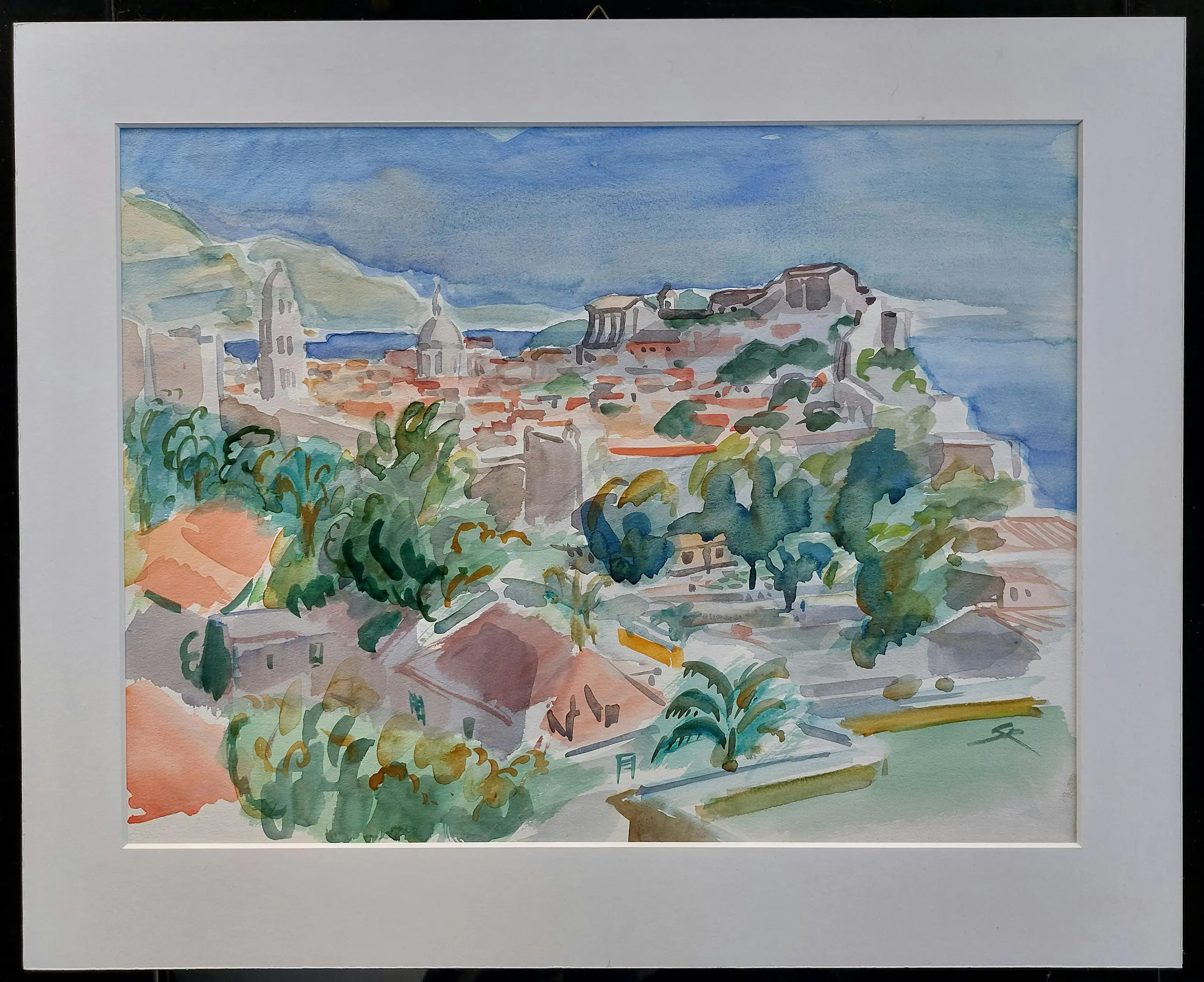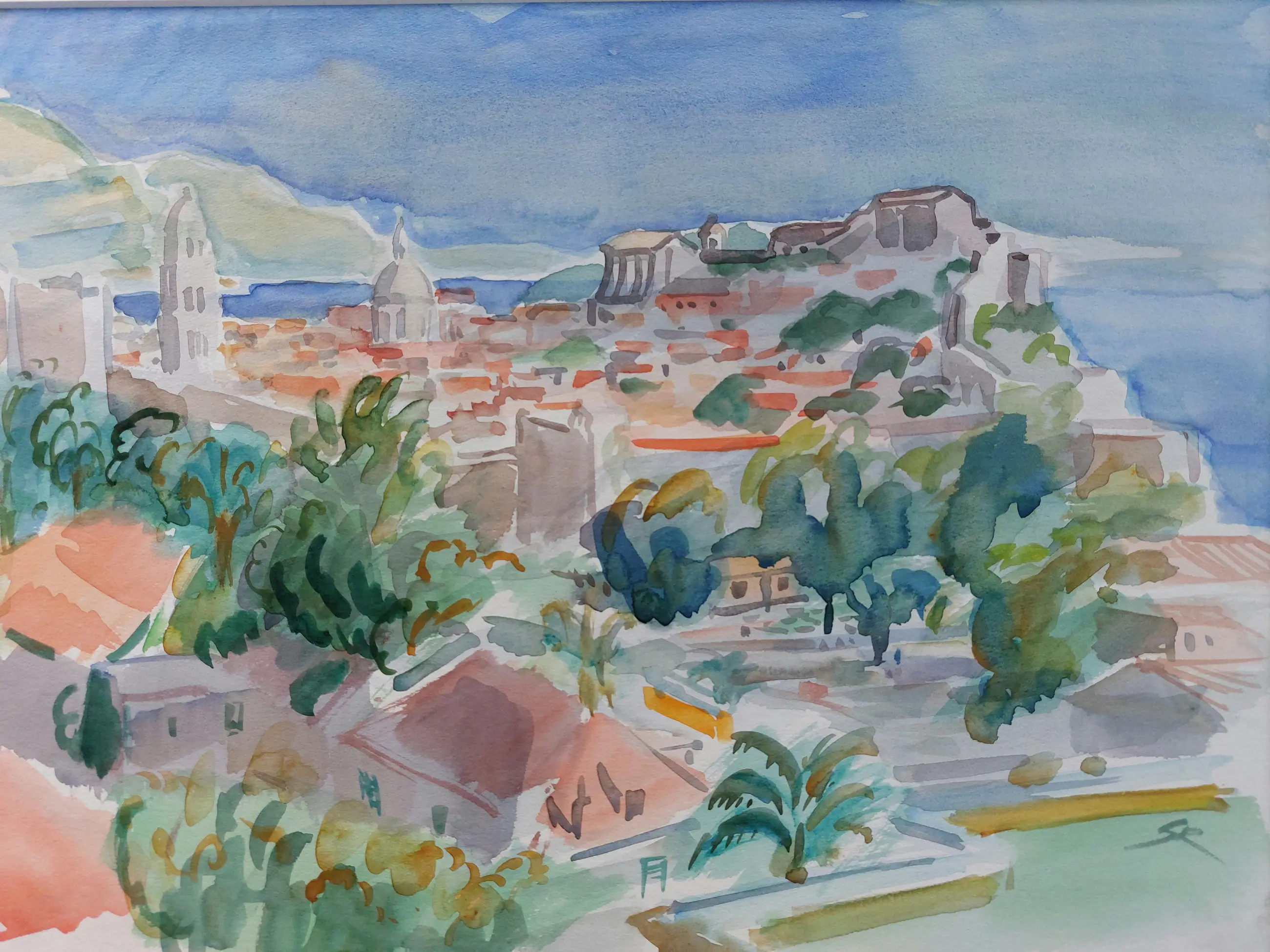 Fraaie aquarel van Jan Sluijters Jr. Stadsgezicht aan de middellandse zee met gebouwen uit de Grieks/Romeinse tijd. Handgesigneerd met monogram rechtsonder. In net passepartout van lijstenmakerij Artista te Hilversum.
