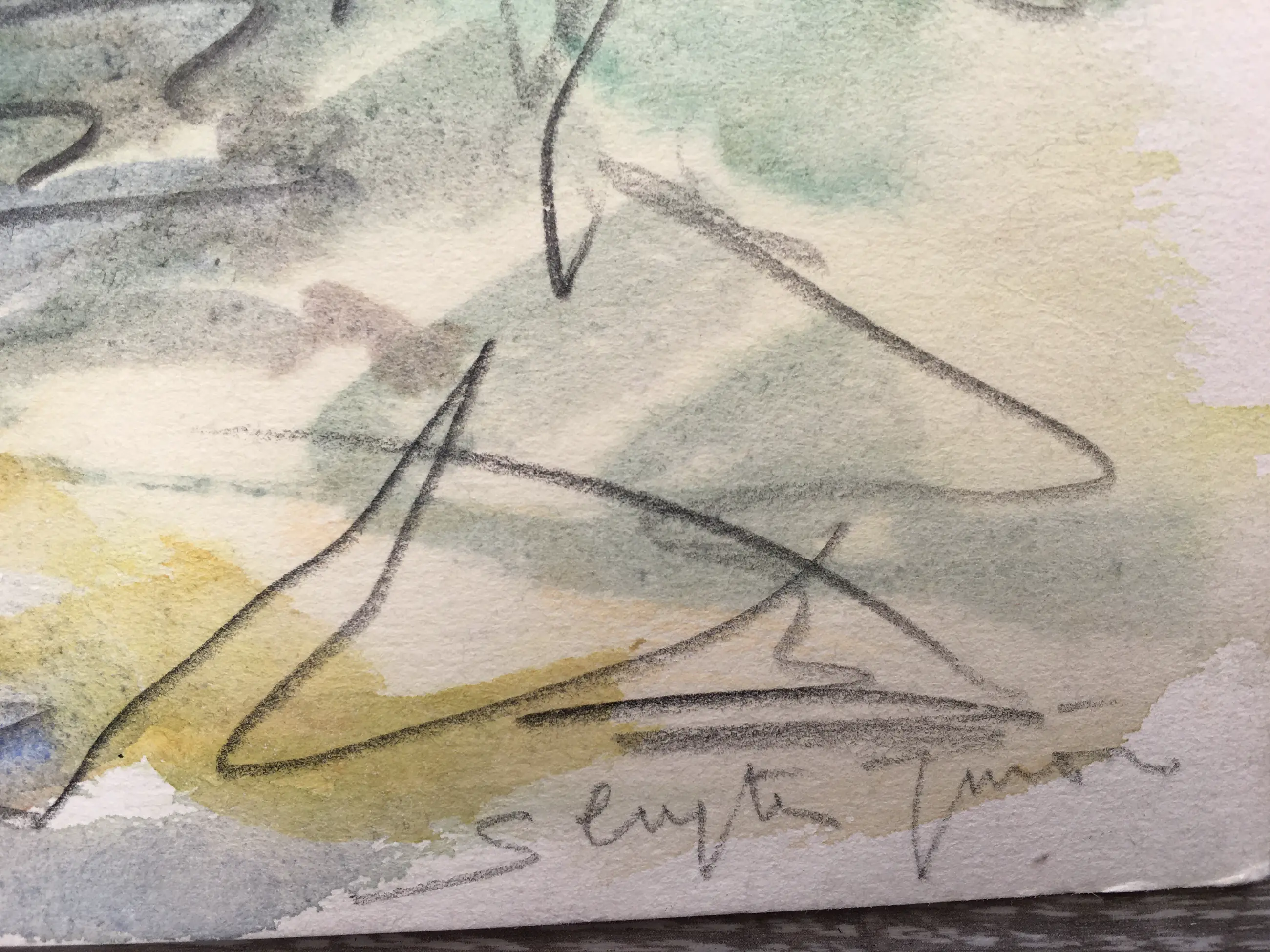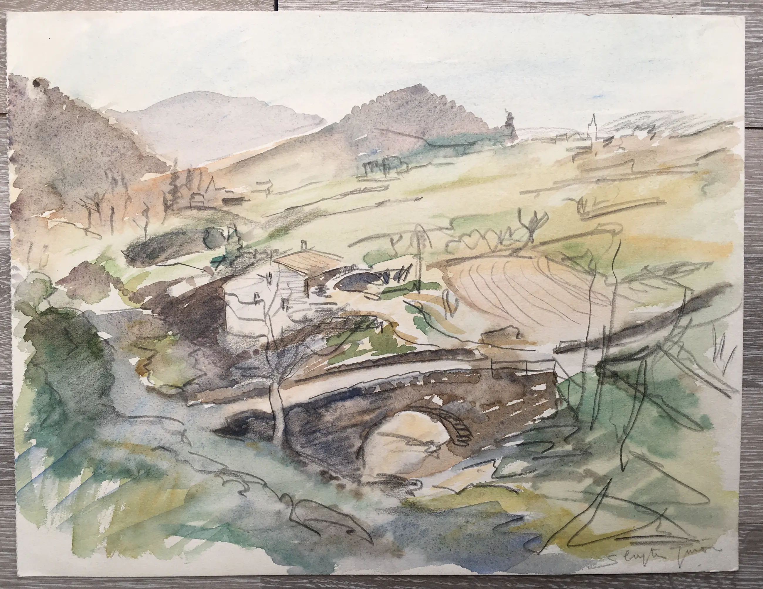 Berglandschap met brug en beekje. Aquarel en potlood.