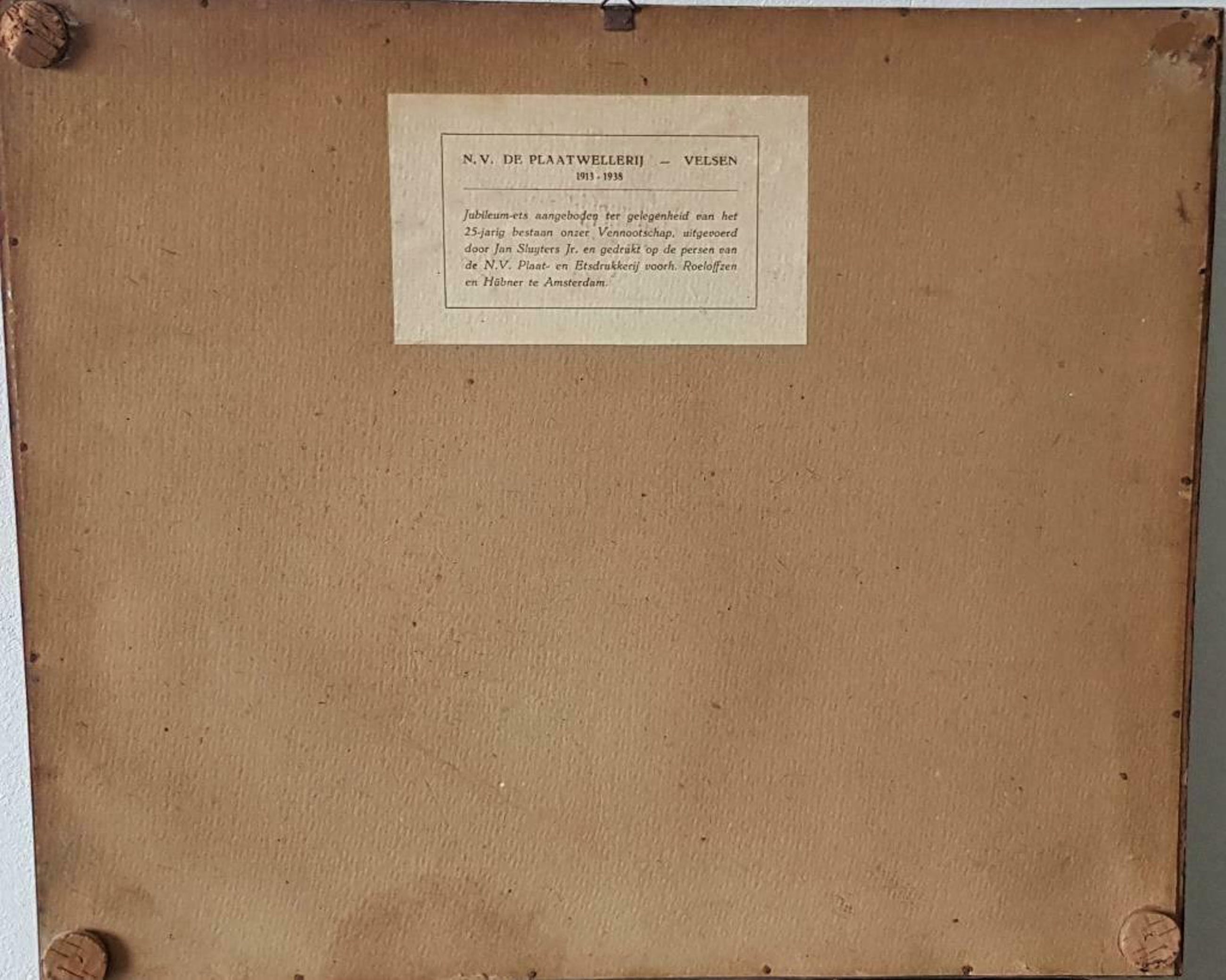 De Plaatwellerij, Velzen – ets – gesigneerd – 1938 Jubileum-ets, uitgegeven in 1938, ter gelegenheid van het 25-jarig bestaan van de N.V. De Plaatwellerij, Velzen (1913-1938) gemaakt door de Nederlandse kunstenaar Jan Sluyters Jr. en gedrukt op de persen van de N.V. Plaat- en Etsdrukkerij voorheen Roeloffzen en Hübner te Amsterdam.
