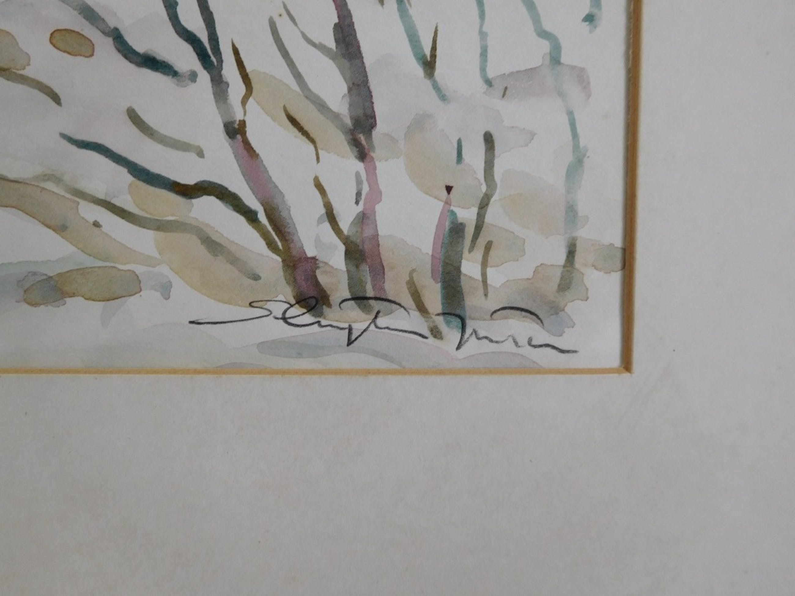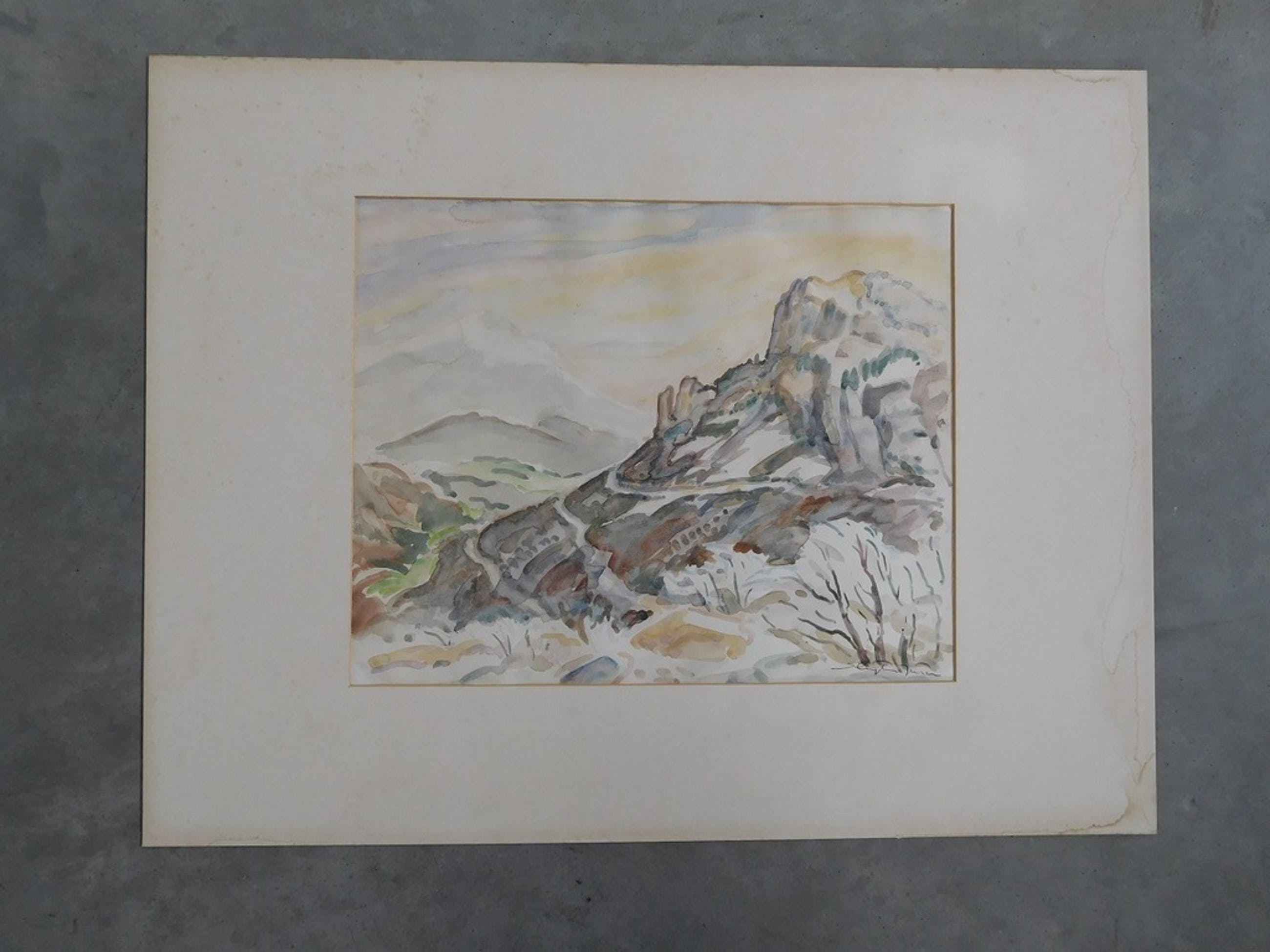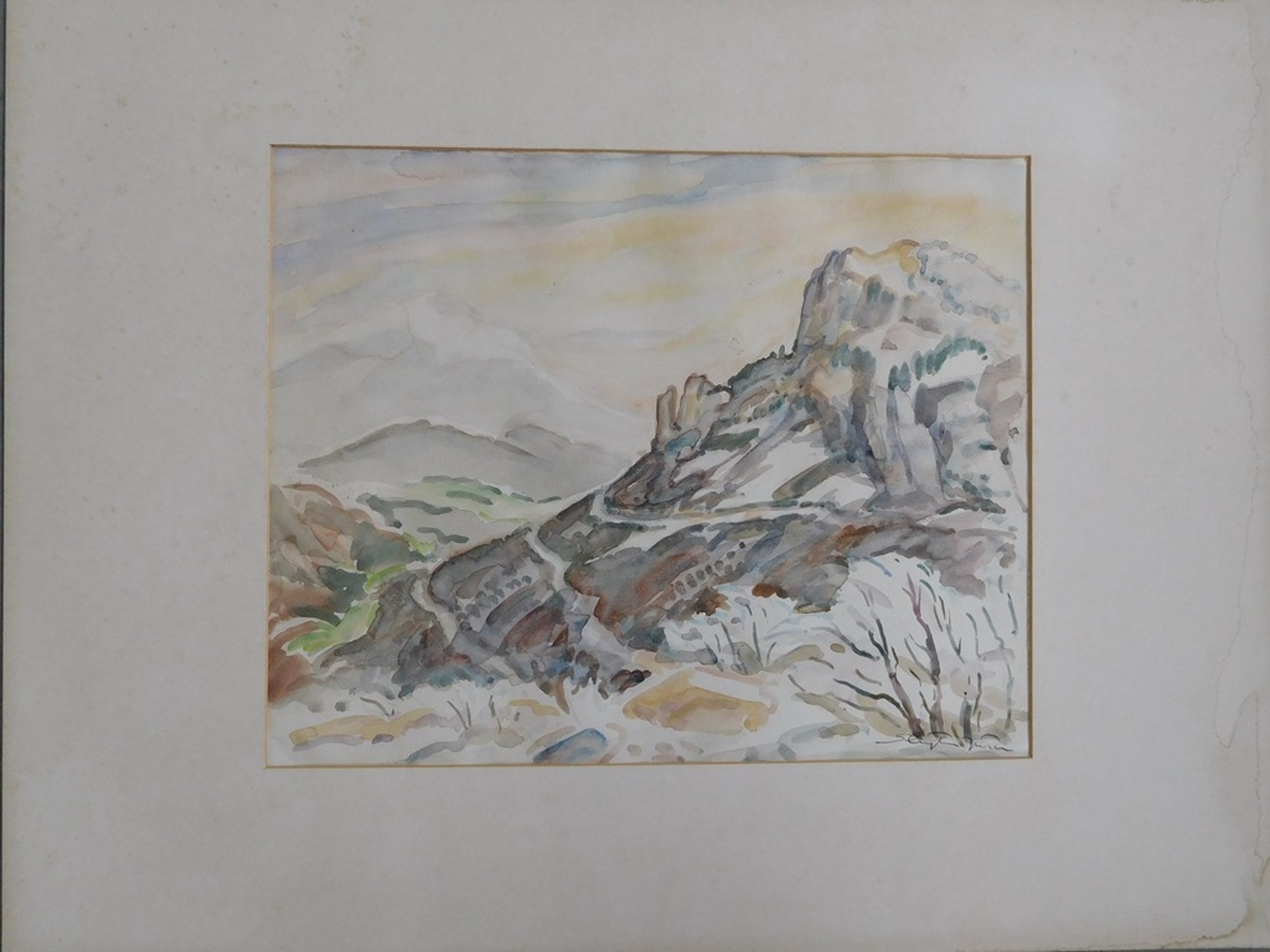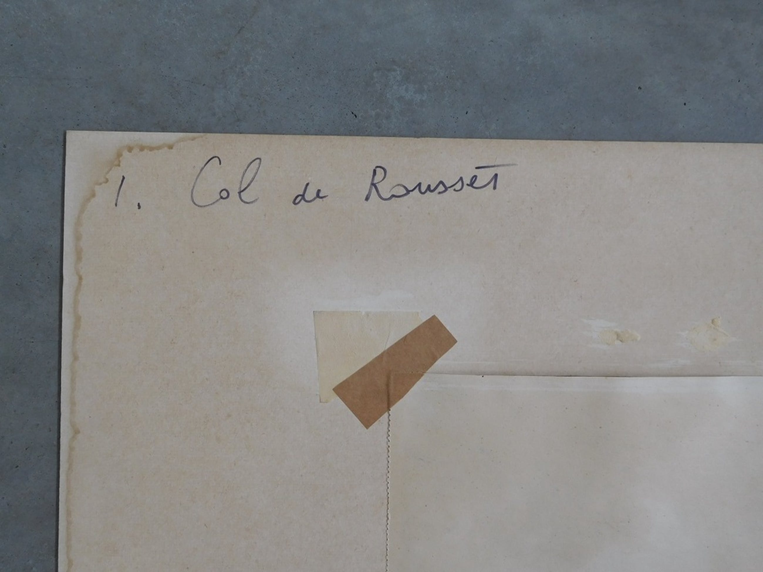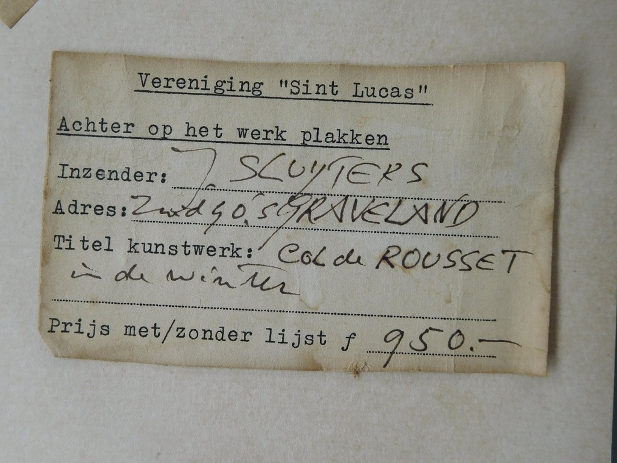 Aquarel met als titel "Col de Rousset in de winter" van Jan Sluijters Junior (1914-2005). Het werk op papier meet 40 x 32 cm. Het is met kleine stukjes tape vastgezet in een (vergeeld) passe partout. Op de achterzijde van dat passe partout is tevens de signatuur van Sluijters te vinden als mede de titel. Er is ook een sticker aanwezig van Vereniging "Sint Lucas", waar Sluijters lid van was. Hierop staat het adres van de kunstenaar, de titel en de prijs van het werk.